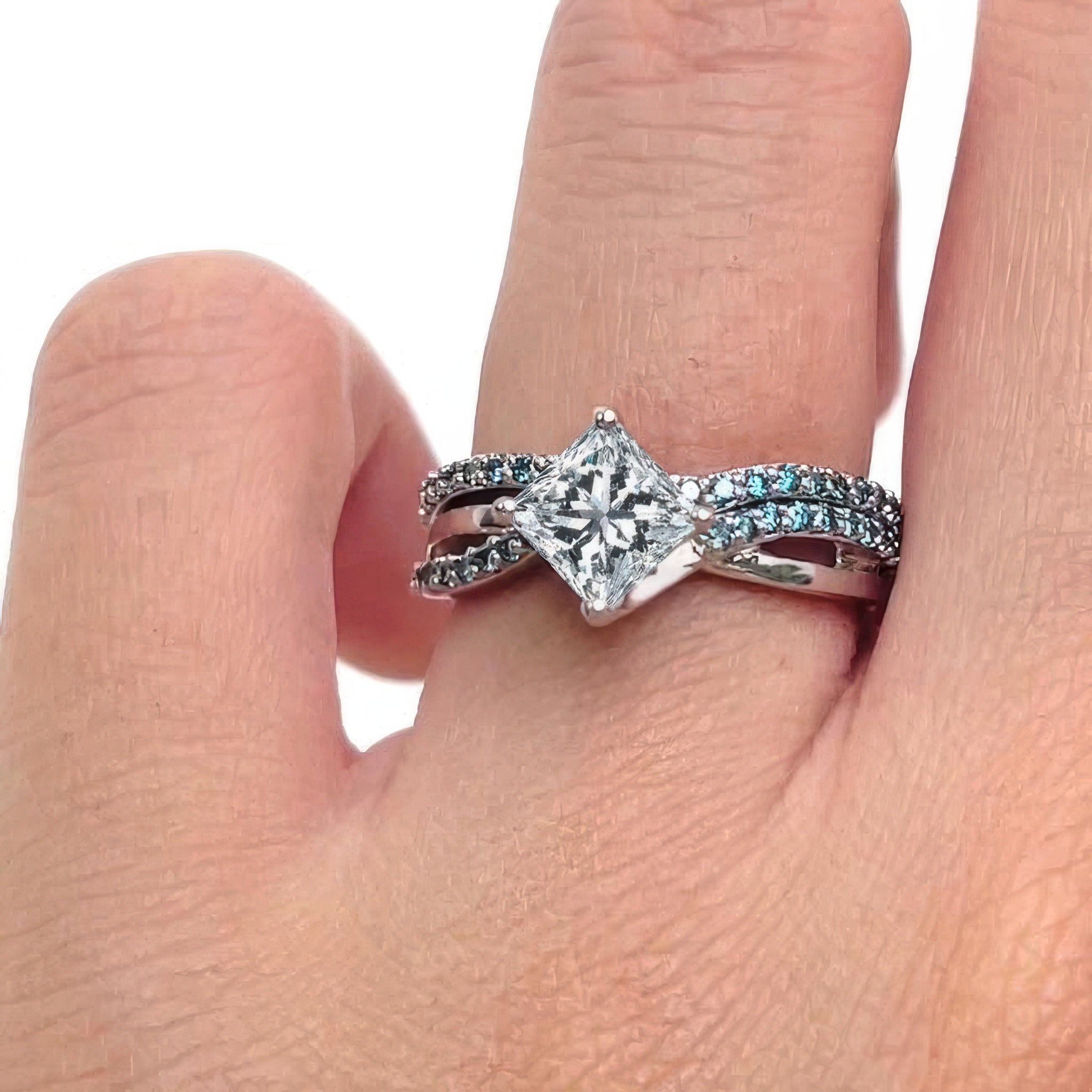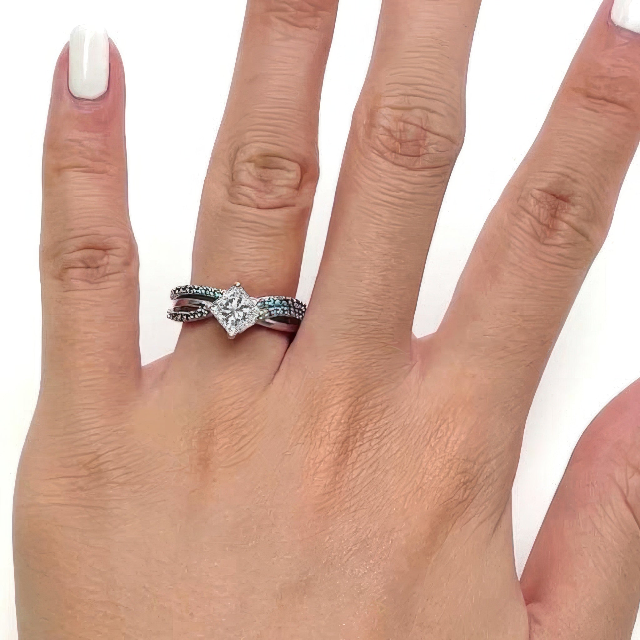 Paired with its sleek matching band, the engagement ring forms a flawless silhouette with a burst of personality. The Princess Cut Blue Diamond Accent Twist Bridal Set is designed for the bride who wants something elegant, unique, and unforgettable. A perfect mix of tradition and individuality.