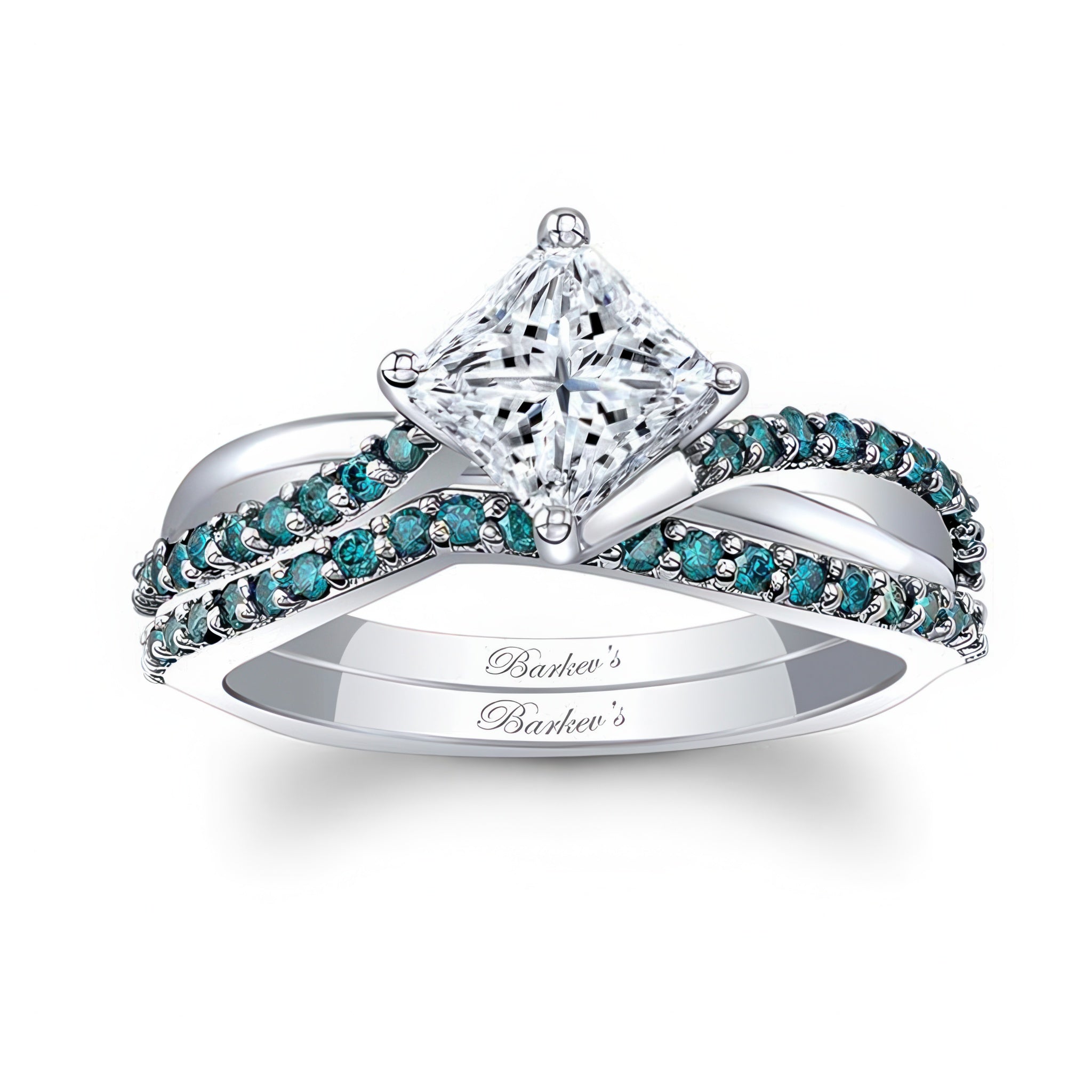 Turn heads with the bold beauty of the Princess Cut Blue Diamond Accent Twist Bridal Set. Featuring a stunning white princess-cut center diamond, this set shines with vibrant blue accent stones that wind through the twist shoulders like a stream of color. It’s effortlessly eye-catching, yet wonderfully refined.