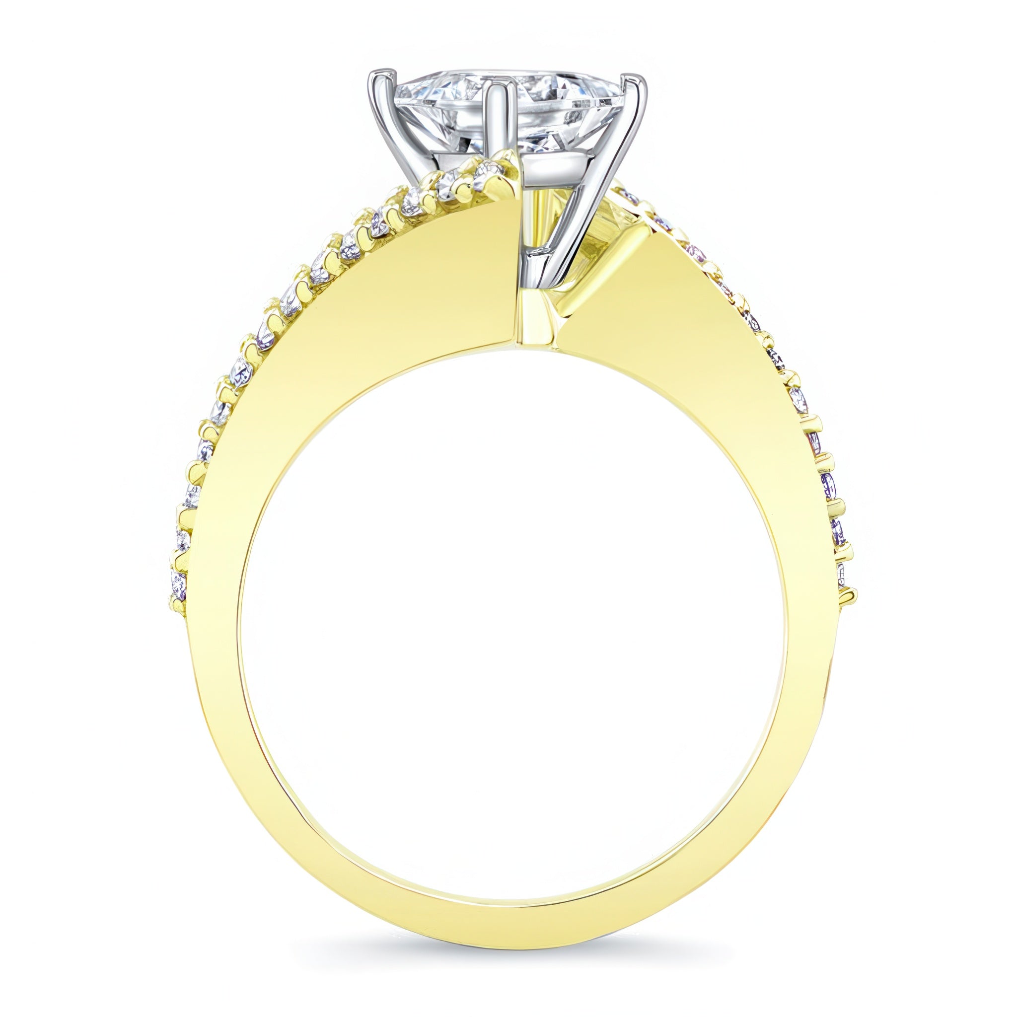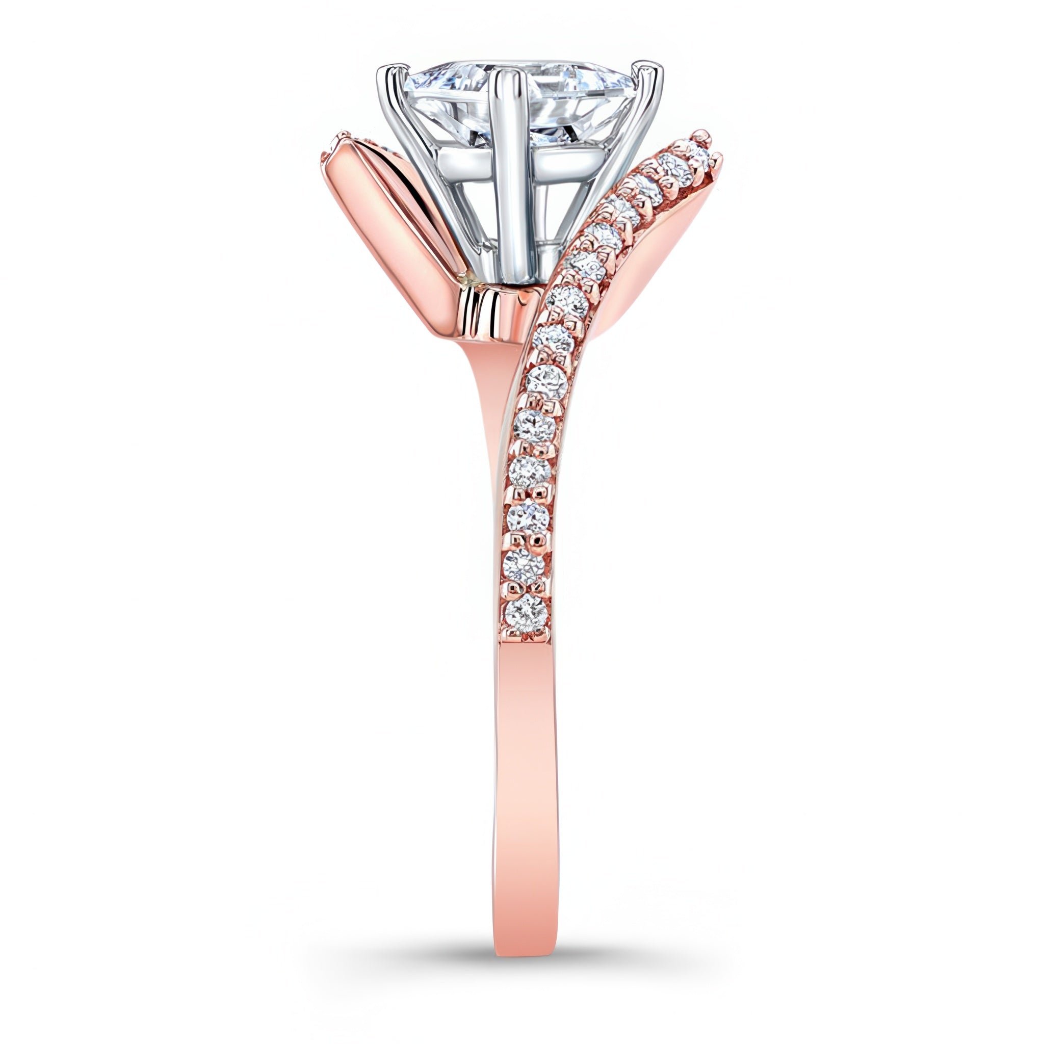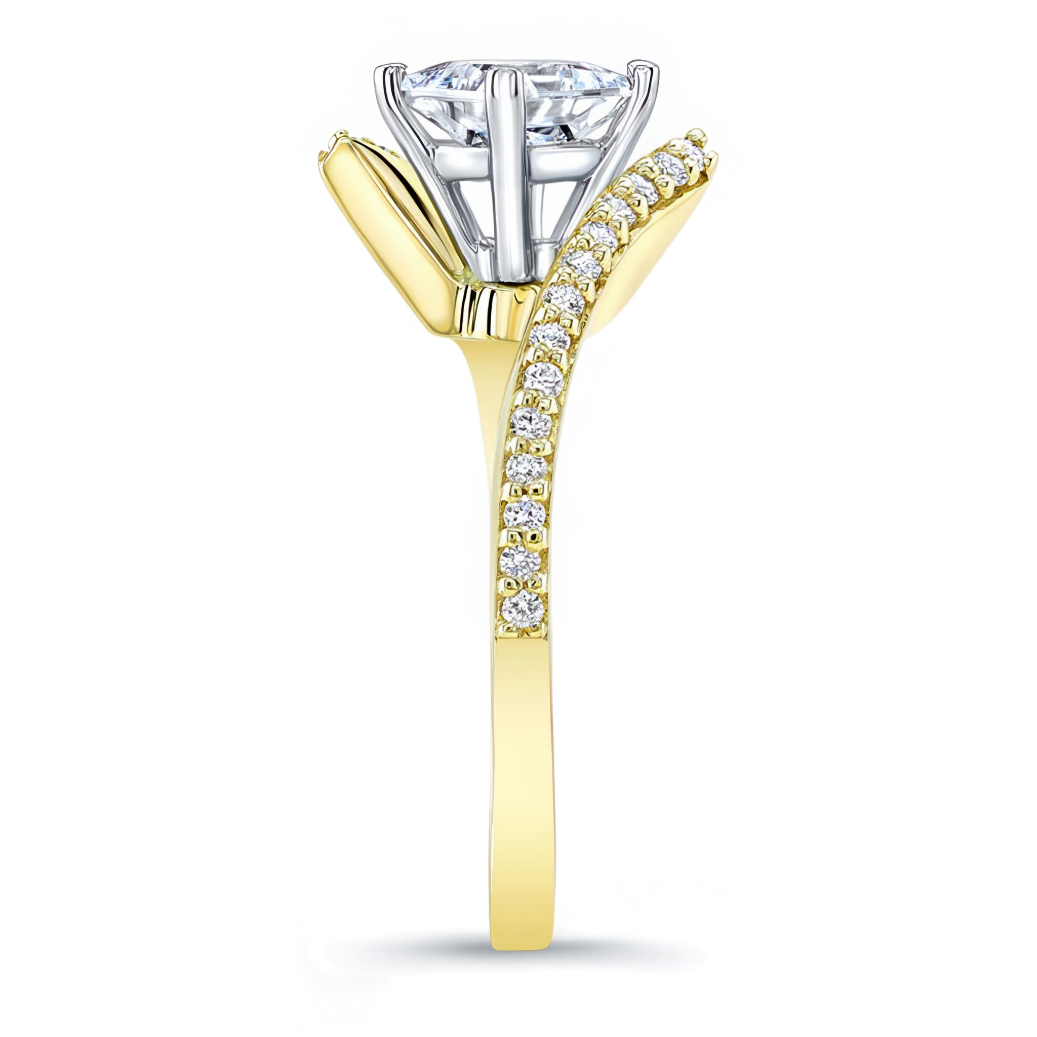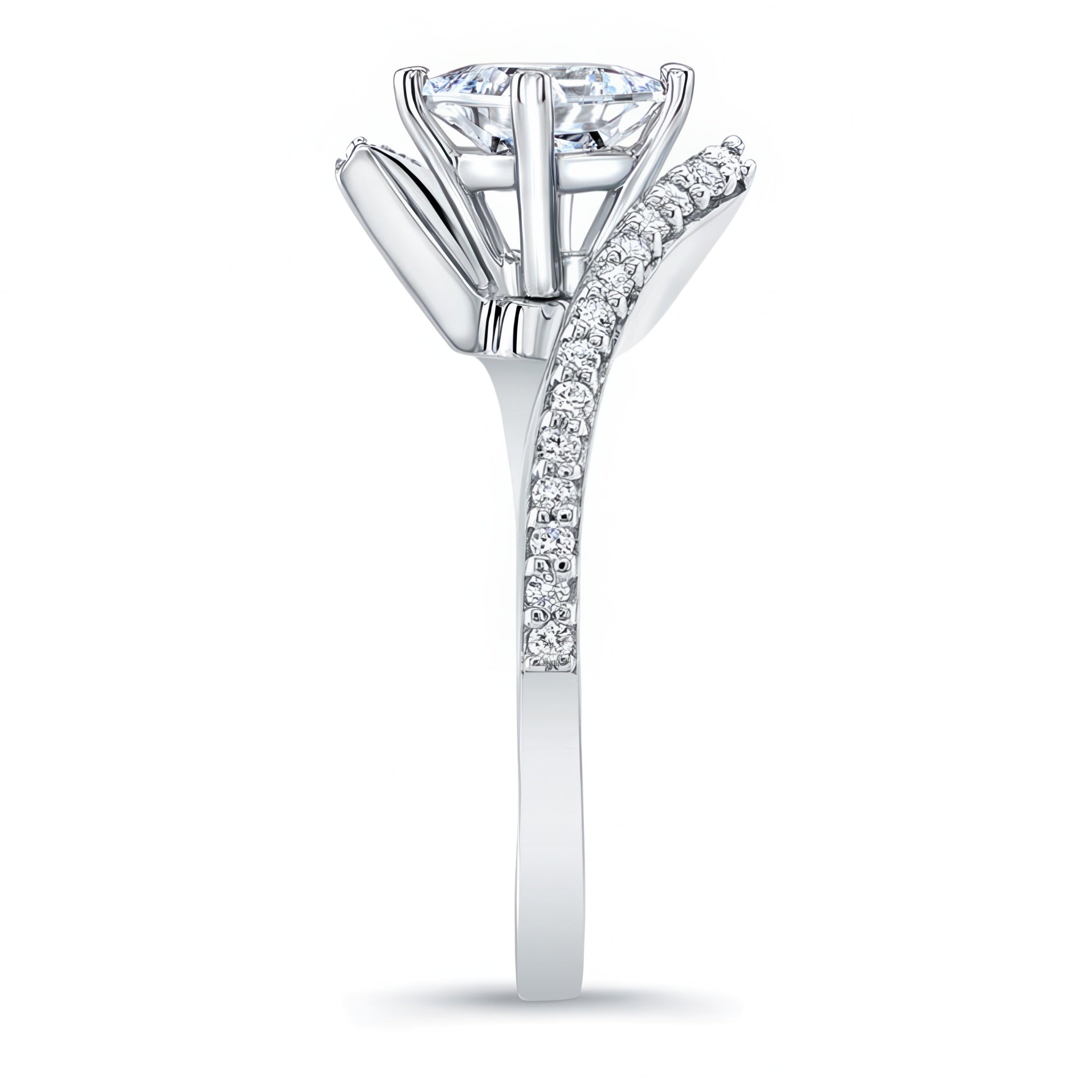 A dazzling princess cut bypass ring featuring a prong set center with sharing prong set diamonds gracing the ridges for a dramatic look sure to catch the eye of many admirers.