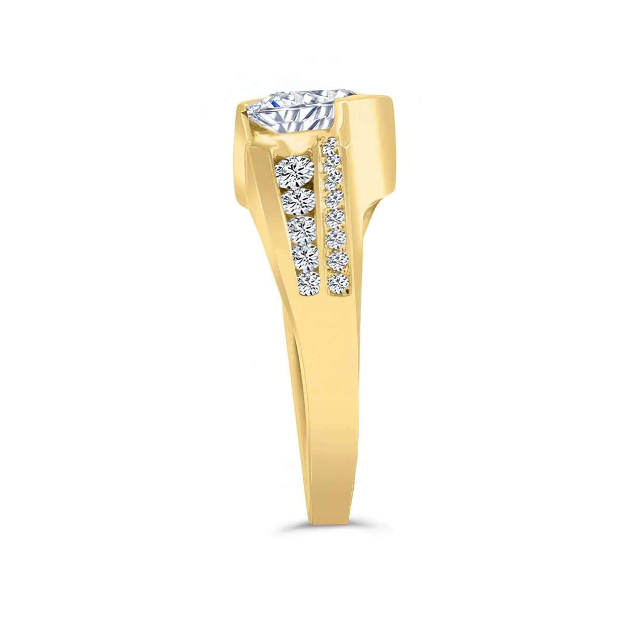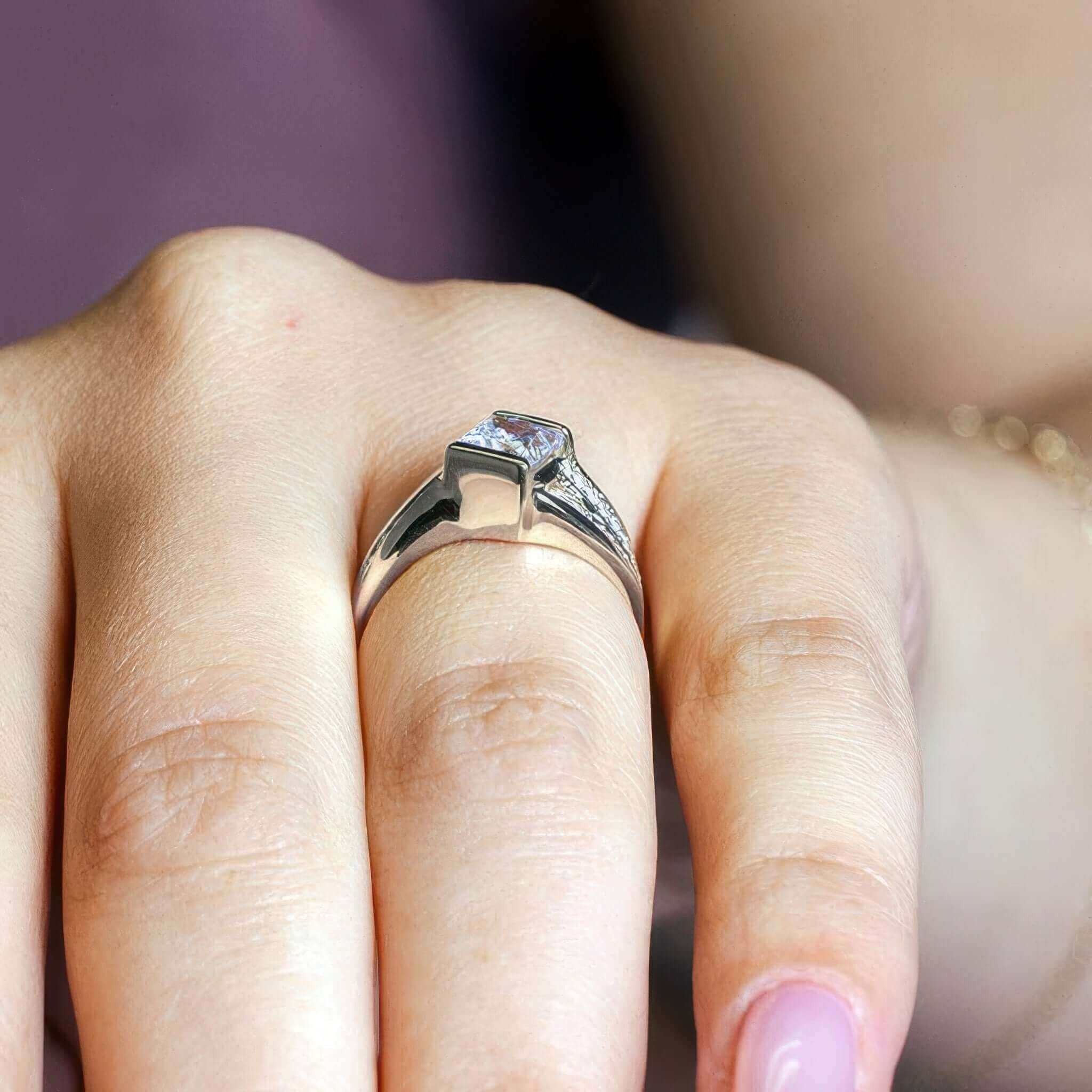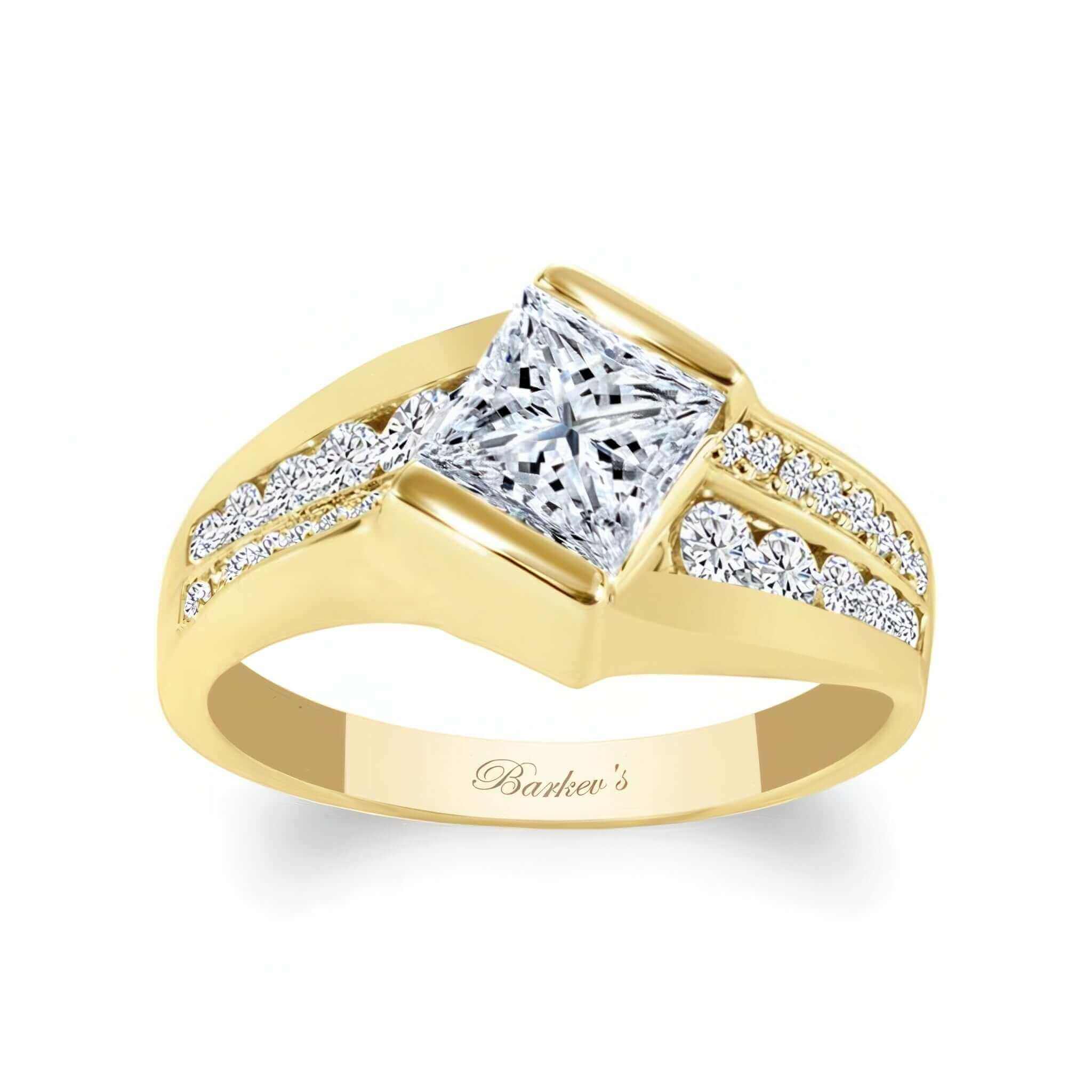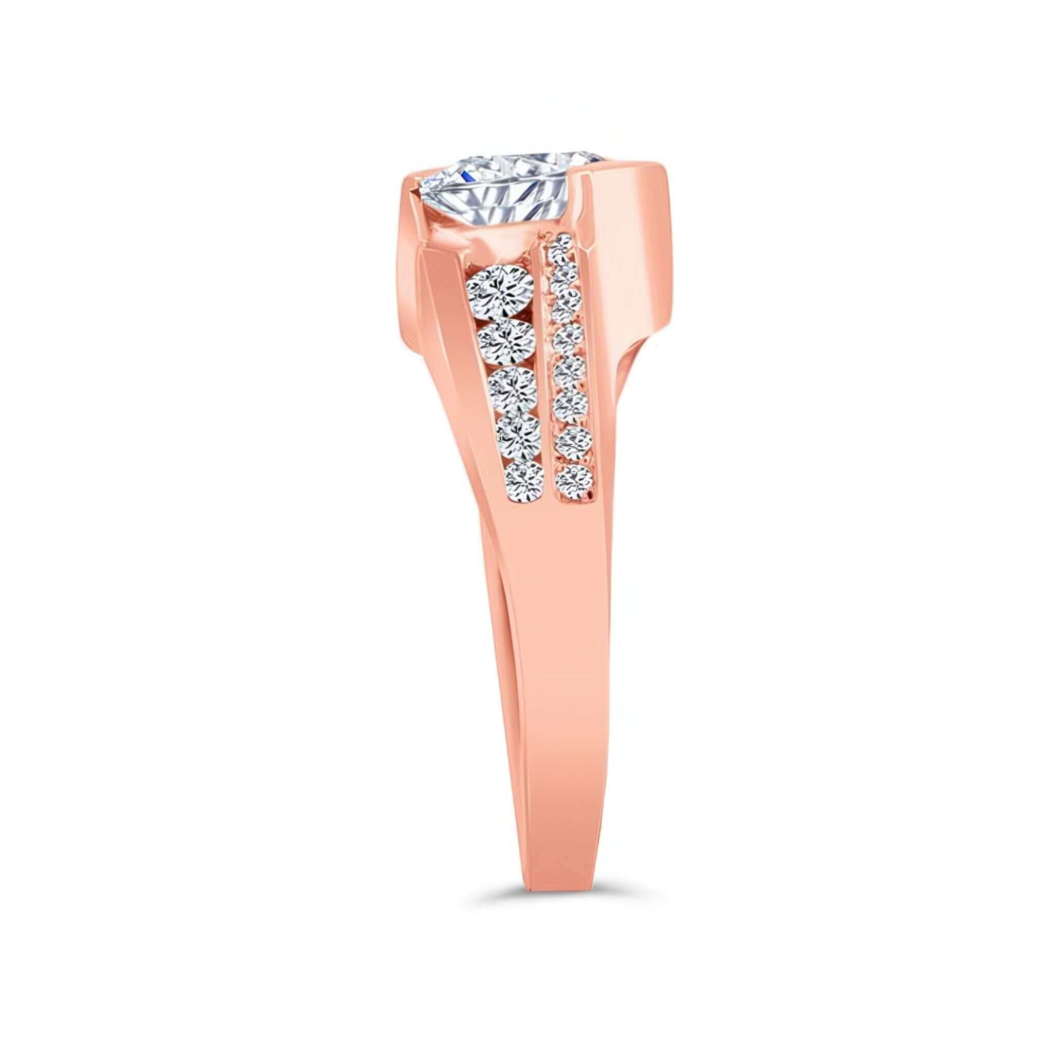 This princess cut channel set diamond ring features a princess cut center with channel set diamonds on the shank.
