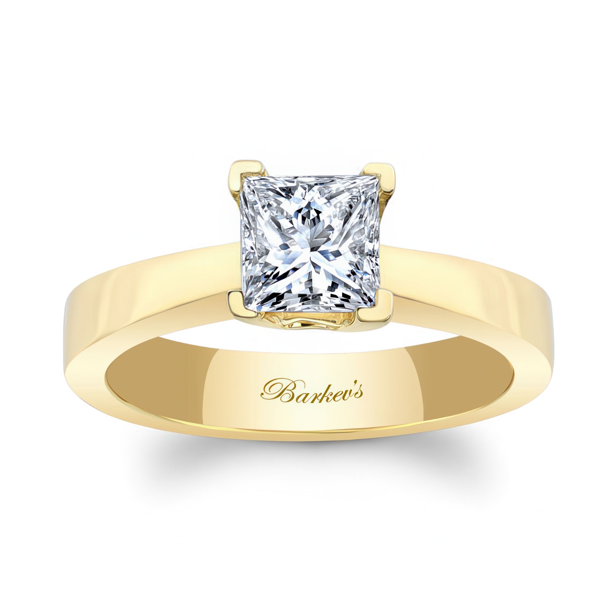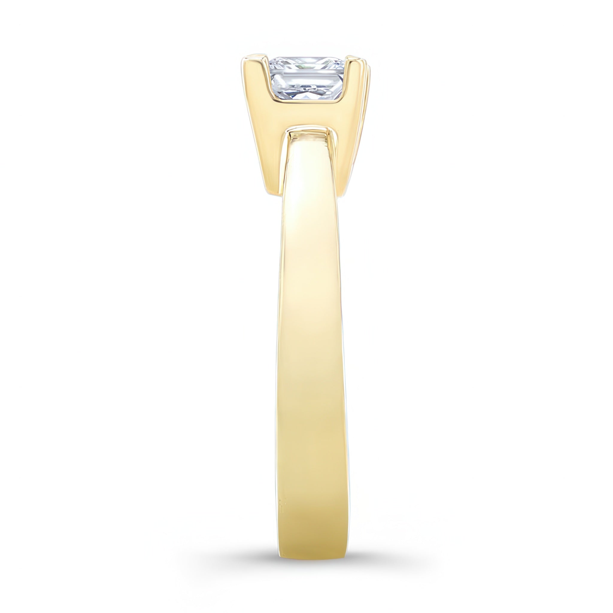 An elegant princess cut solitaire diamond ring featuring a 1 carat center stone sitting on a gold band.
