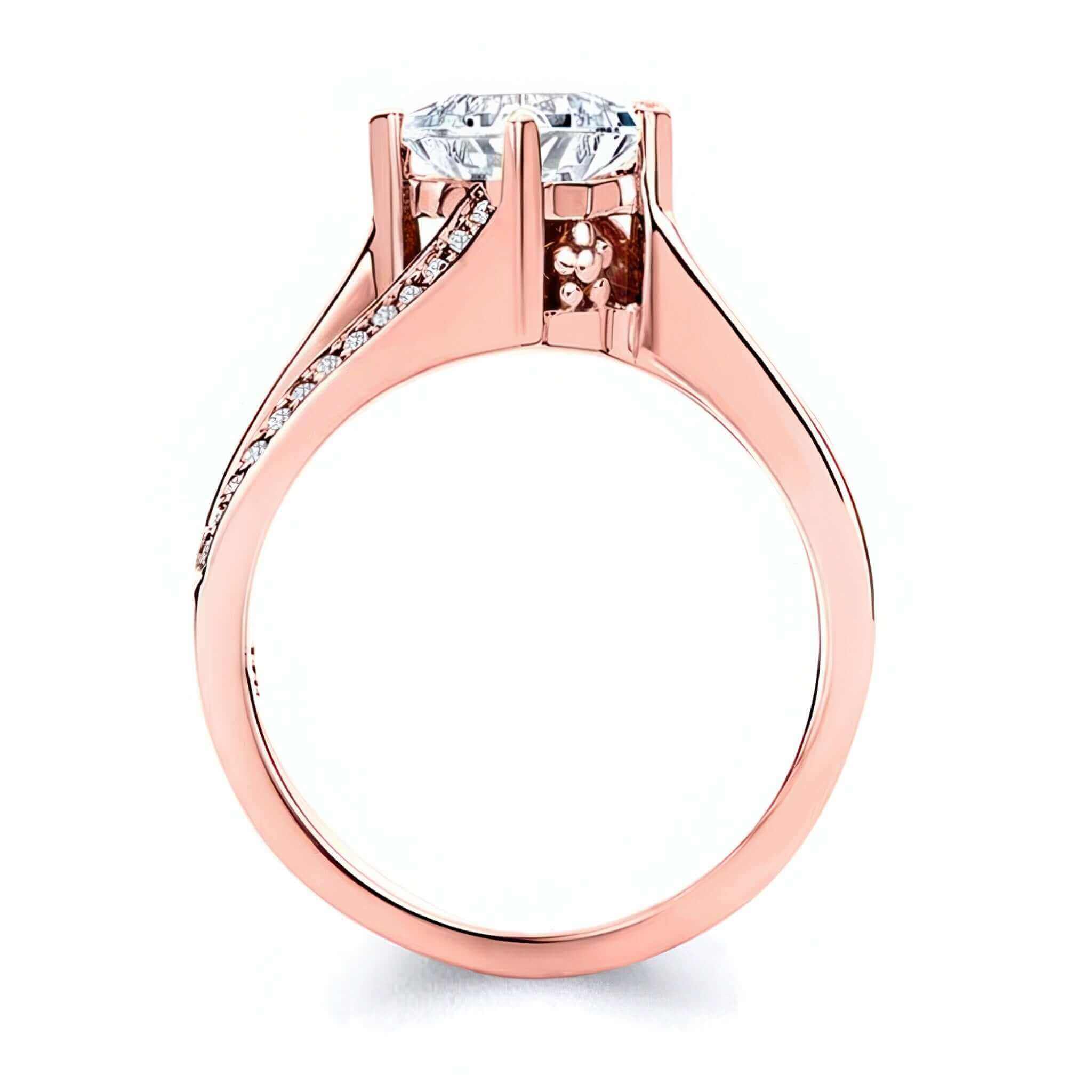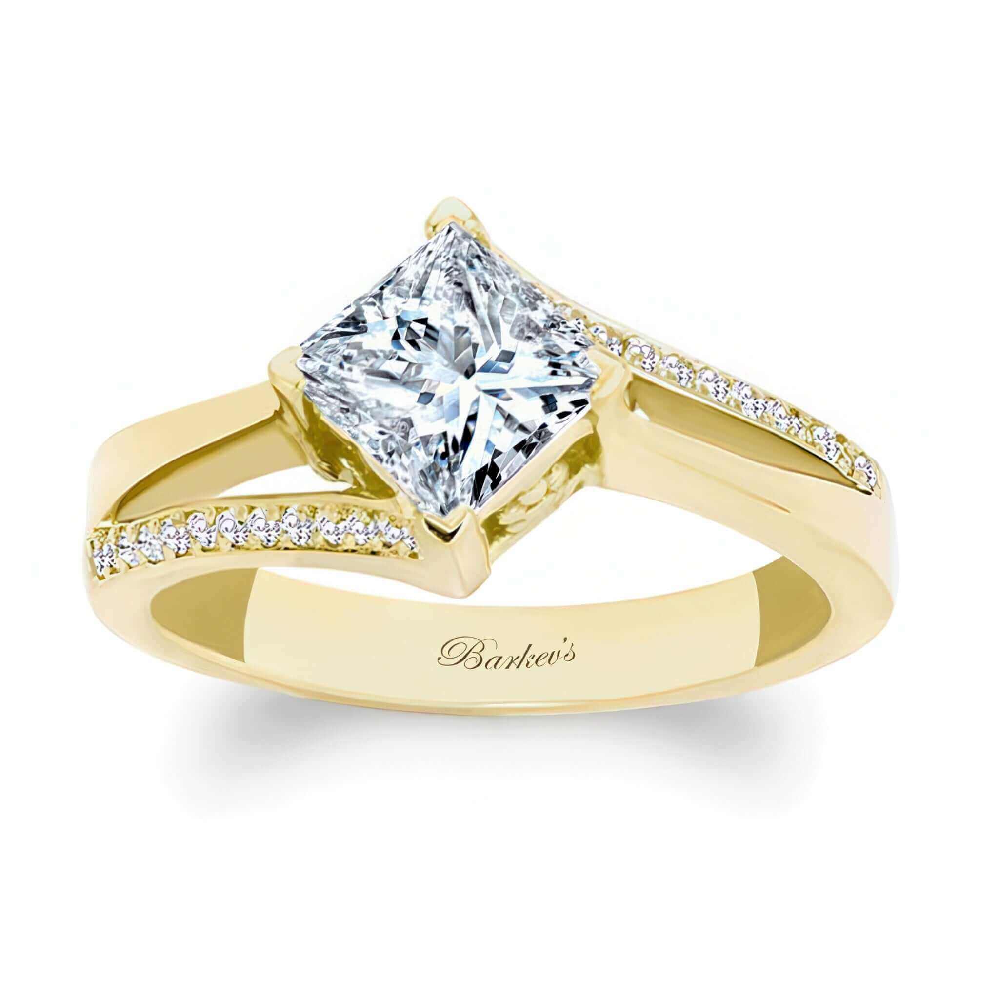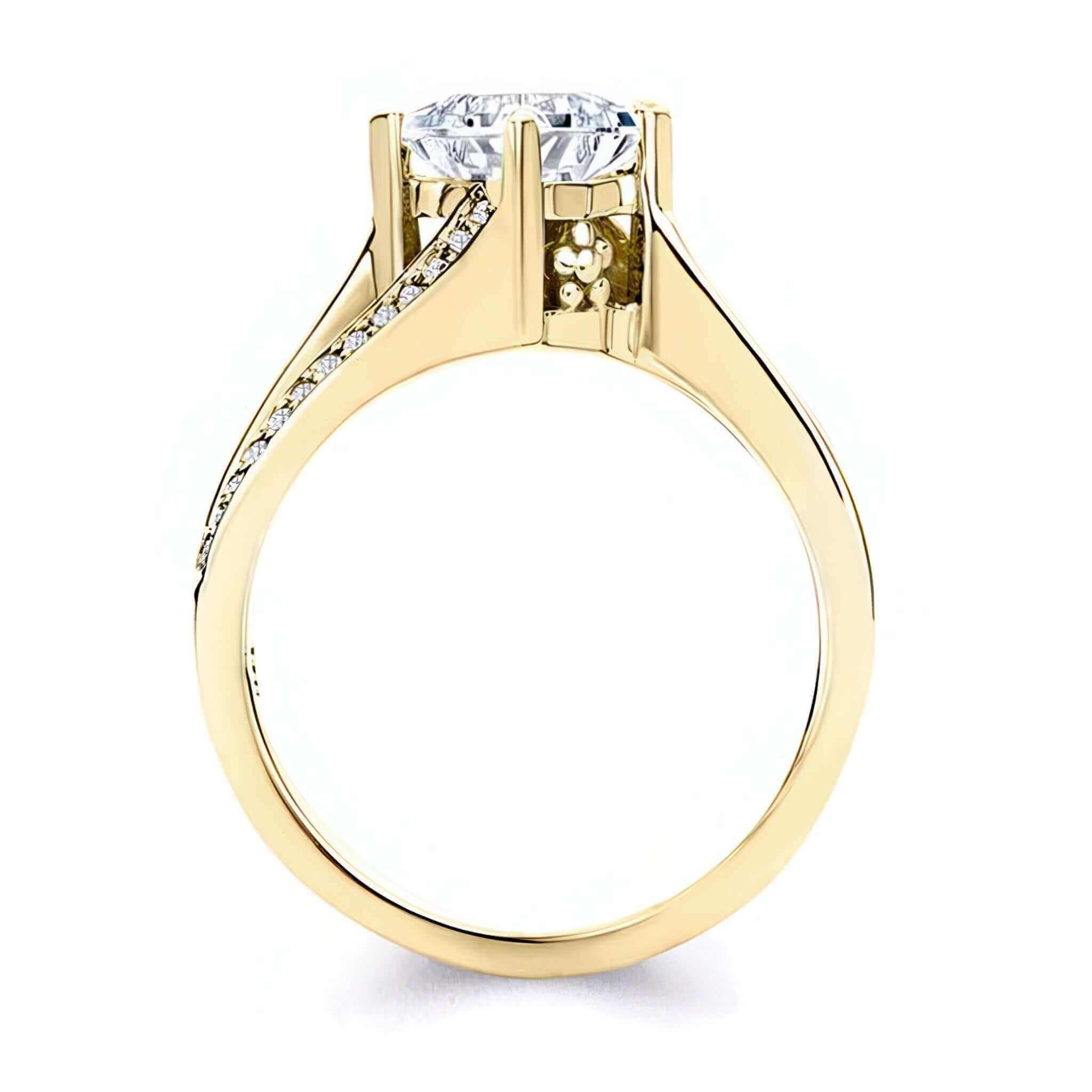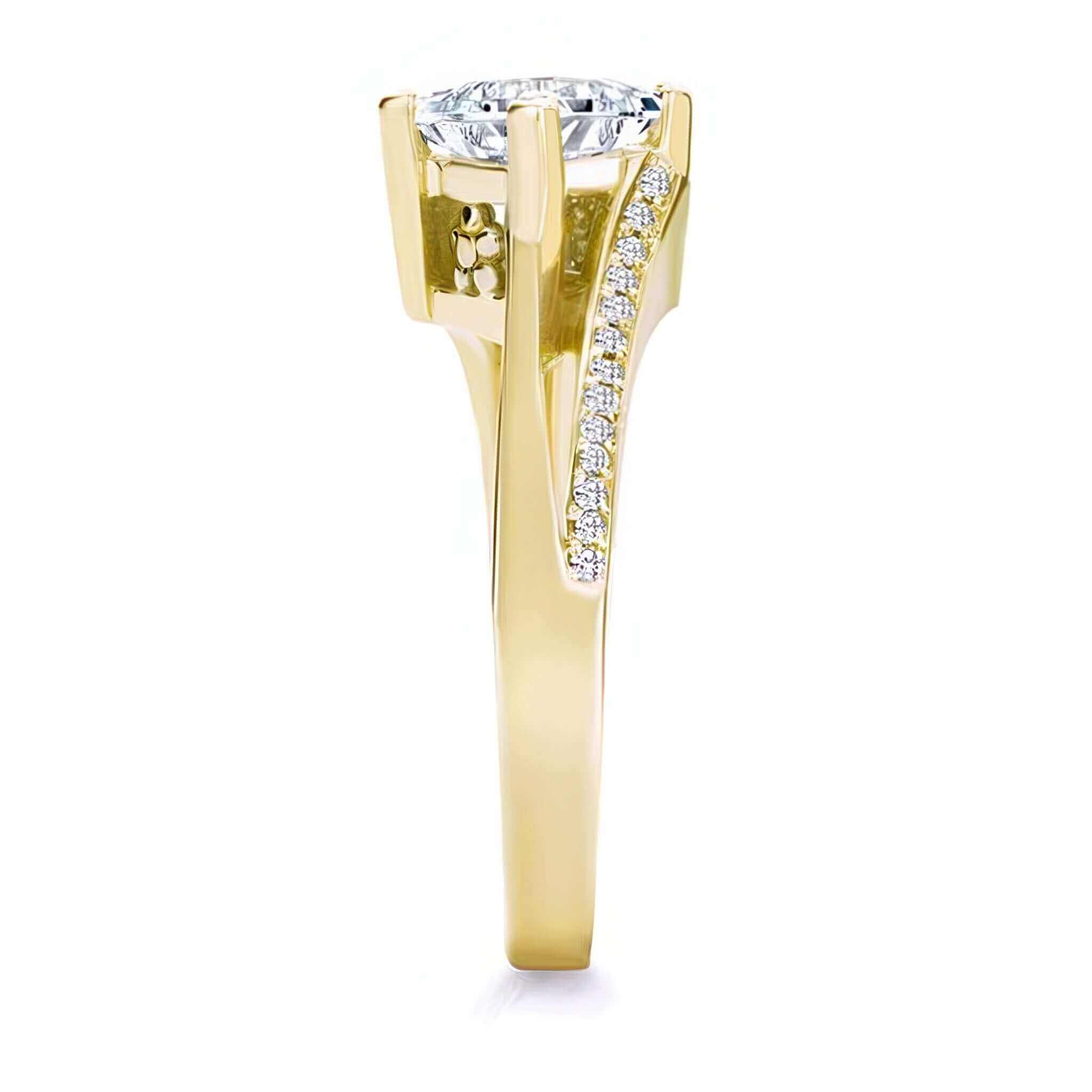 A beautiful princess cut split shank ring featuring a square center and diamond melees on the side.