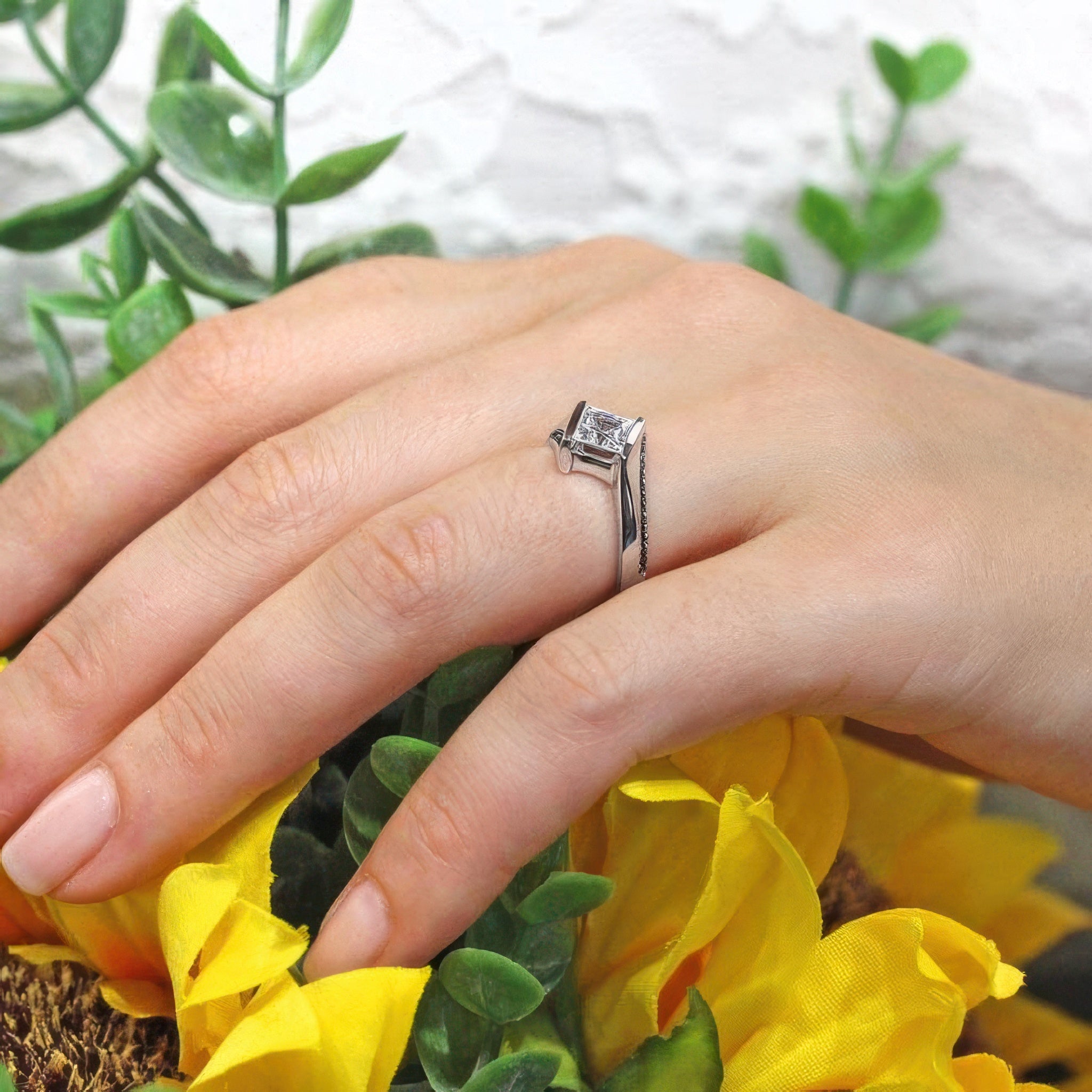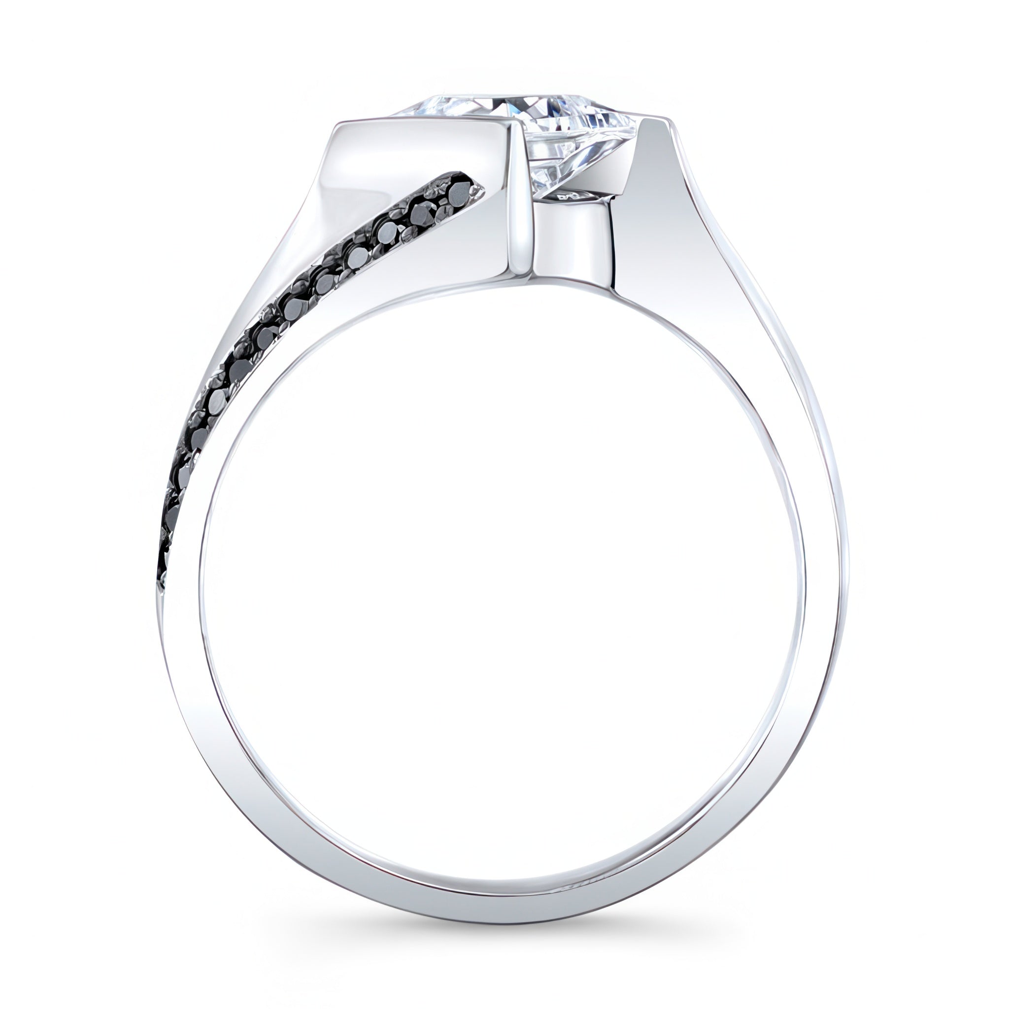 A stunning princess cut square black diamond accent ring featuring a channel set center that's captured by the ridges while pave set black diamonds accent the bright polished shoulders for an elegant look.