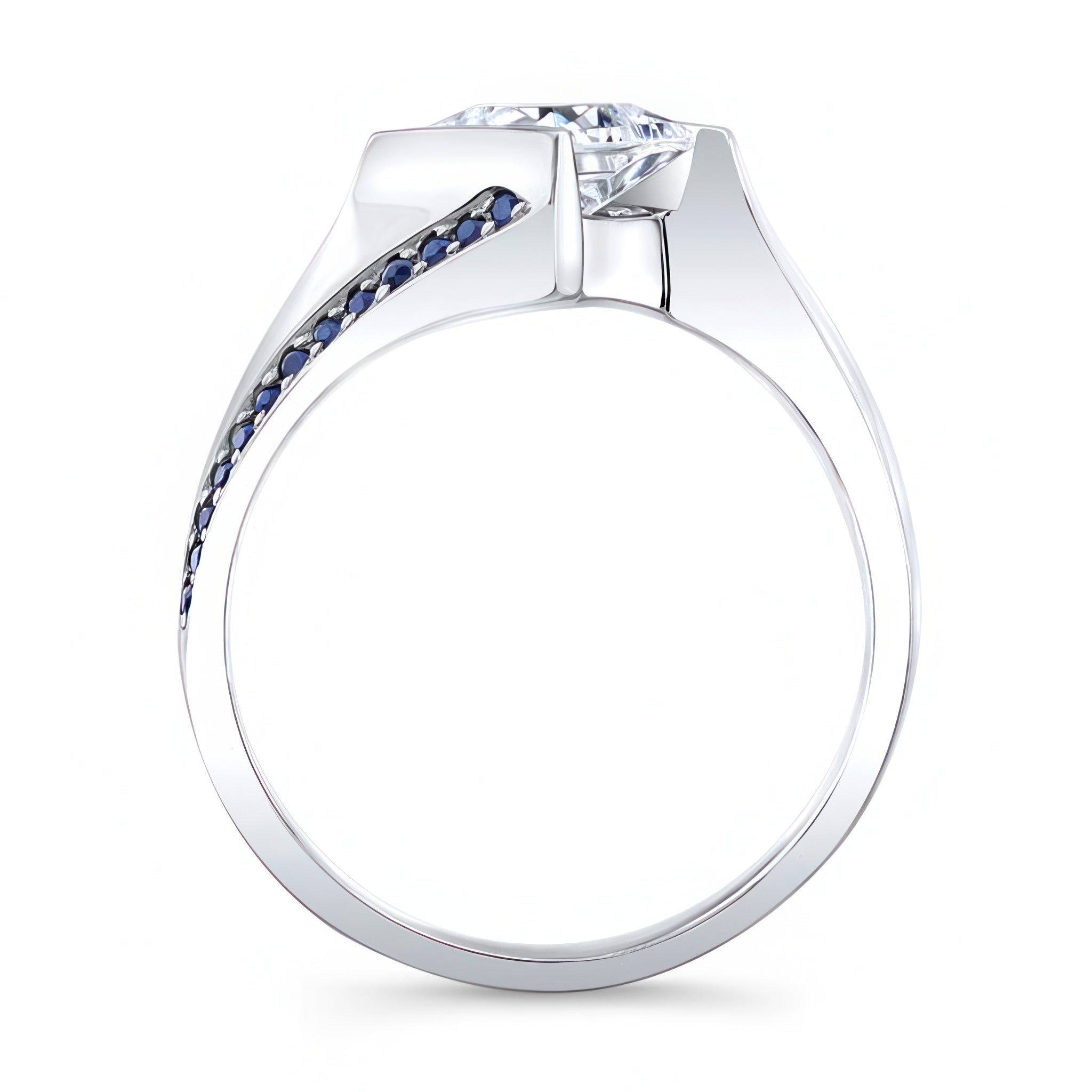 A stunning princess cut square sapphire ring featuring a channel set center that's captured by the ridges while pave set blue sapphires accent the bright polished shoulders for an elegant look.