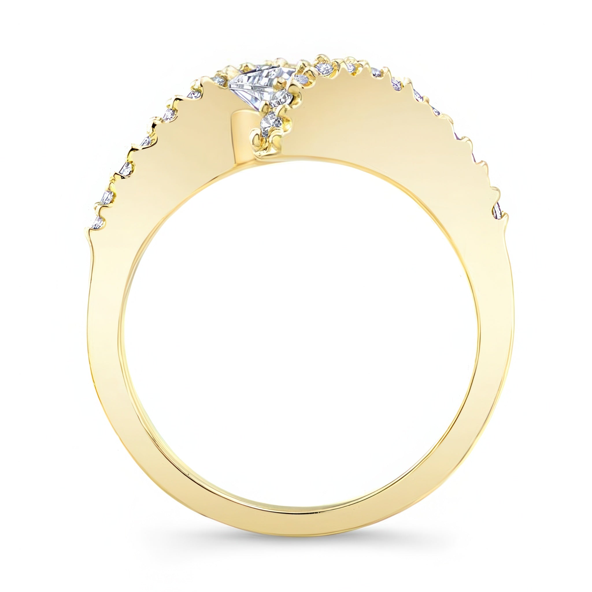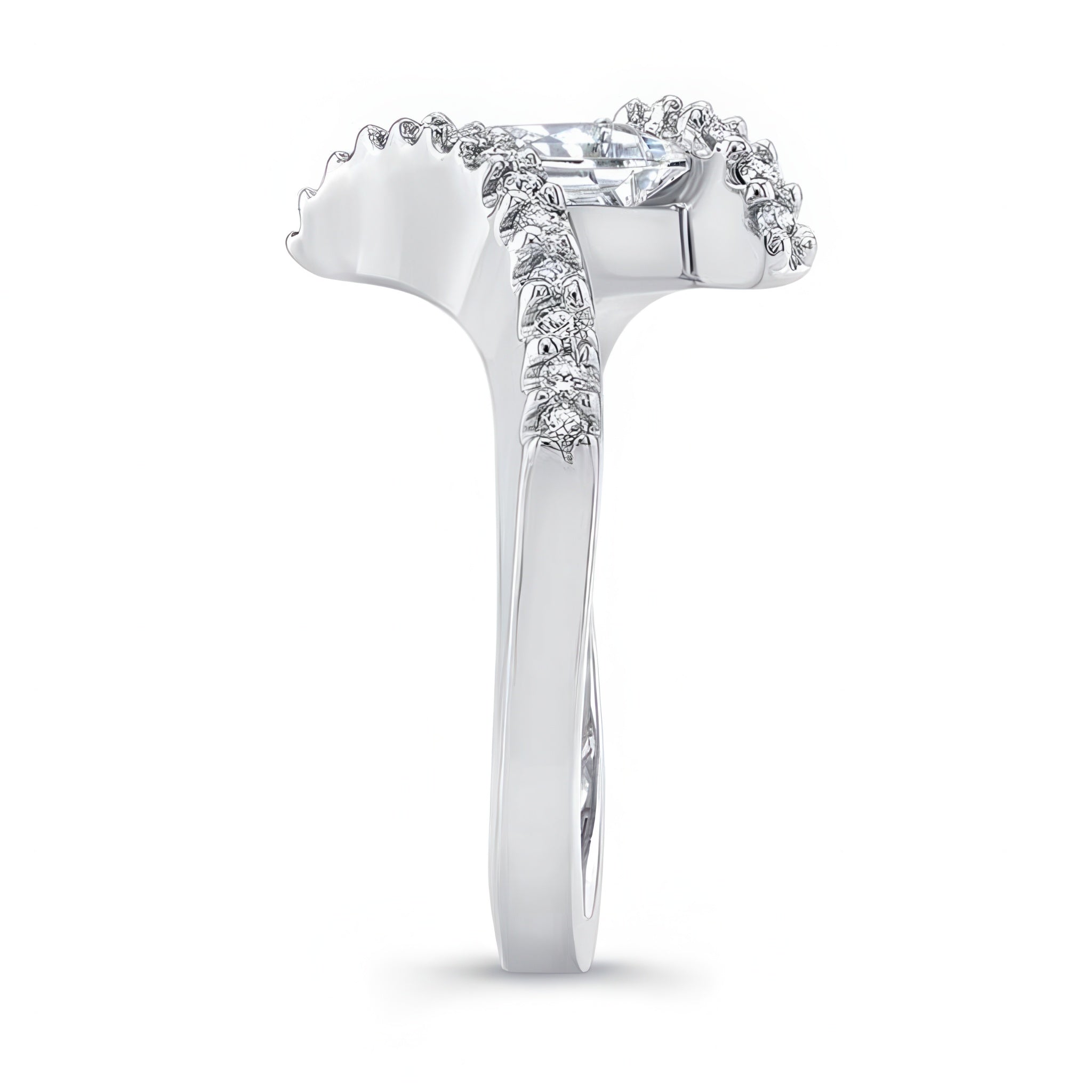 This sideways princess cut engagement ring gives the illusion of a tension style setting while pave set diamonds accent the band adding an overall shine to this dazzling design.