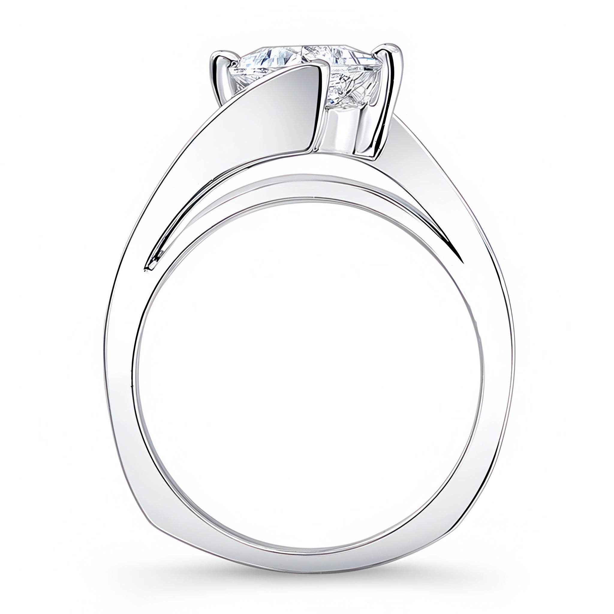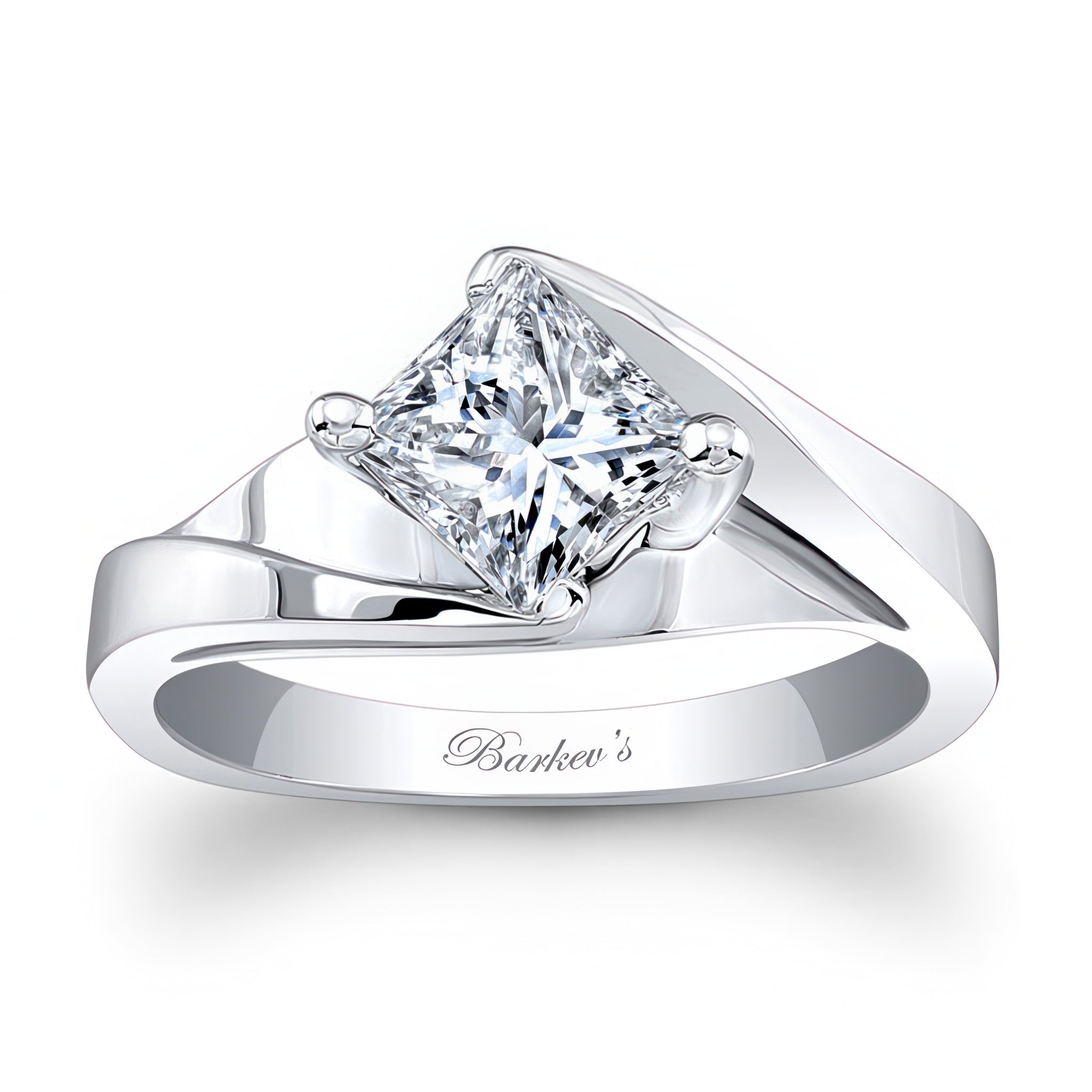 This solitaire princess diamond ring is artfully designed with a split shank and cathedral shoulders that rise to the prong-set center with a bright polished gallery.