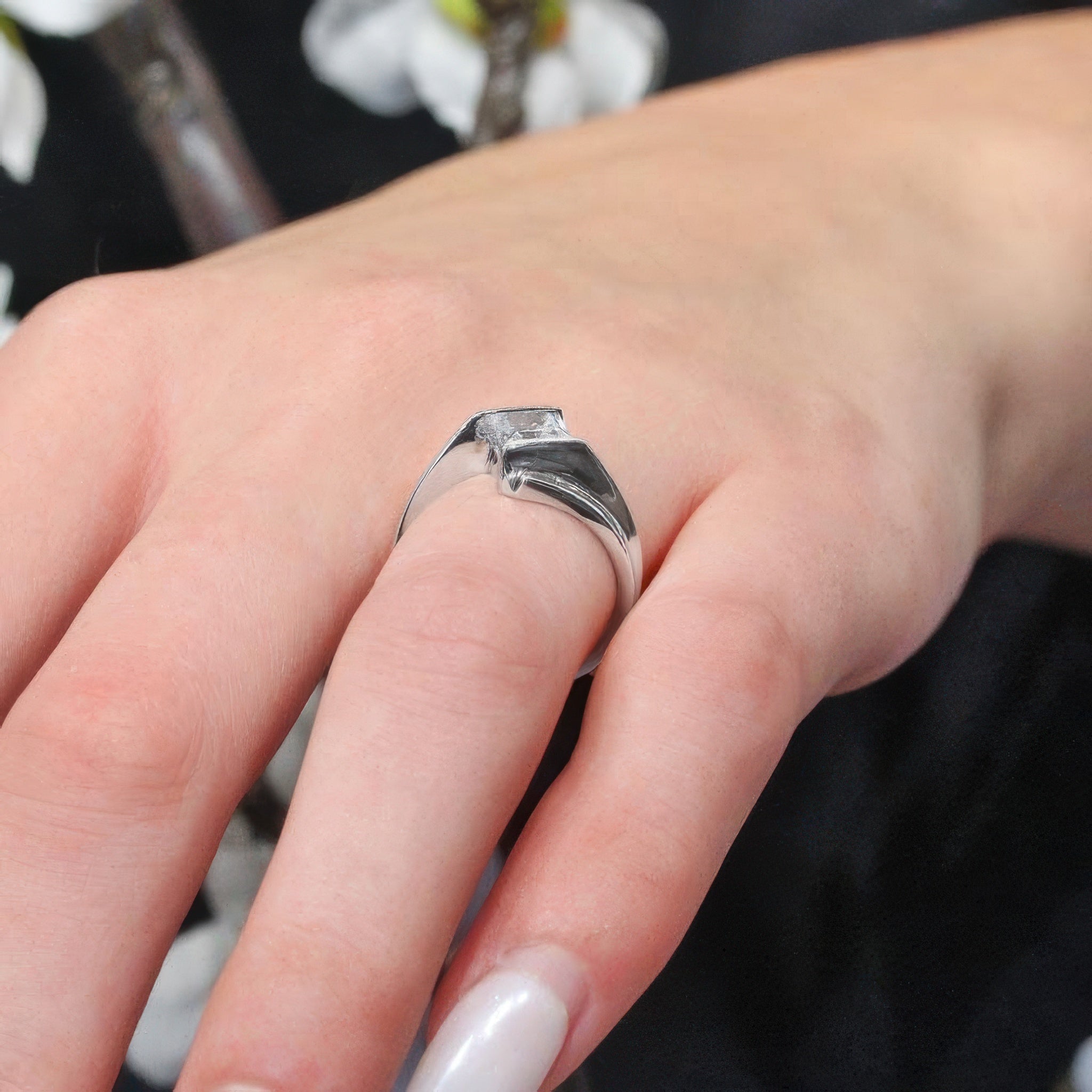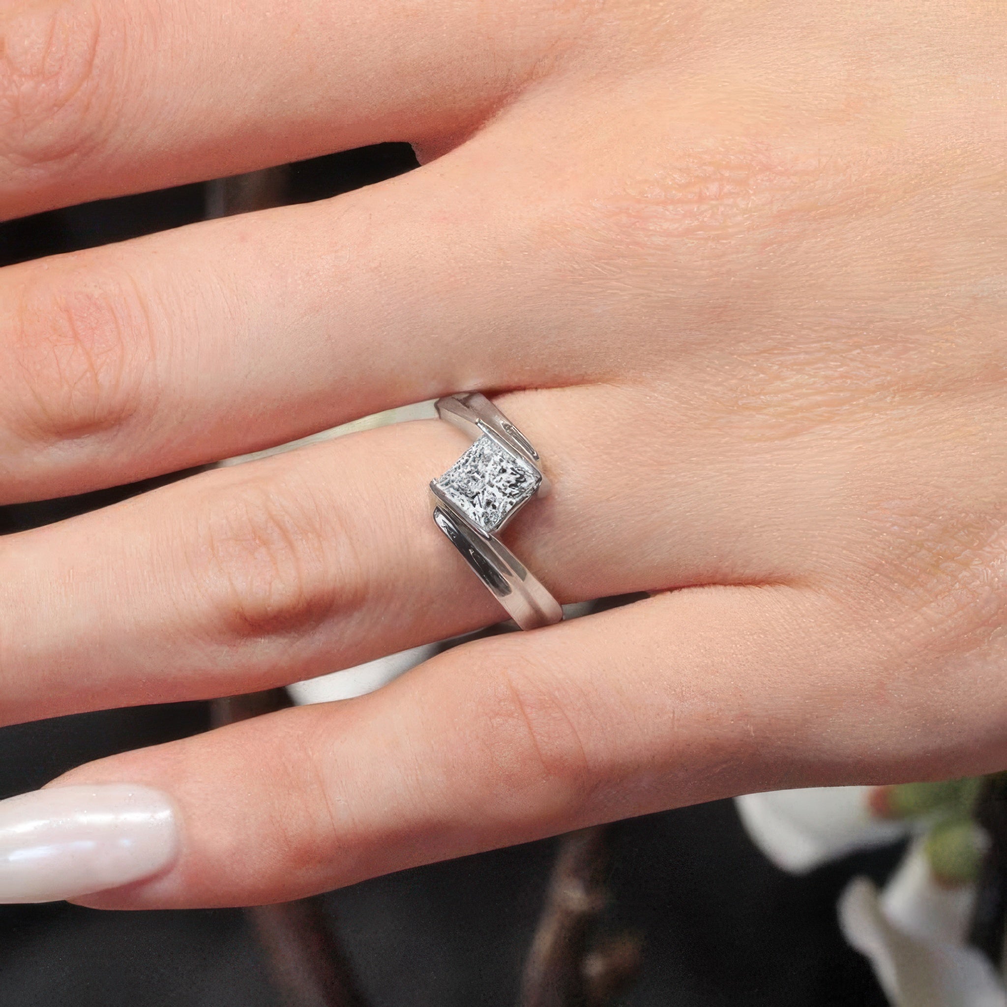 This stepped princess cut solitaire ring is a dazzler features a channel set princess cut center with a stepped bright polished shank.