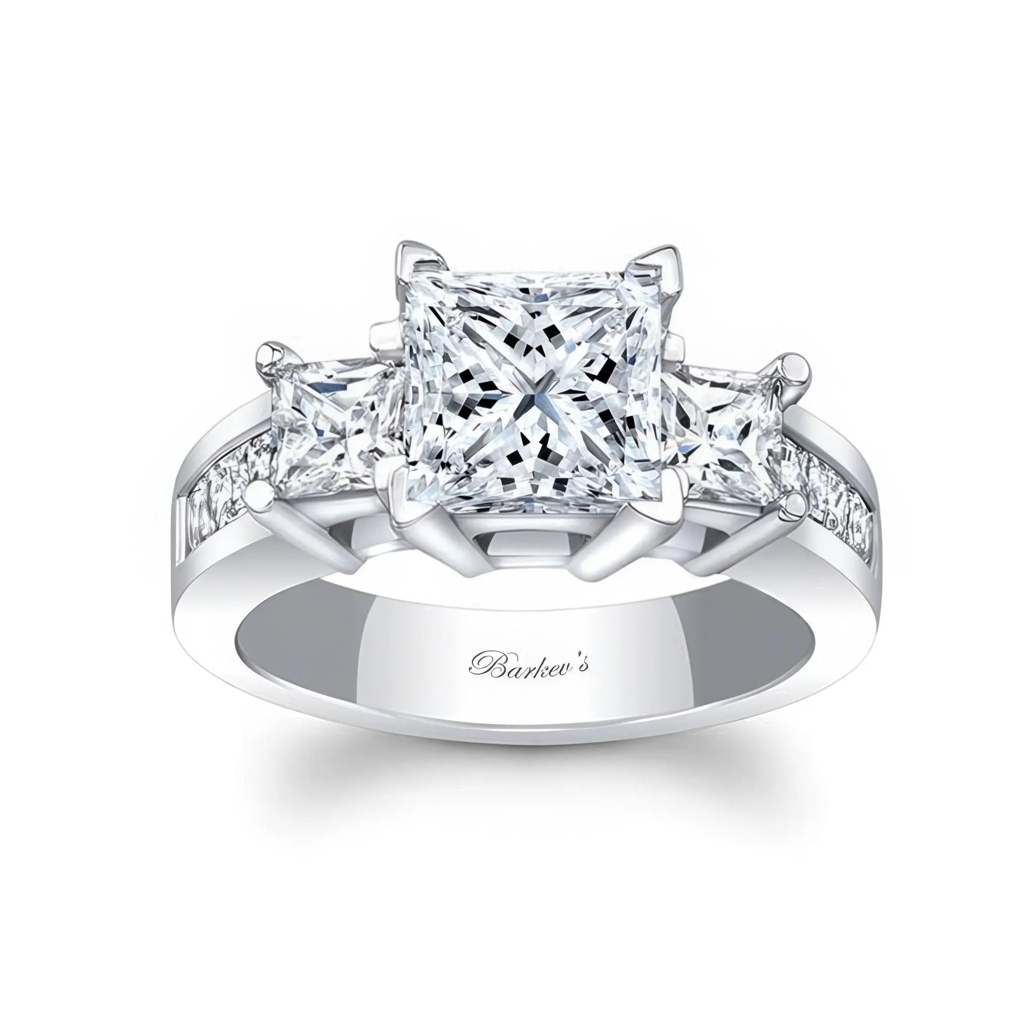 This flashy three stone engagement ring features a basket setting with a princess cut center and smaller flanking stones at it's sides with channel set princess diamonds on the shoulders.
