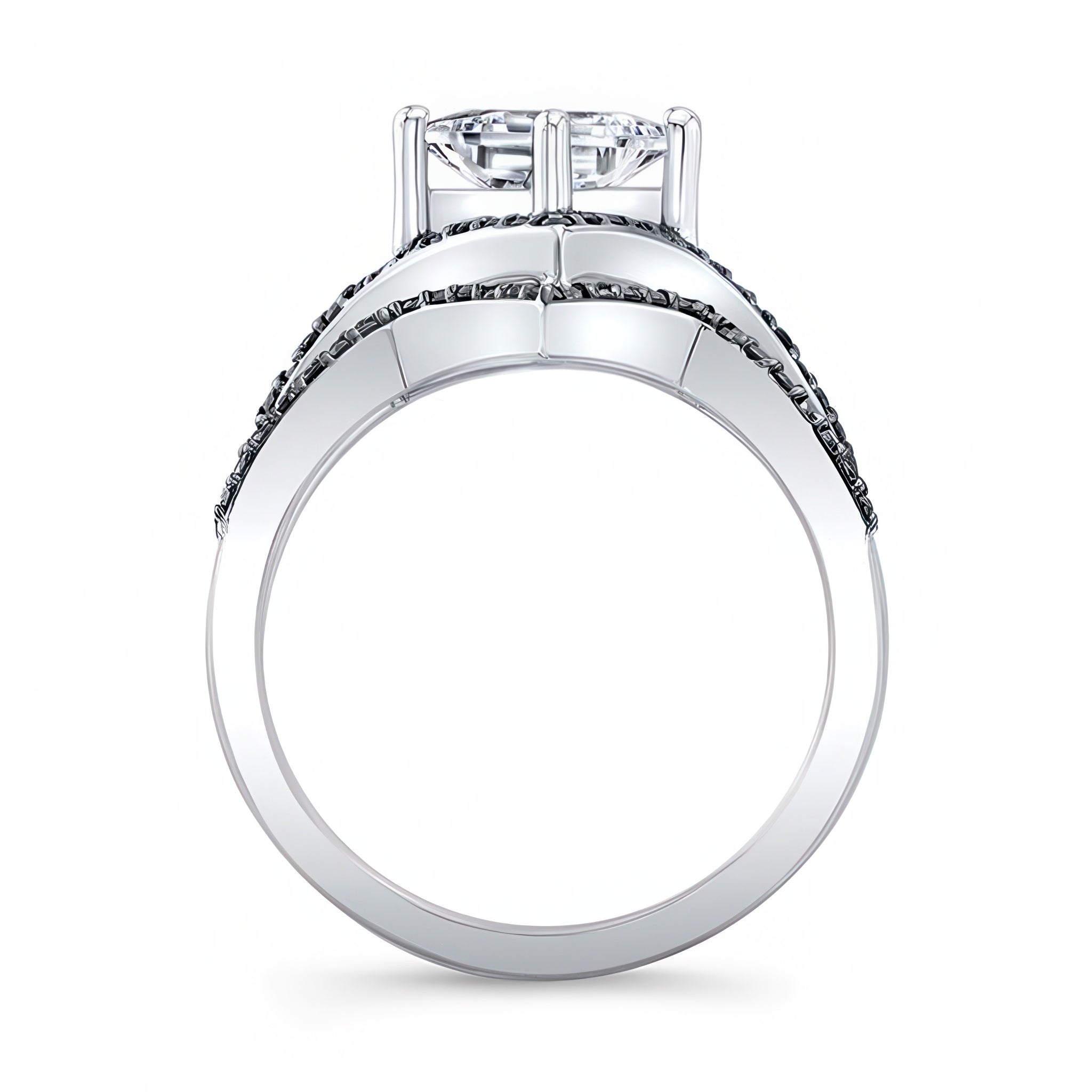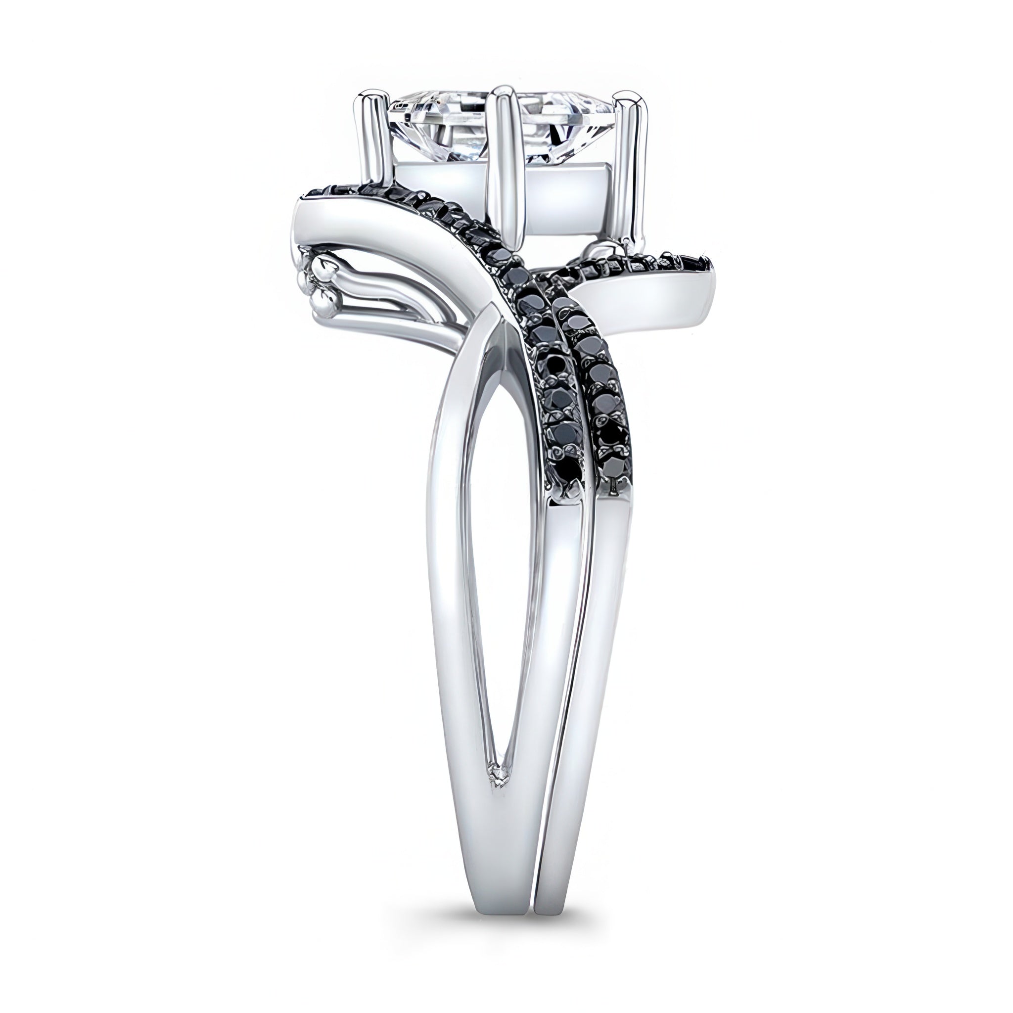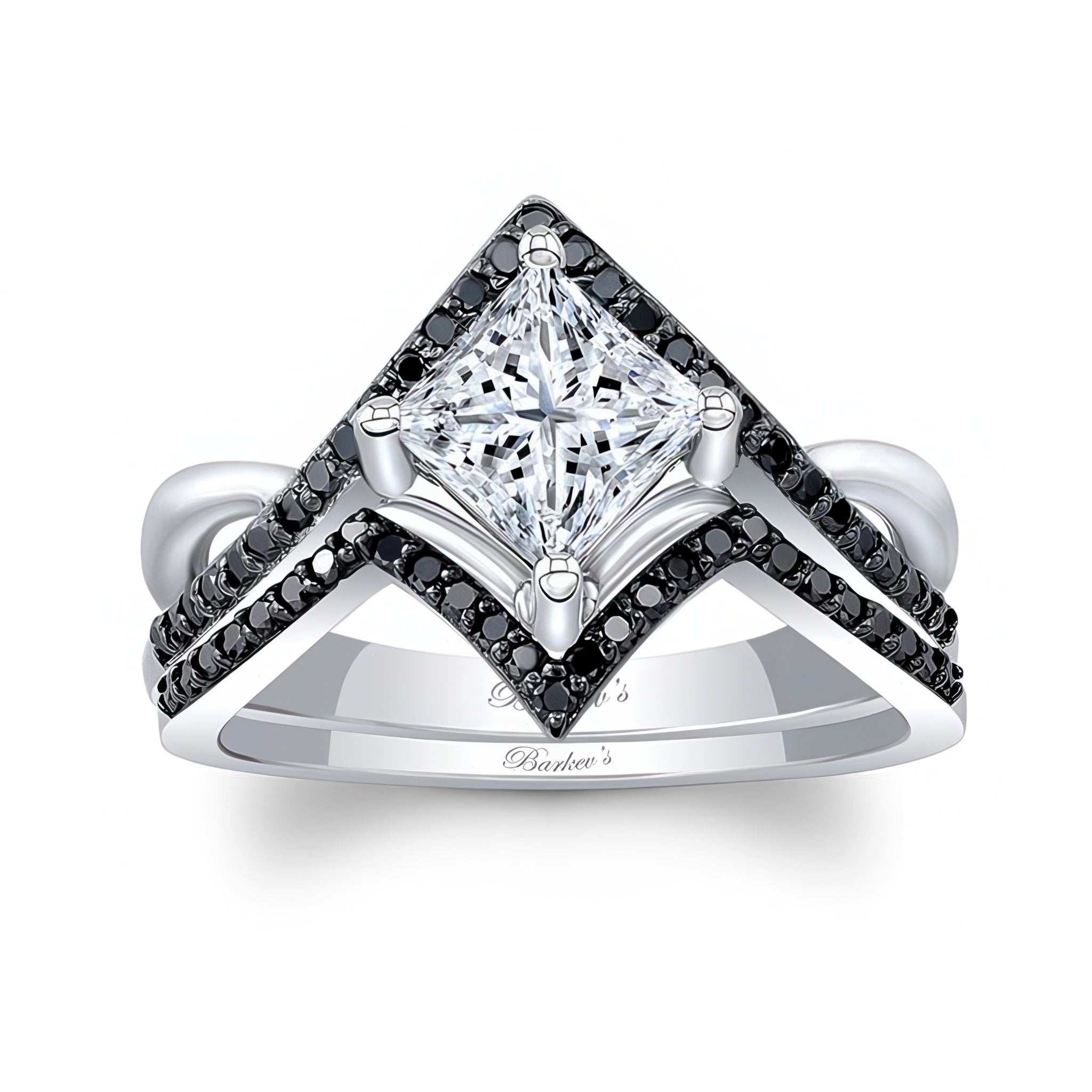 A unique princess cut black diamond accent ring set featuring a square shaped center, sitting on a curving shank with a row of black diamonds for added sparkle. Comes with a wedding band.