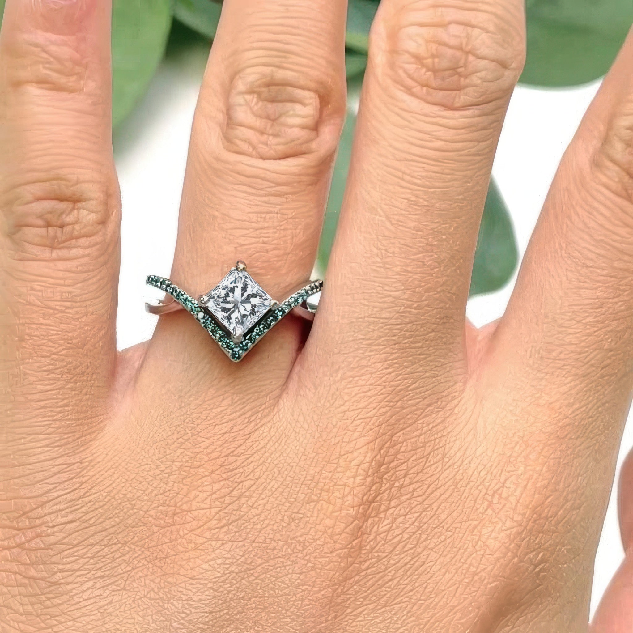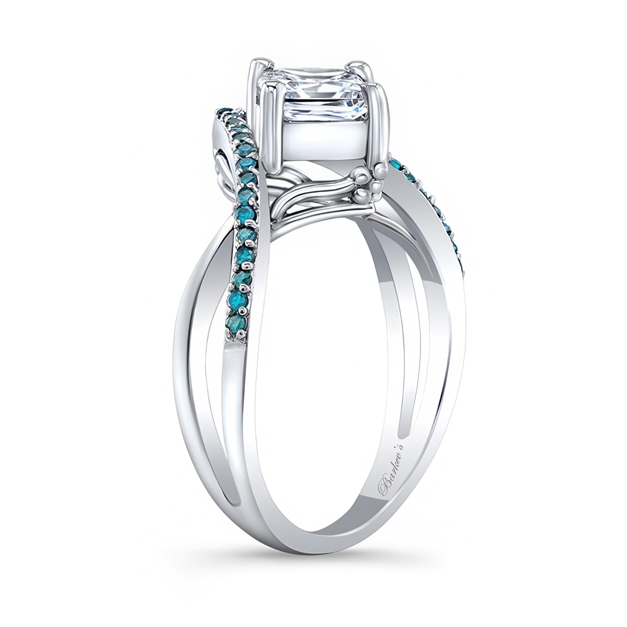 A unique princess cut blue diamond accent ring featuring a square shaped center, sitting on a curving shank with a row of blue diamonds for added sparkle.