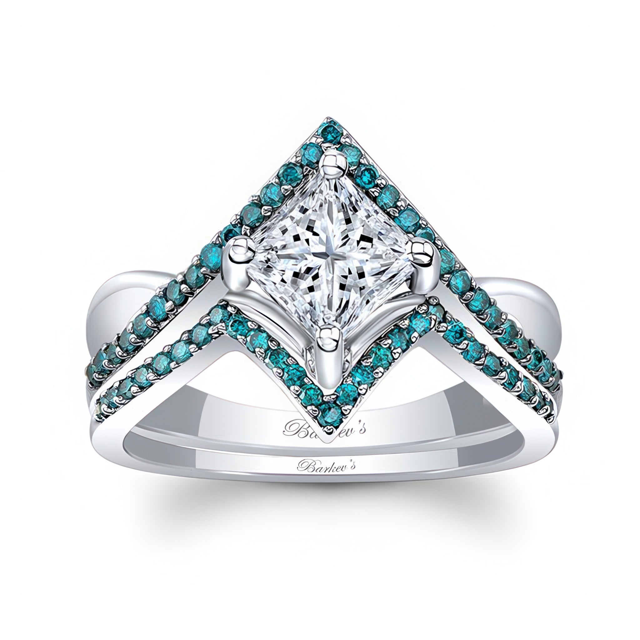 A unique princess cut blue diamond accent ring set featuring a square shaped center, sitting on a curving shank with a row of blue diamonds for added sparkle. Comes with a wedding band.