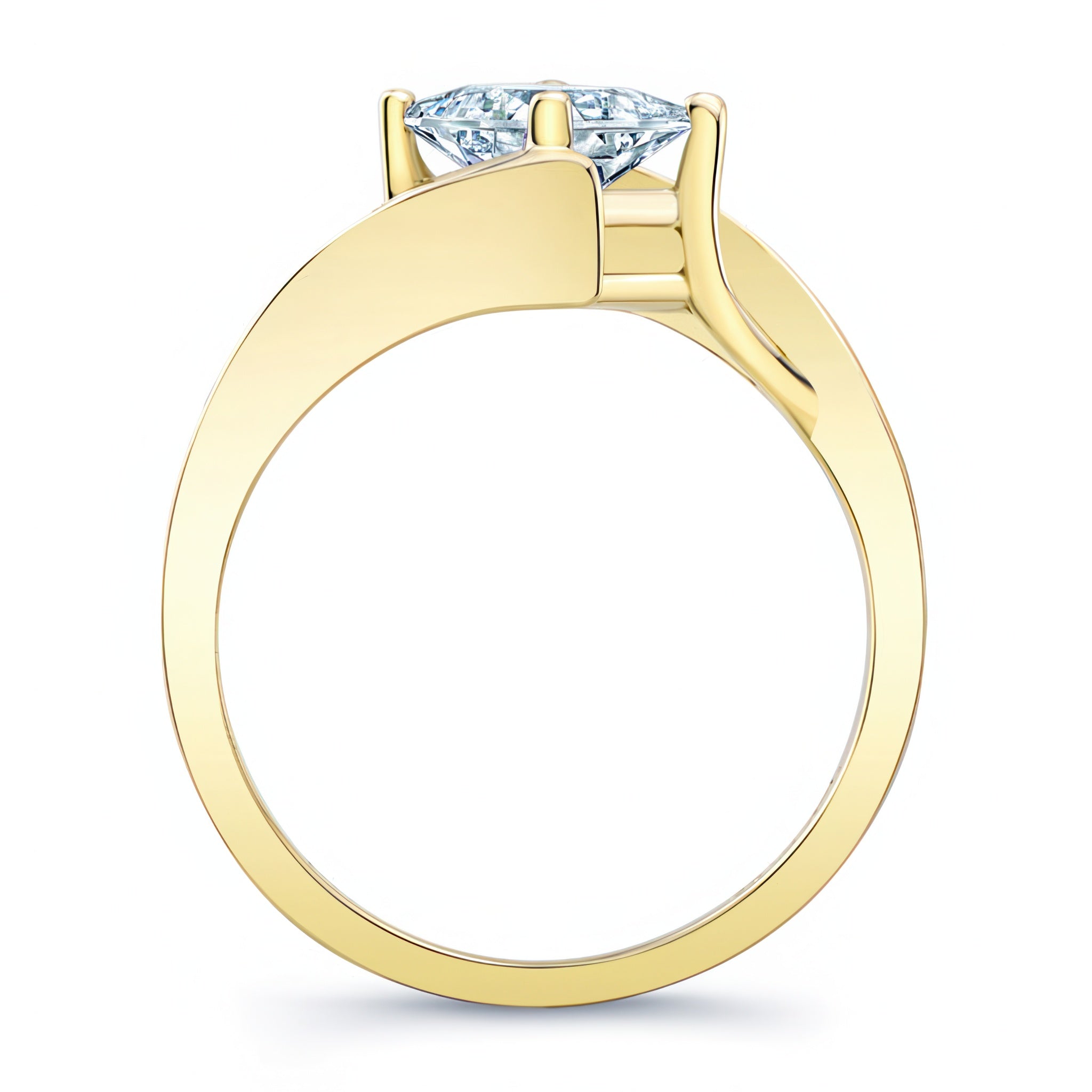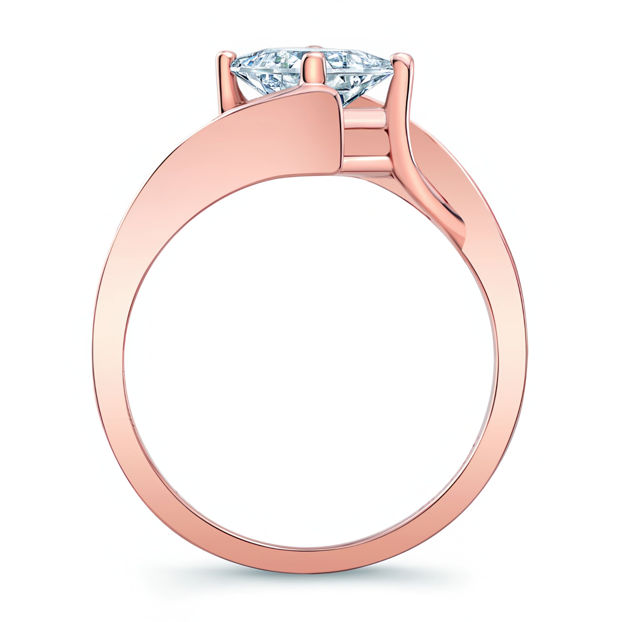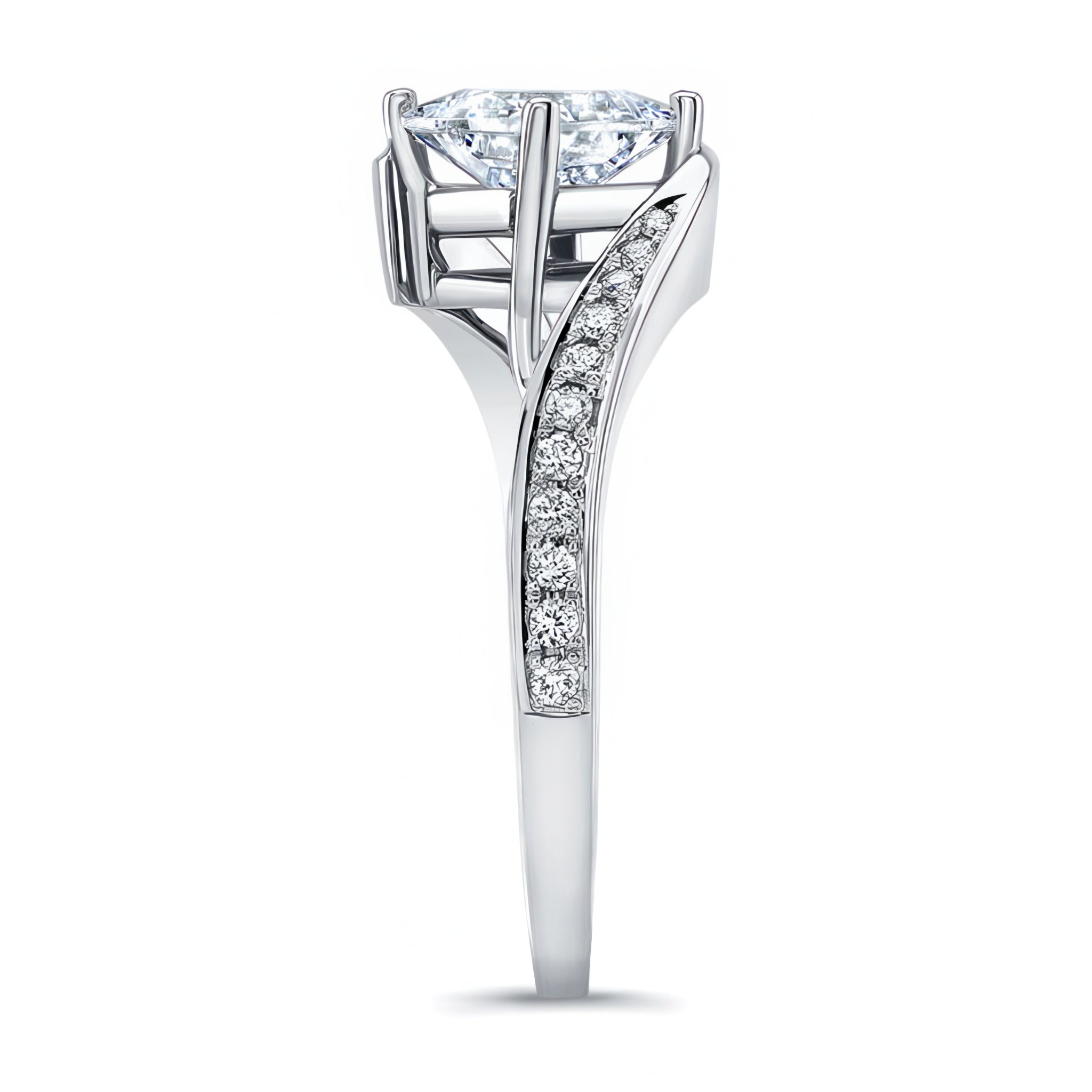 A unique princess cut ring with an elegant design that deviates from the usual. The shoulders are held together using the brilliant center while pave diamonds add the final touch of glamour.