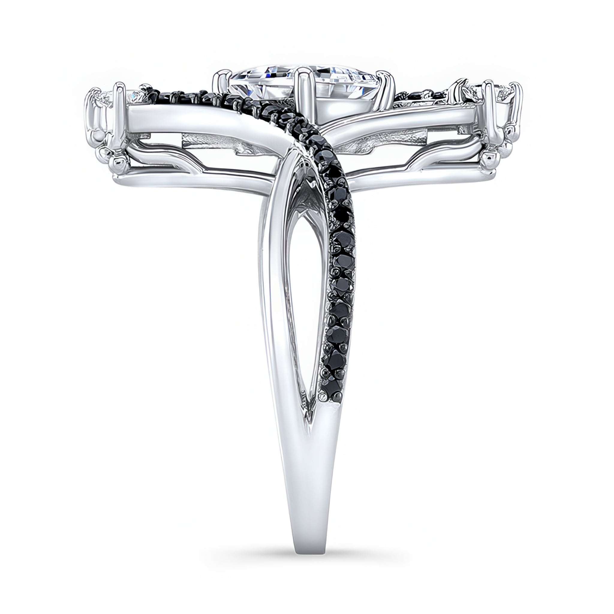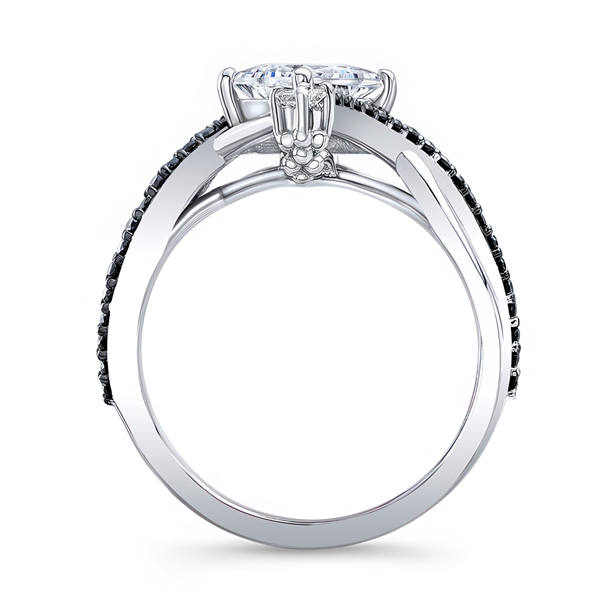 A stunning and unusual princess cut black diamond accent engagement ring. The princess cut center is glorified by two smaller diamonds set at the 12 and 6 o'clock positions with graceful black diamond swirls decorating the sides for a dazzling look down to every last detail.