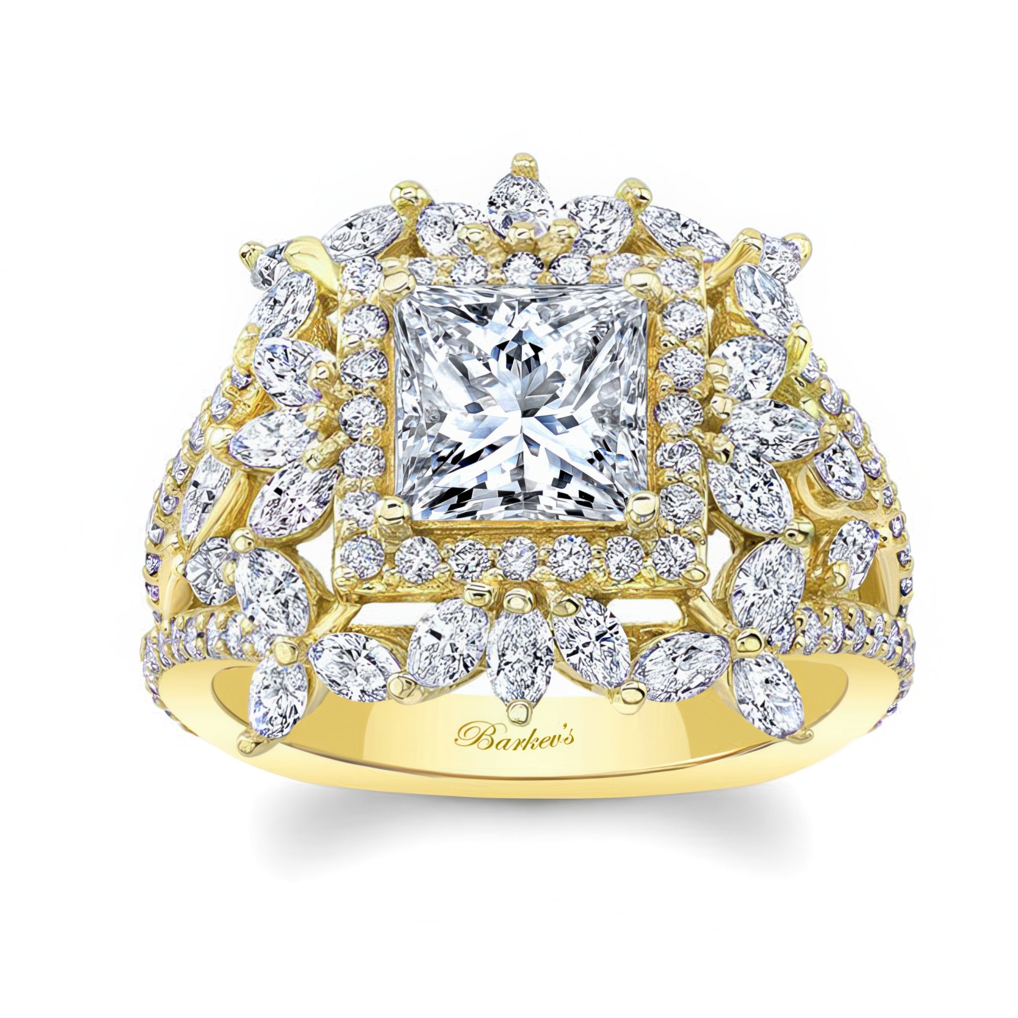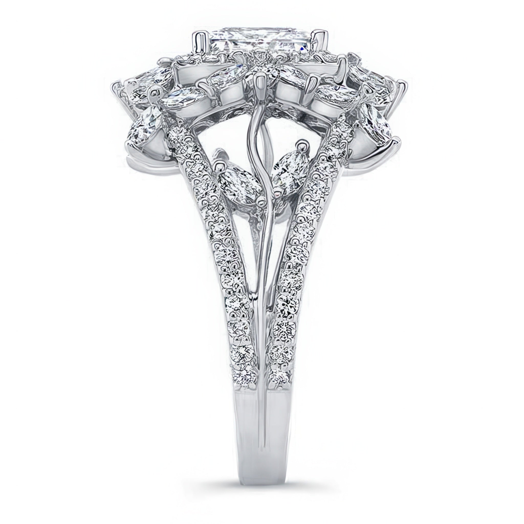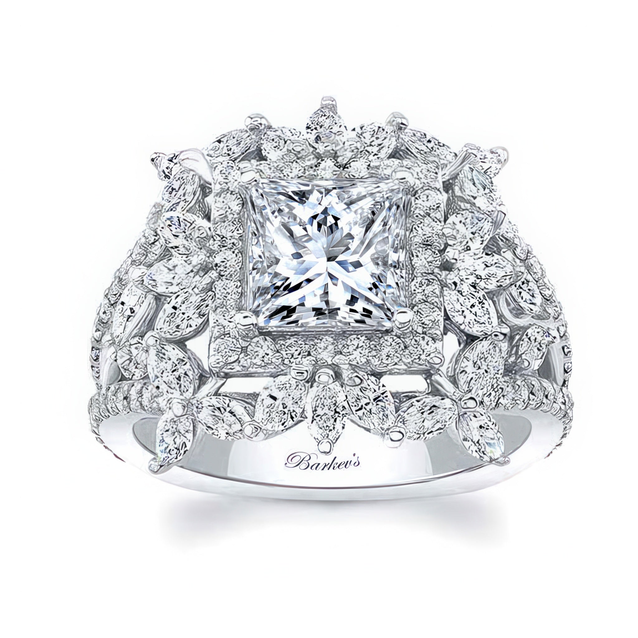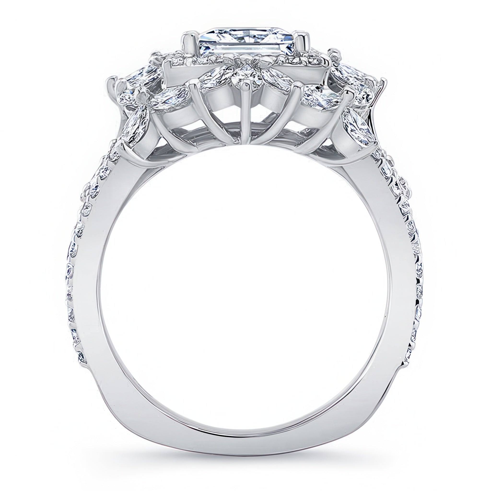 This stunning vintage princess cut diamond ring is a work of art. Featuring a prong set princess cut center with a halo of diamonds artfully encircling it and various marquise and round diamond melees accenting the shoulders for an elegant sophisticated masterpiece.
