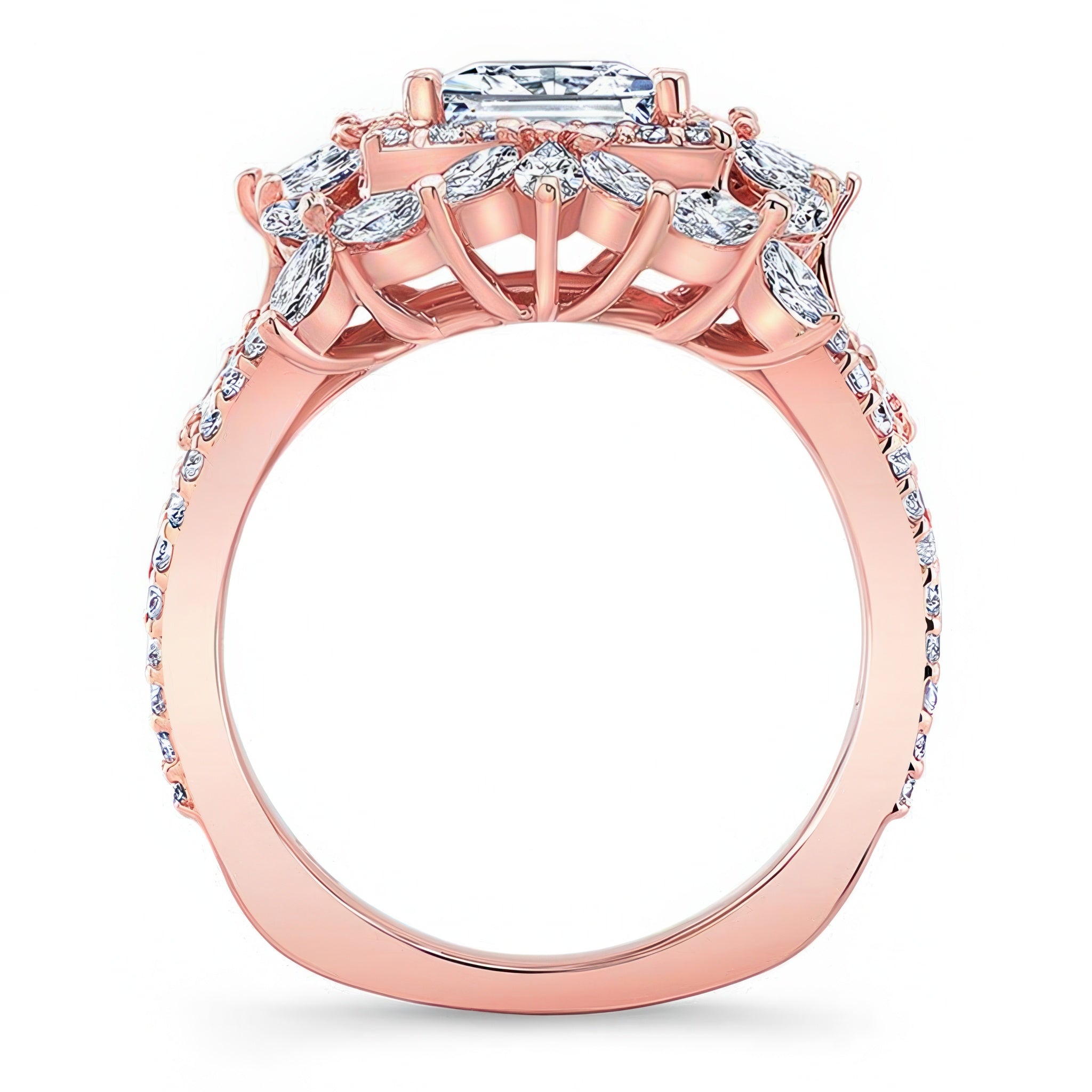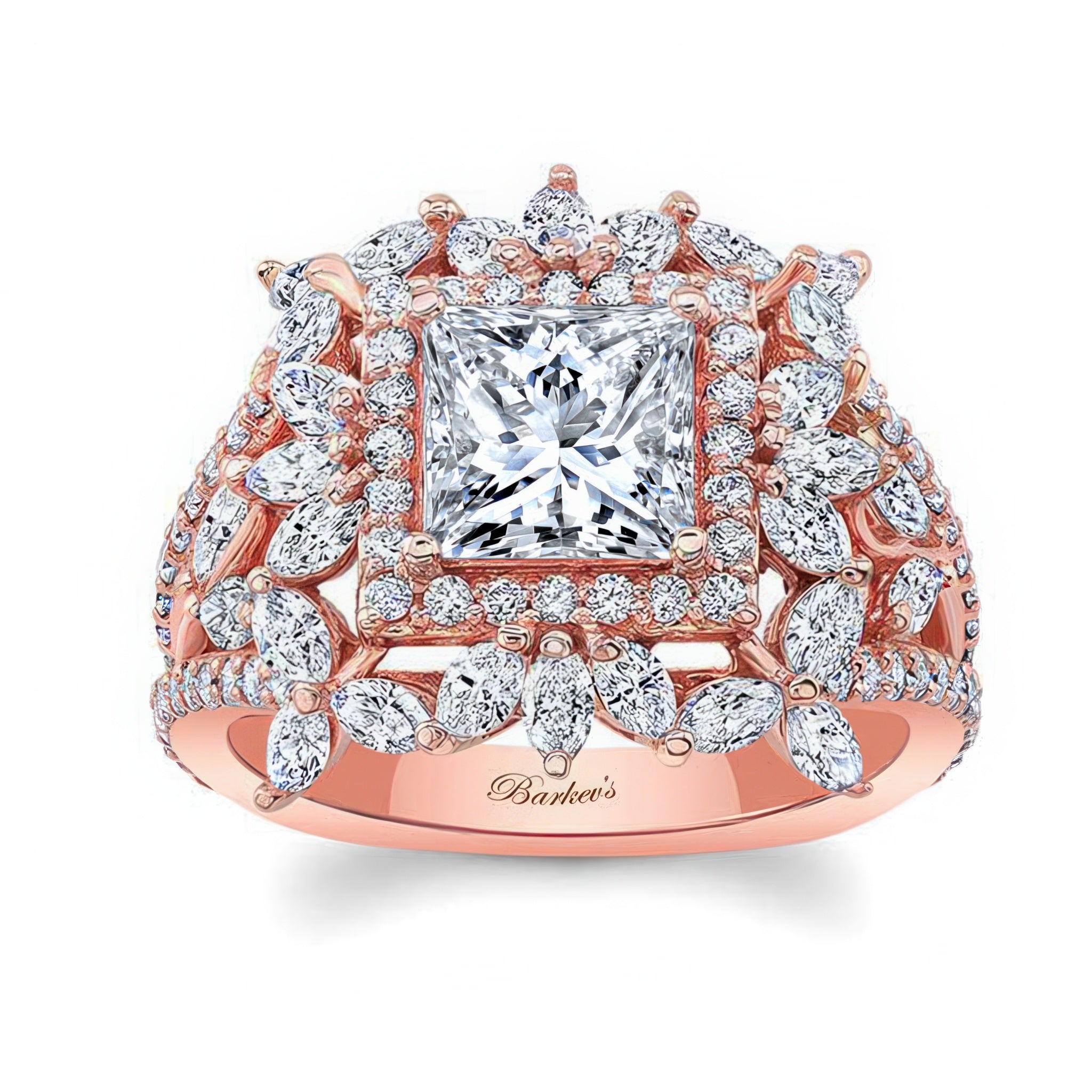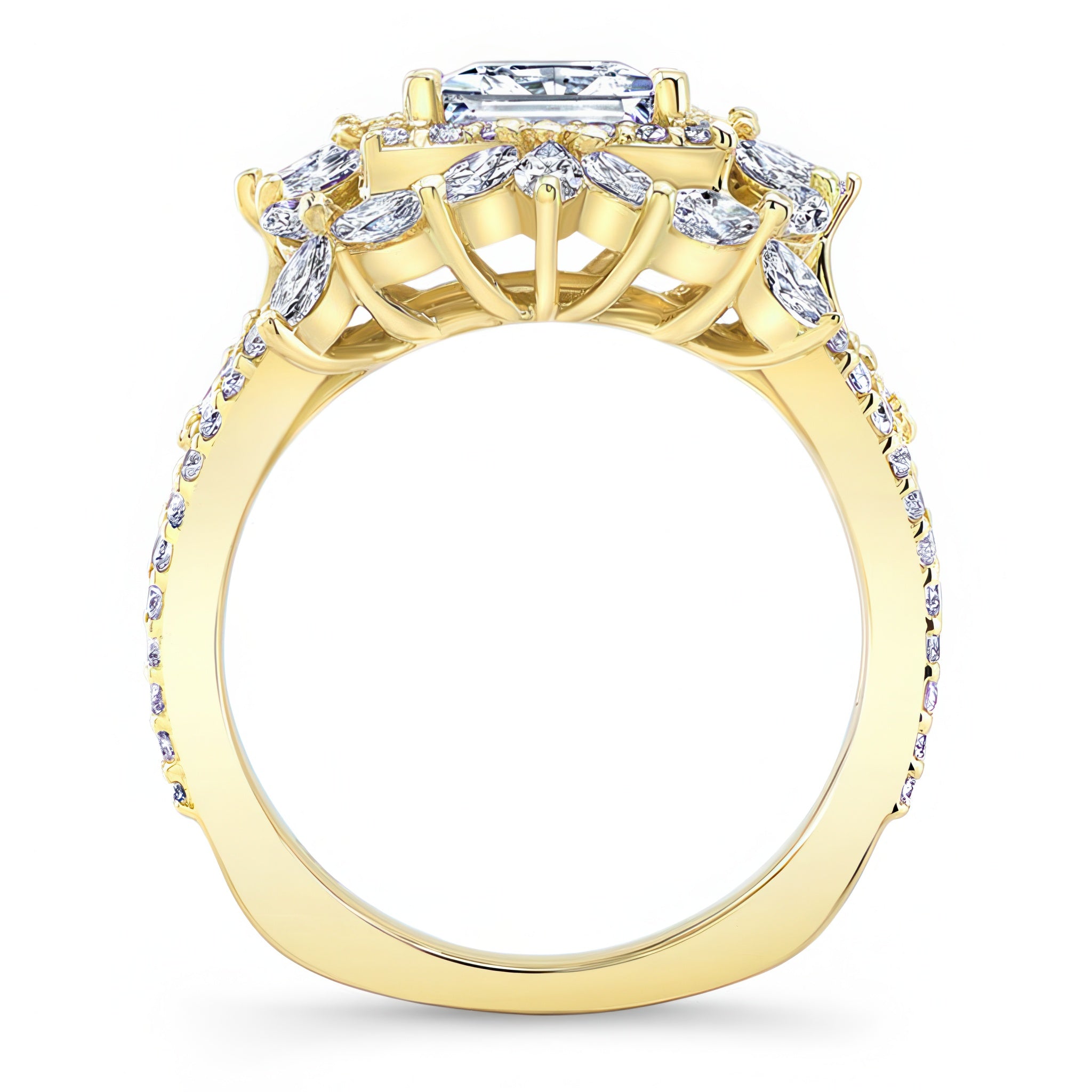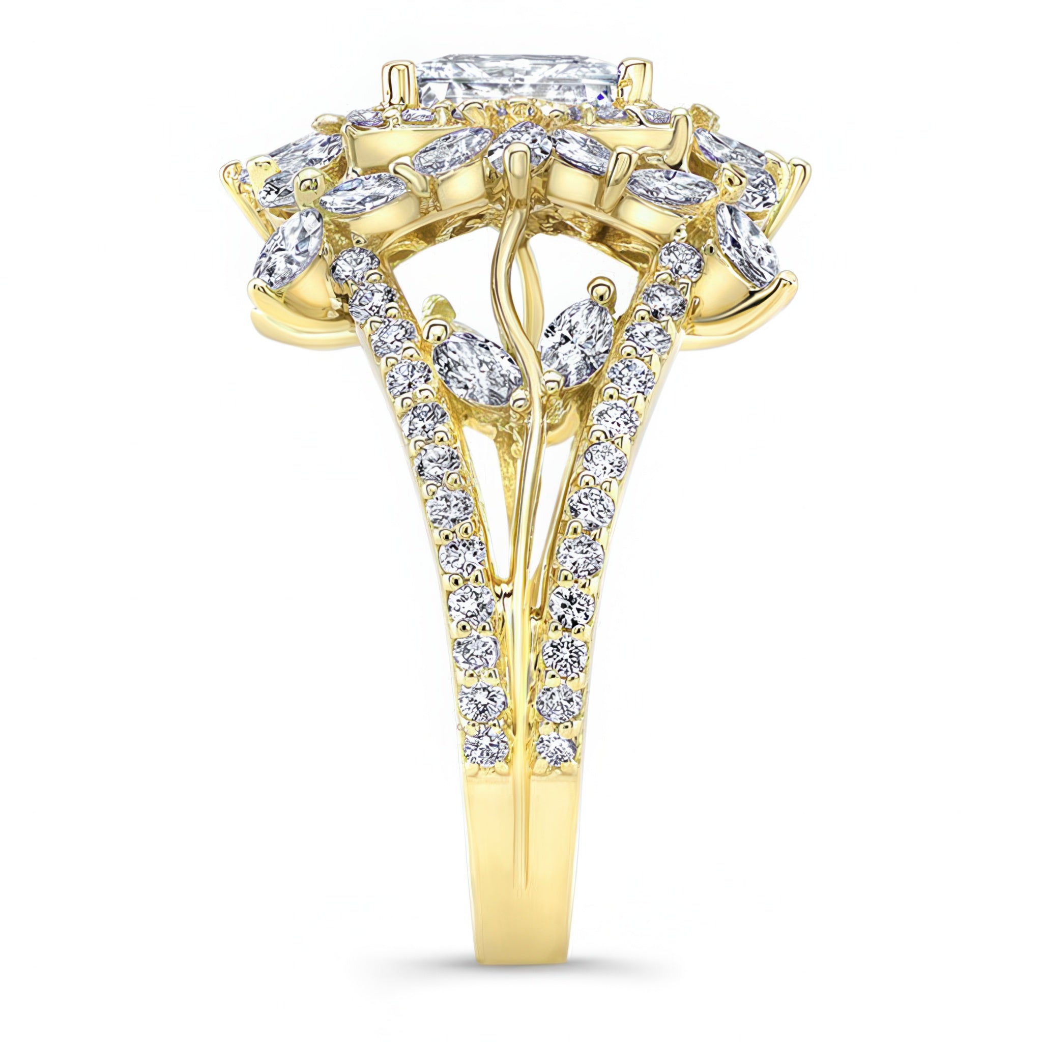 This stunning vintage princess cut diamond ring is a work of art. Featuring a prong set princess cut center with a halo of diamonds artfully encircling it and various marquise and round diamond melees accenting the shoulders for an elegant sophisticated masterpiece.