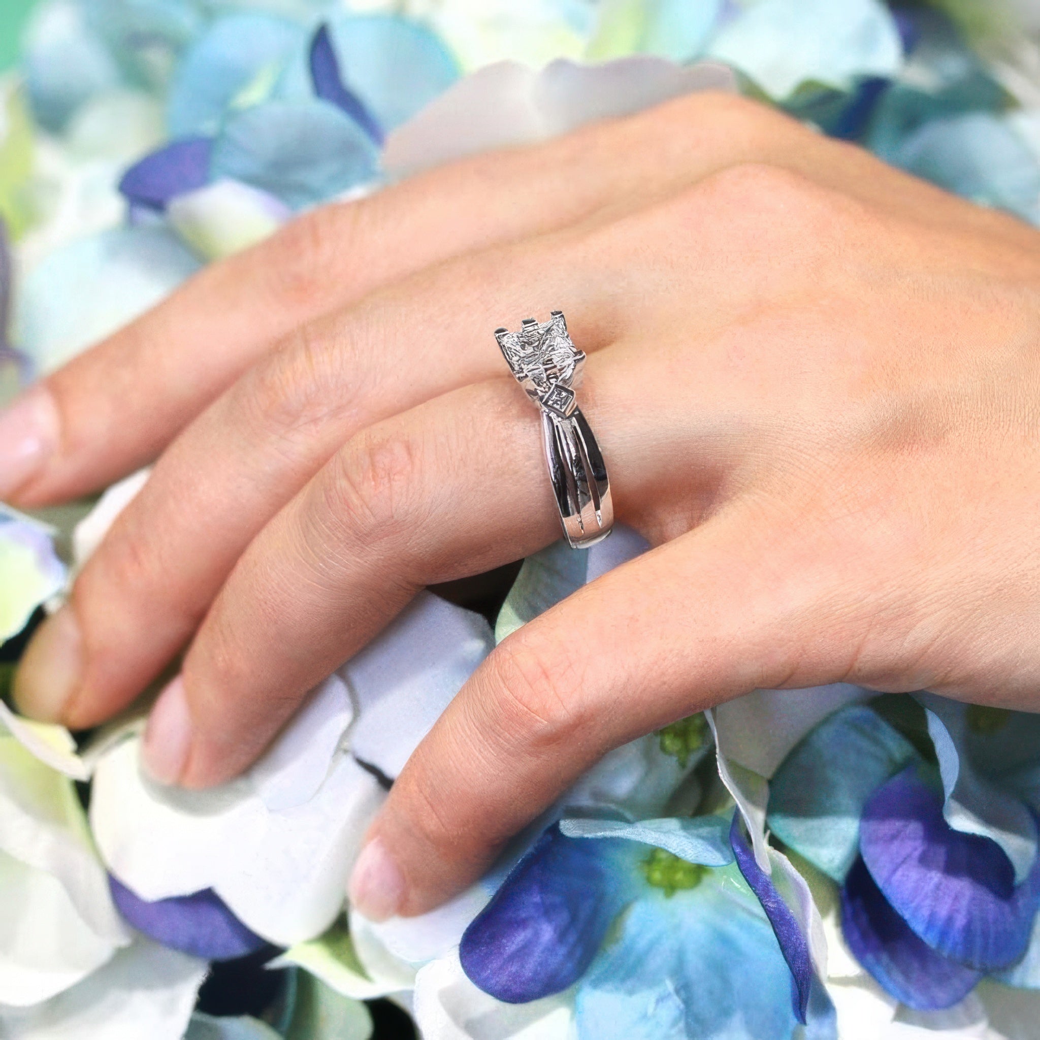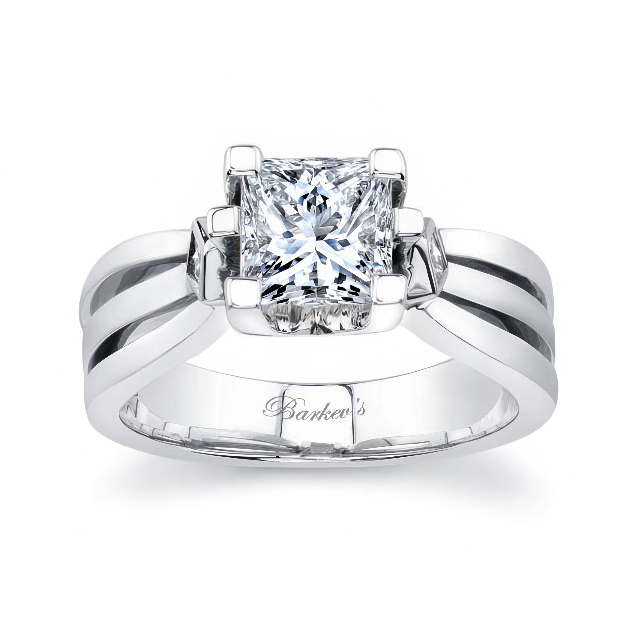 This wide shank ring sports a prong set princess cut center with a 3 way split shank and two smaller bezel set princess cut diamonds framing the sides.