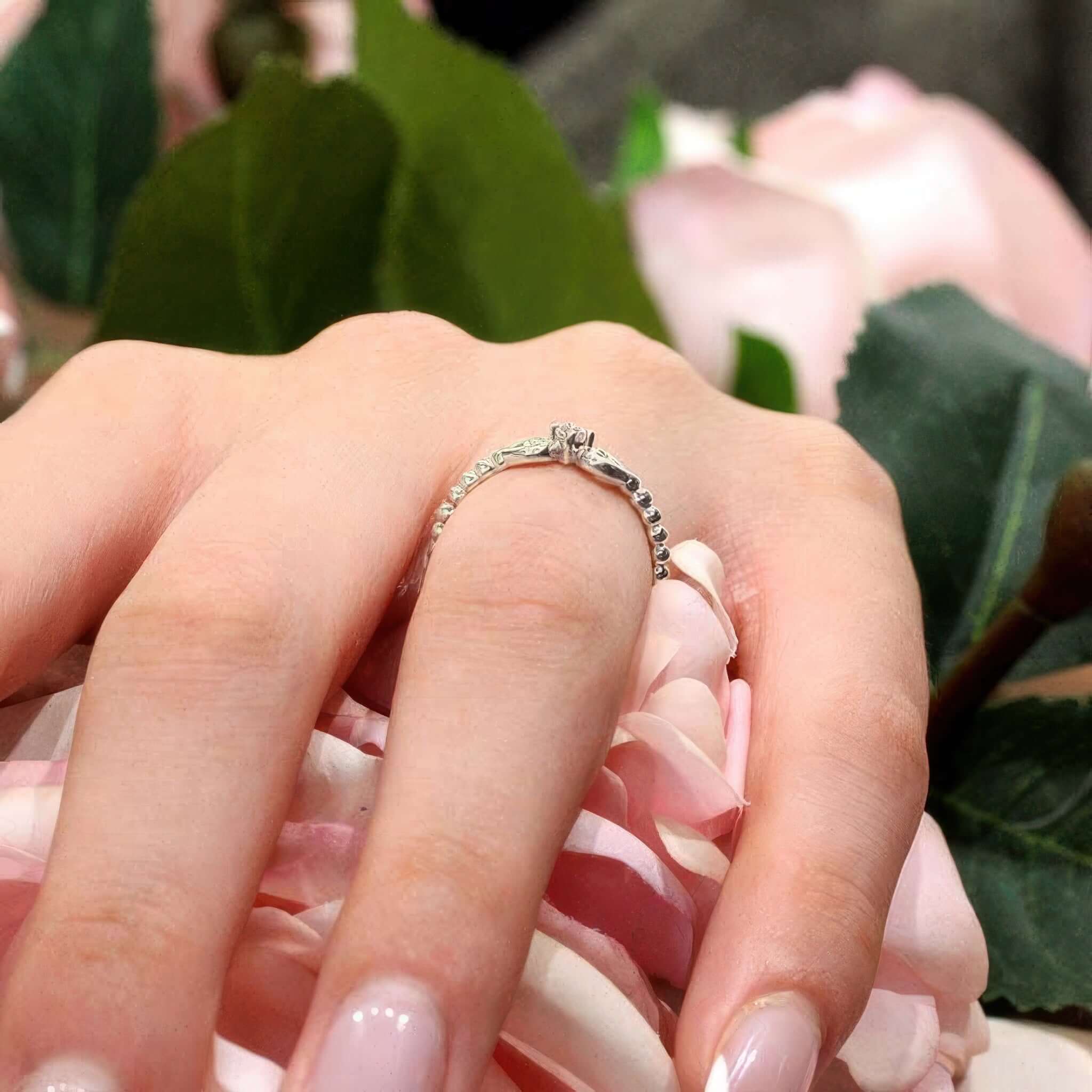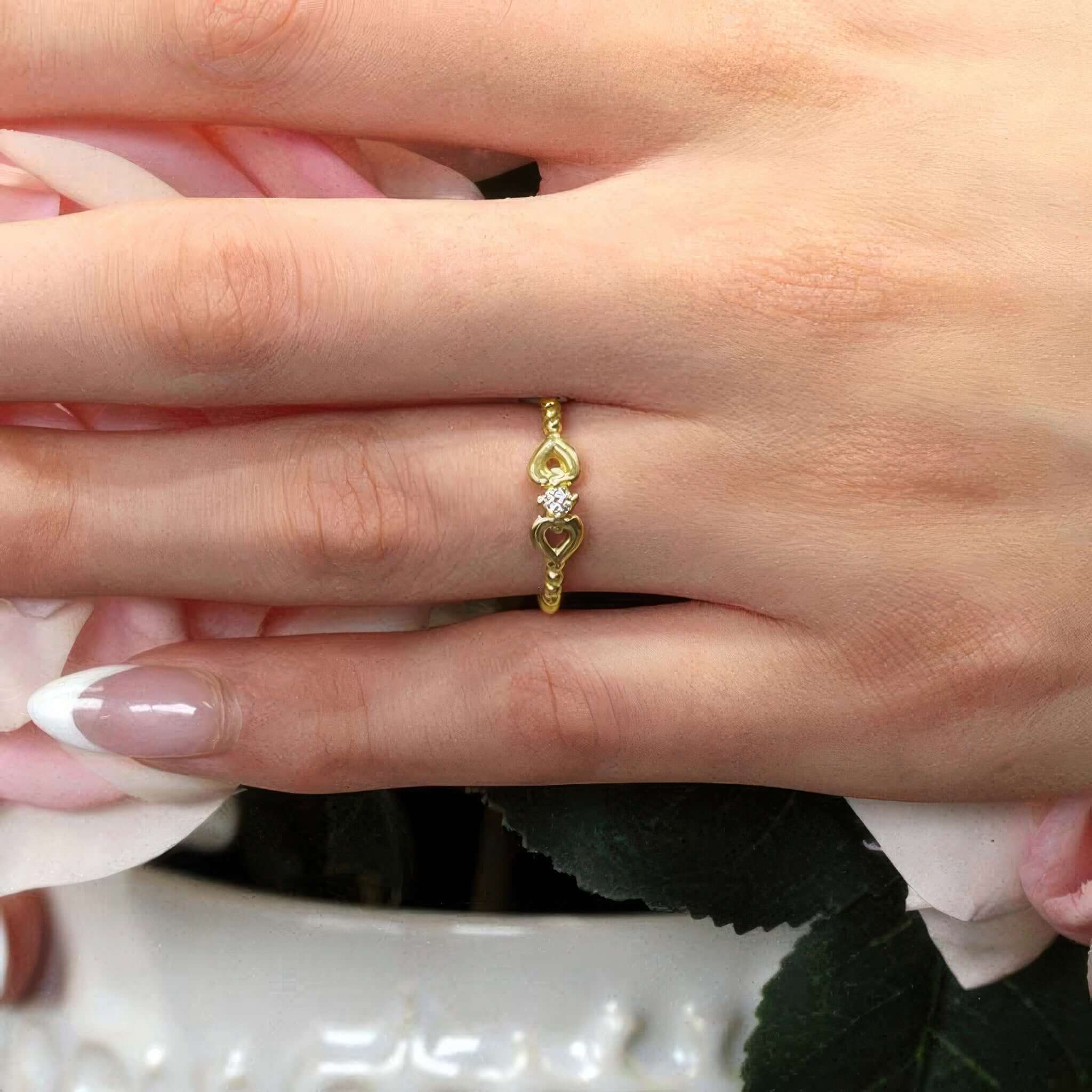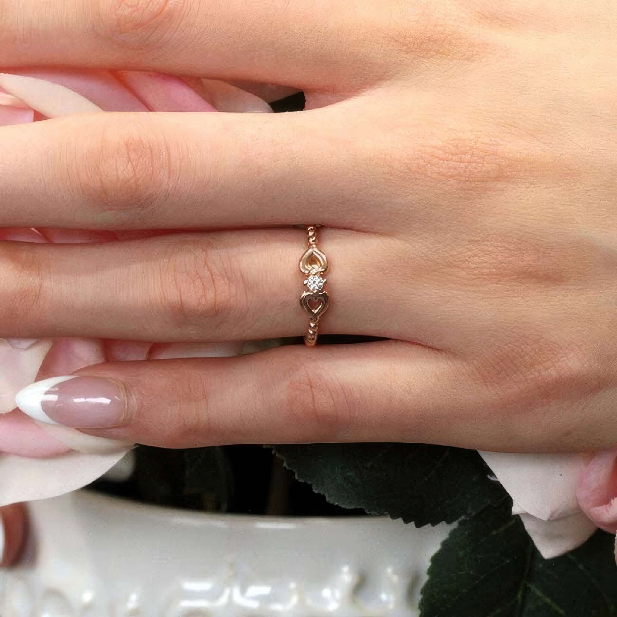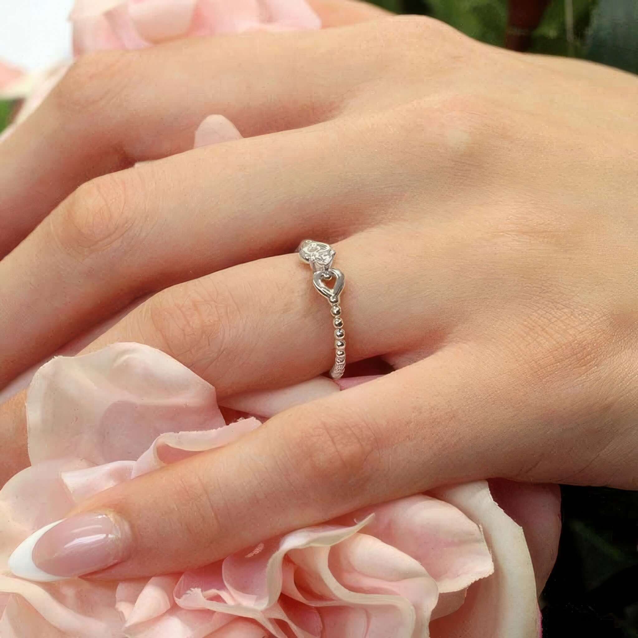 This elegant double heart promise ring features a prong set diamond center with two heart shapes surrounding it and a beaded band for a unique look.