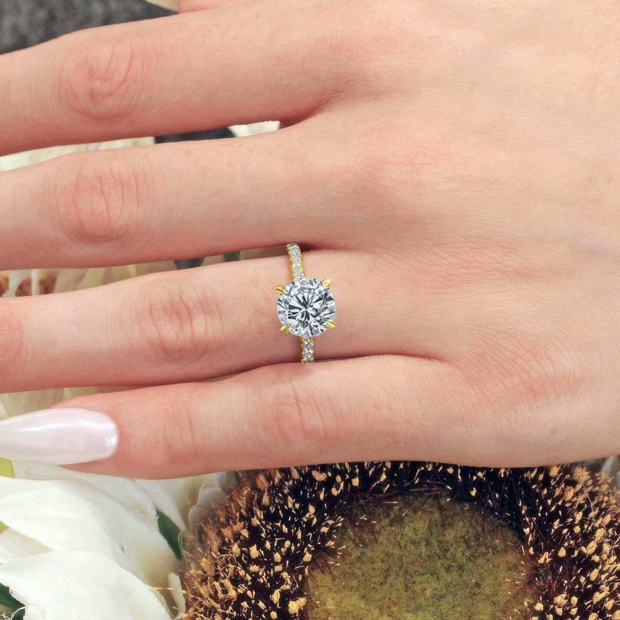 A brilliant 3 carat diamond halo engagement ring featuring a prong set round center with a french cut pave diamond halo underneath it and more diamonds cascading down the shank.
