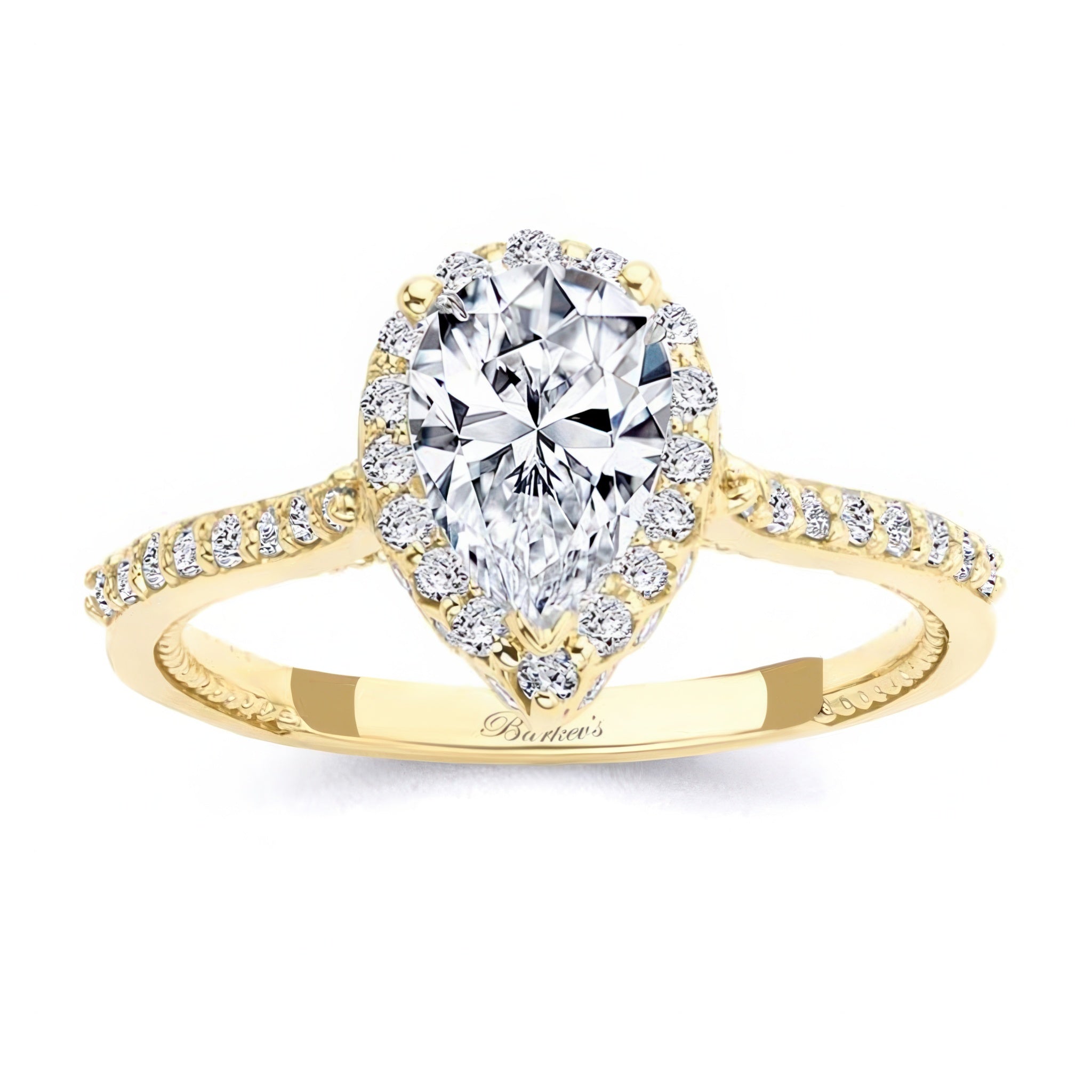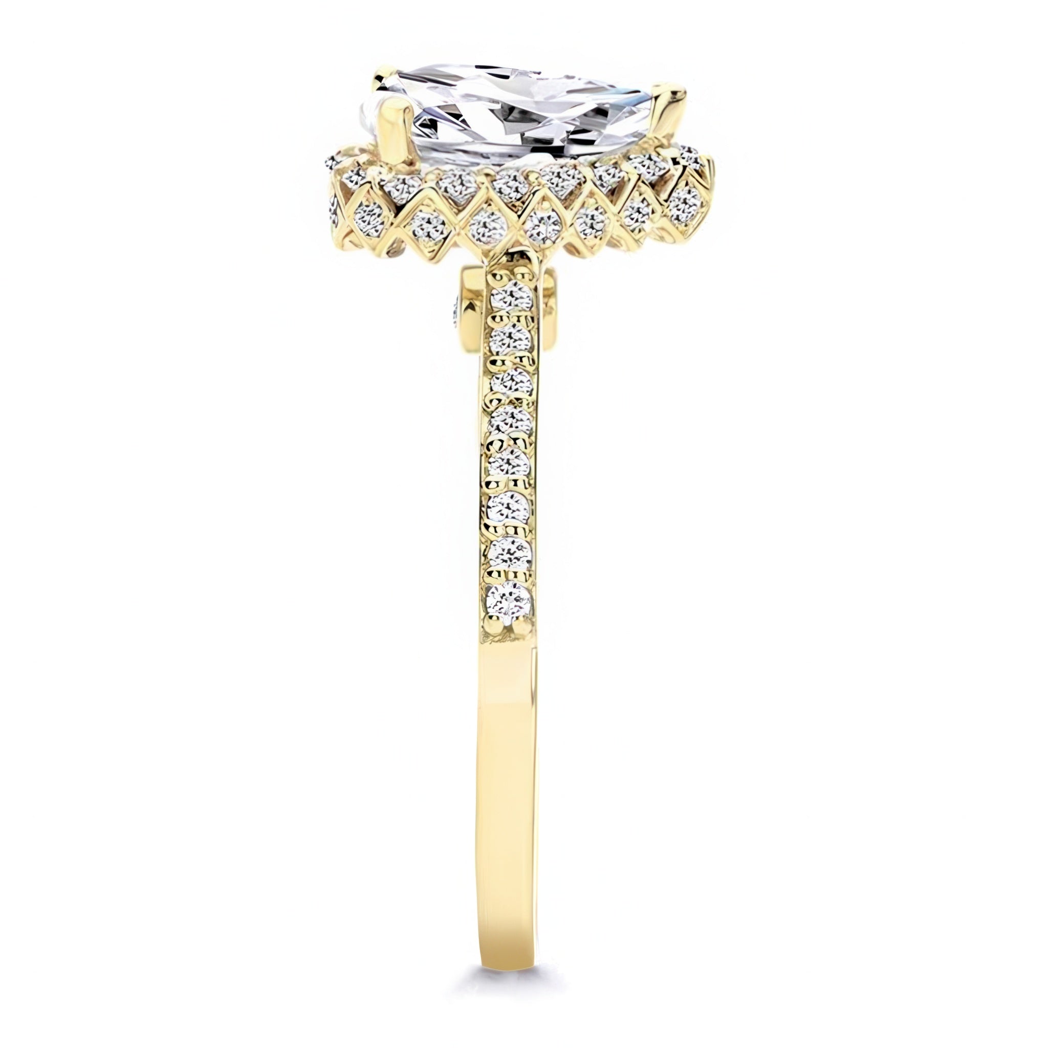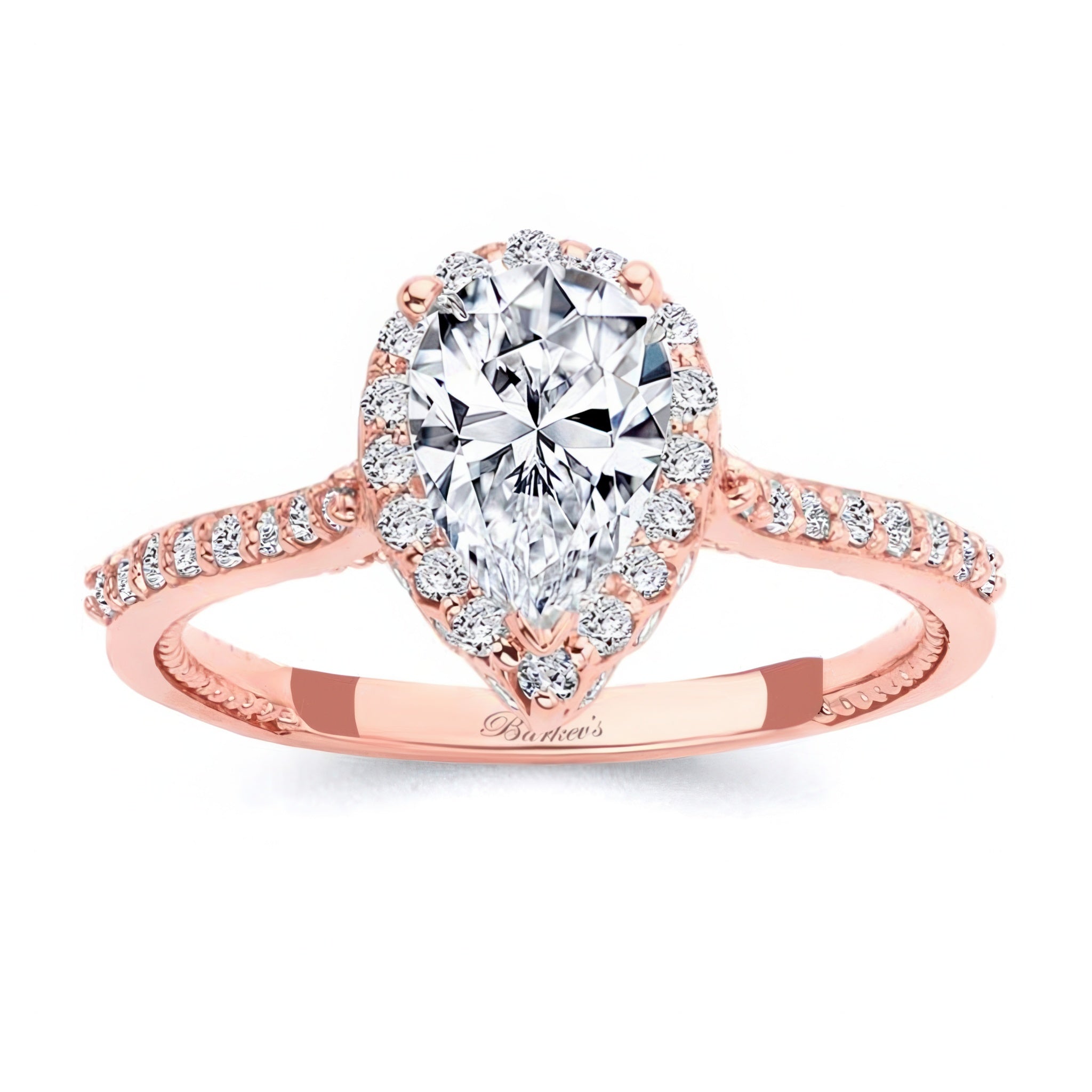 A beautiful pear shaped halo ring featuring a teardrop center surrounded by diamonds with melees flowing down the shank. The profile view reveals a second set of diamonds surrounding the center from underneath with two bezel set diamonds that give this ring a distinct look.