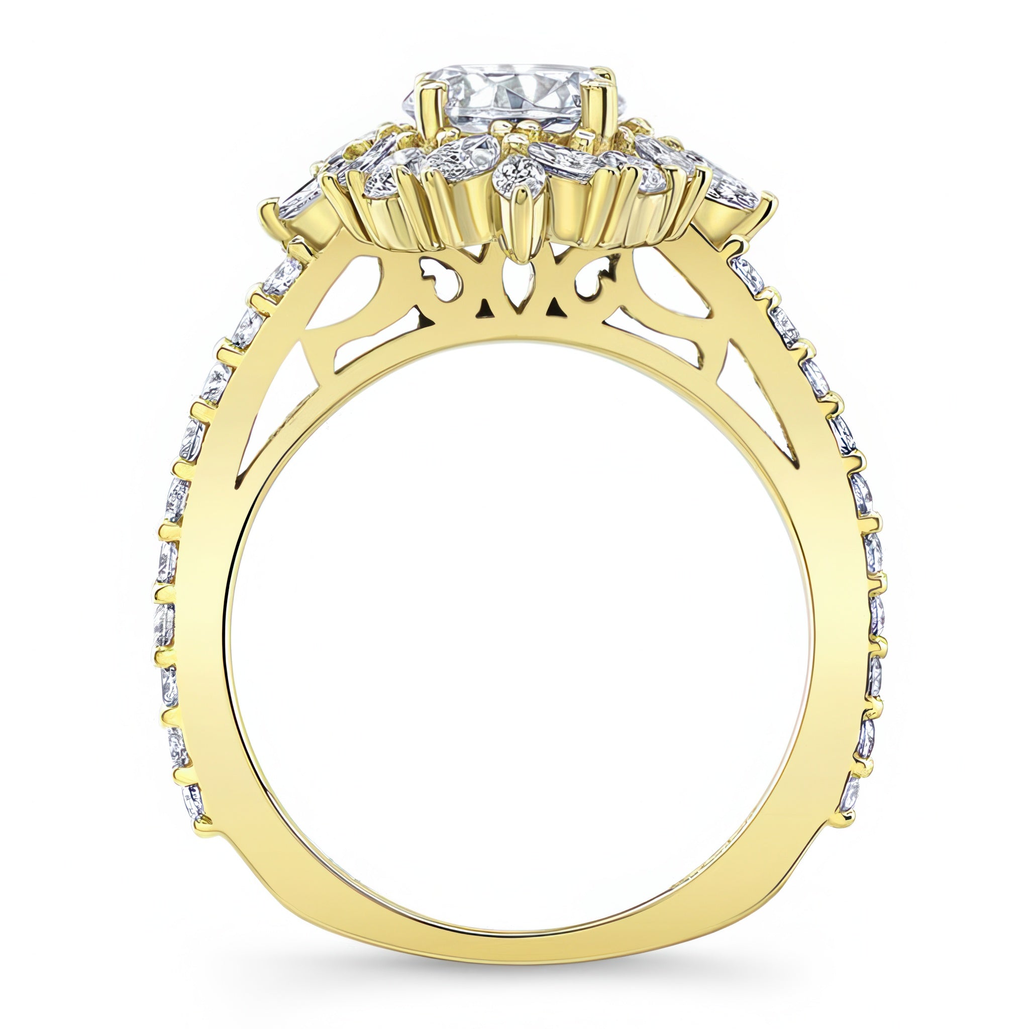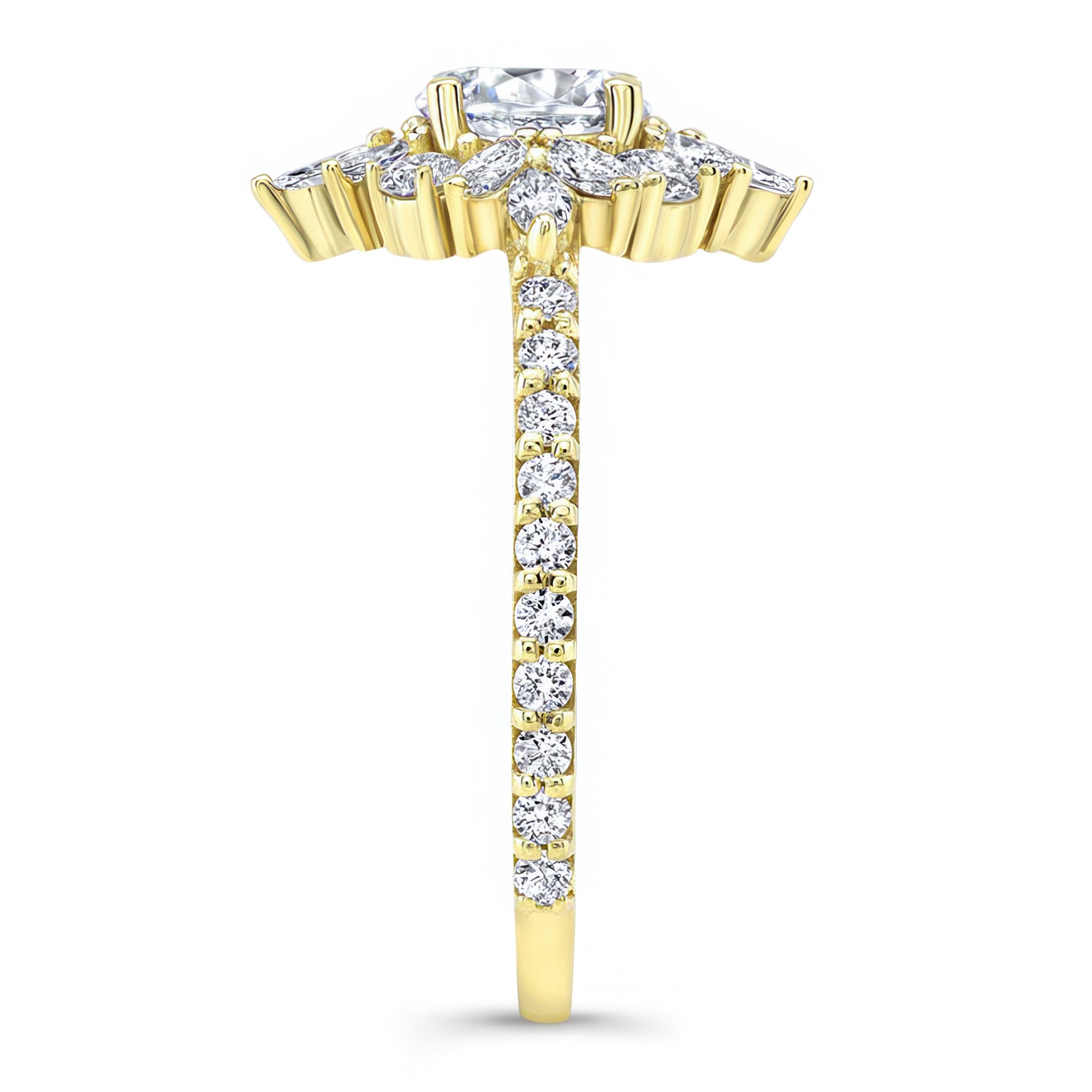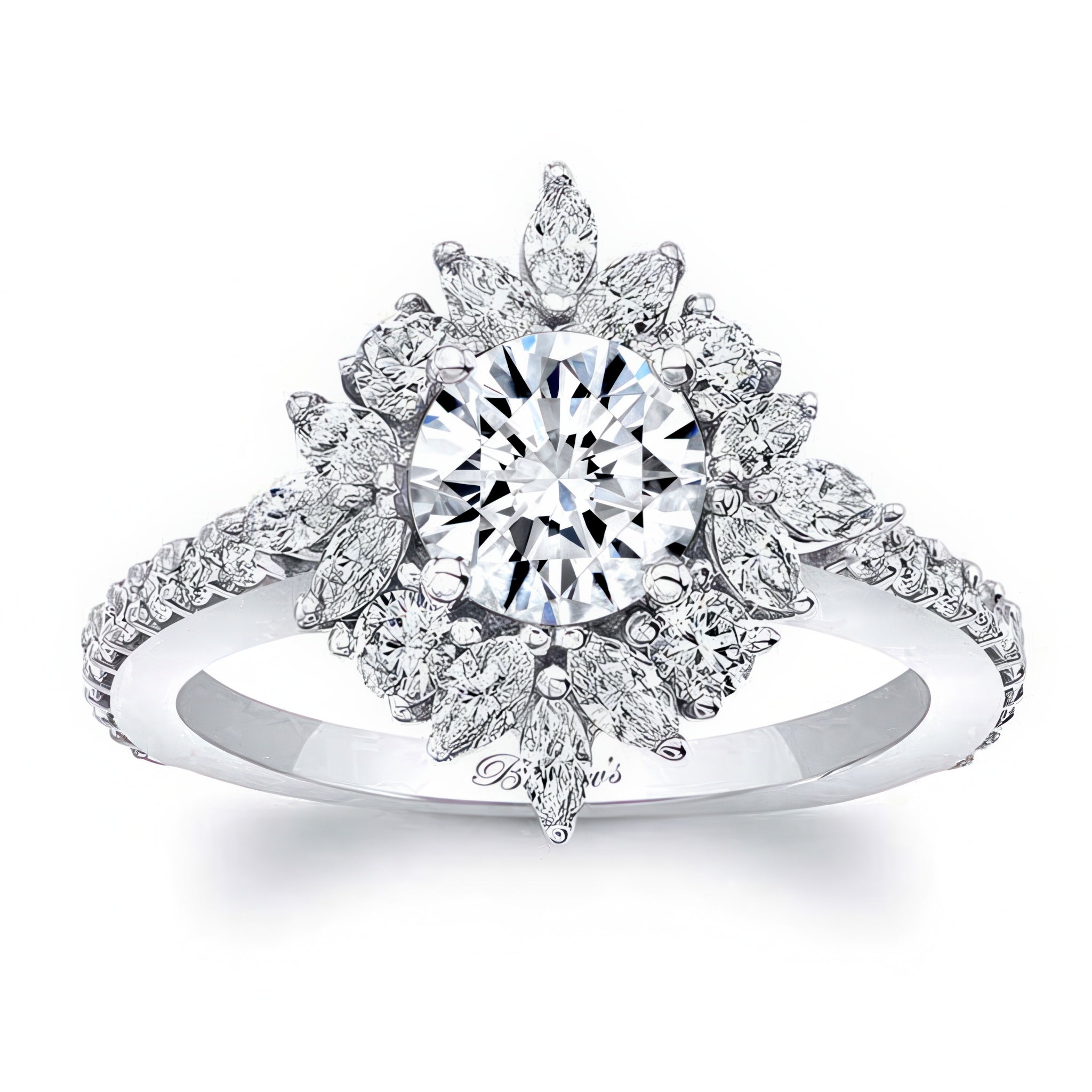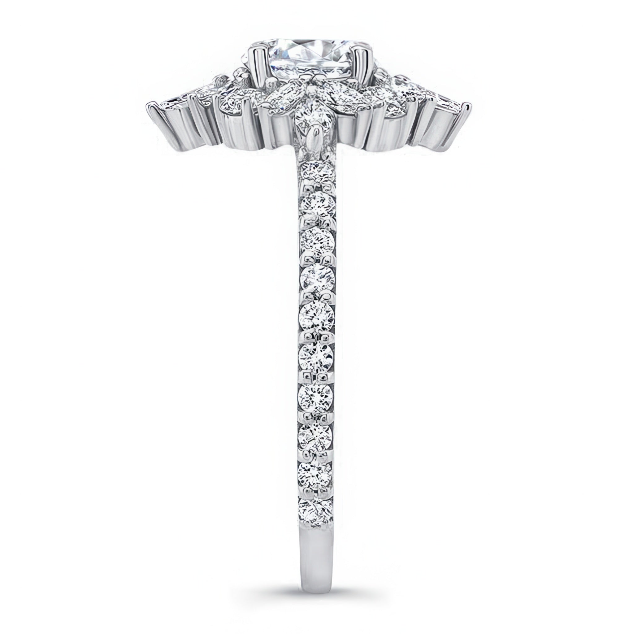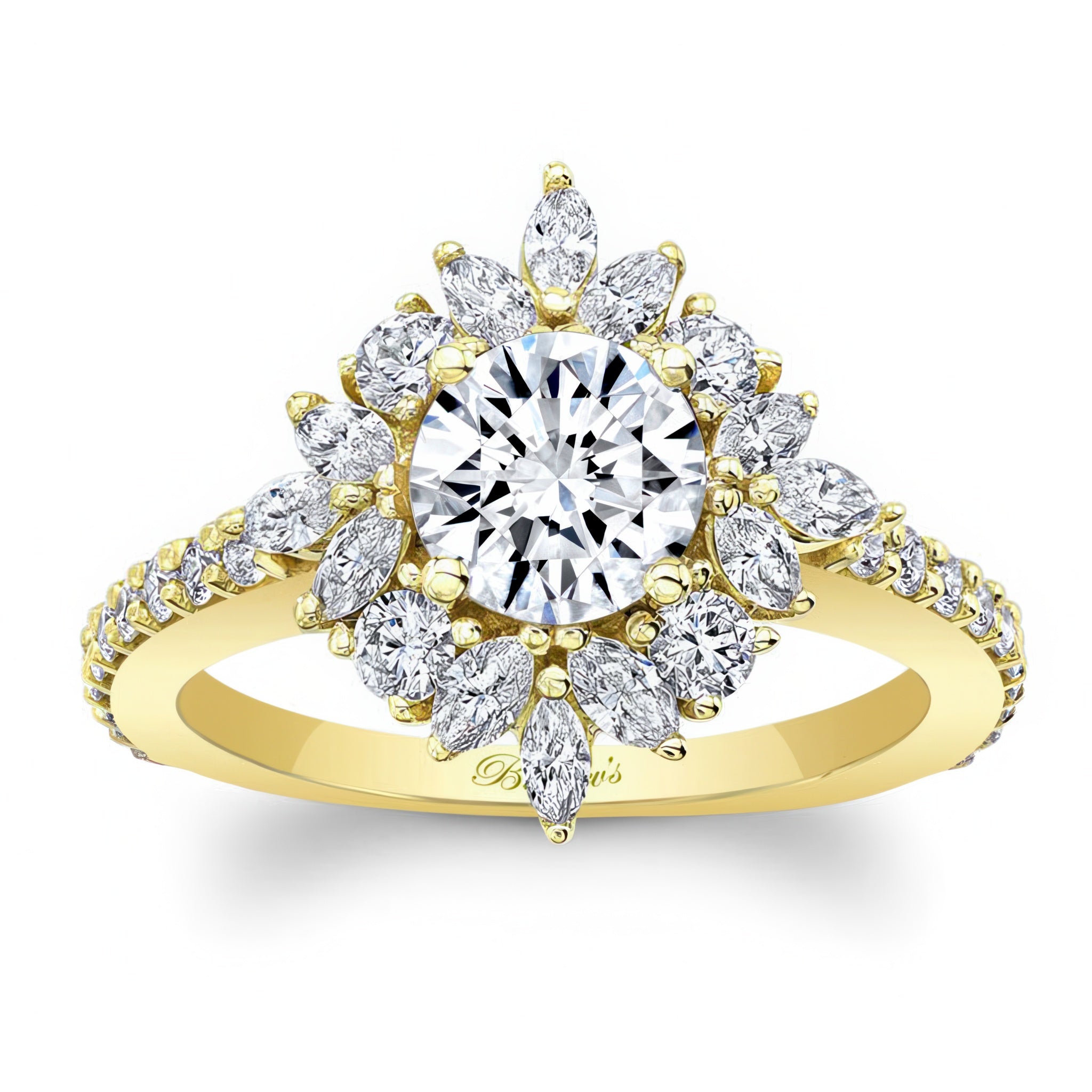 This marquise halo engagement ring features a prong set round center artfully encircled with marquise and round melees, while shared prong set diamonds grace the shoulders for a timeless look.