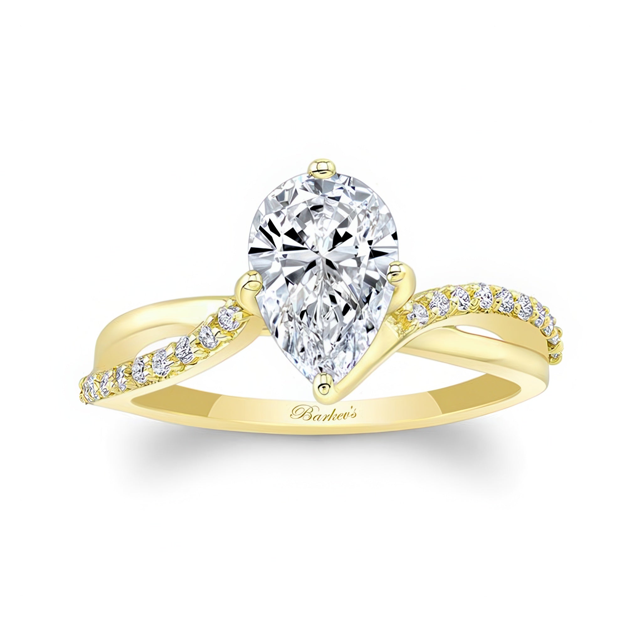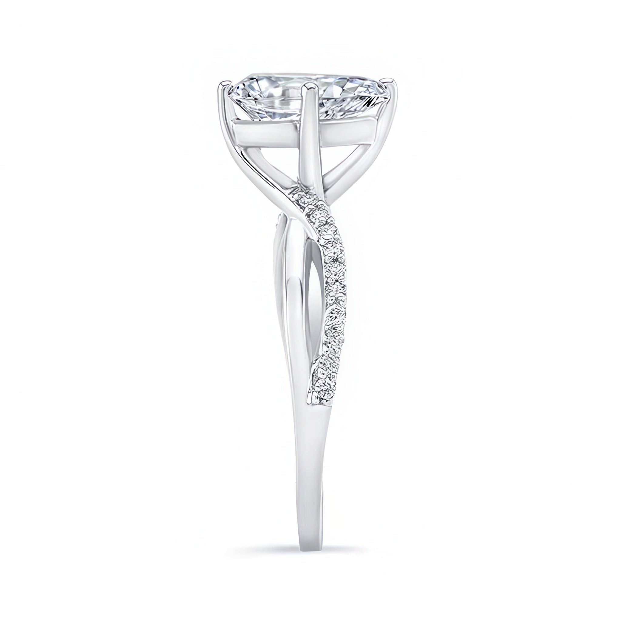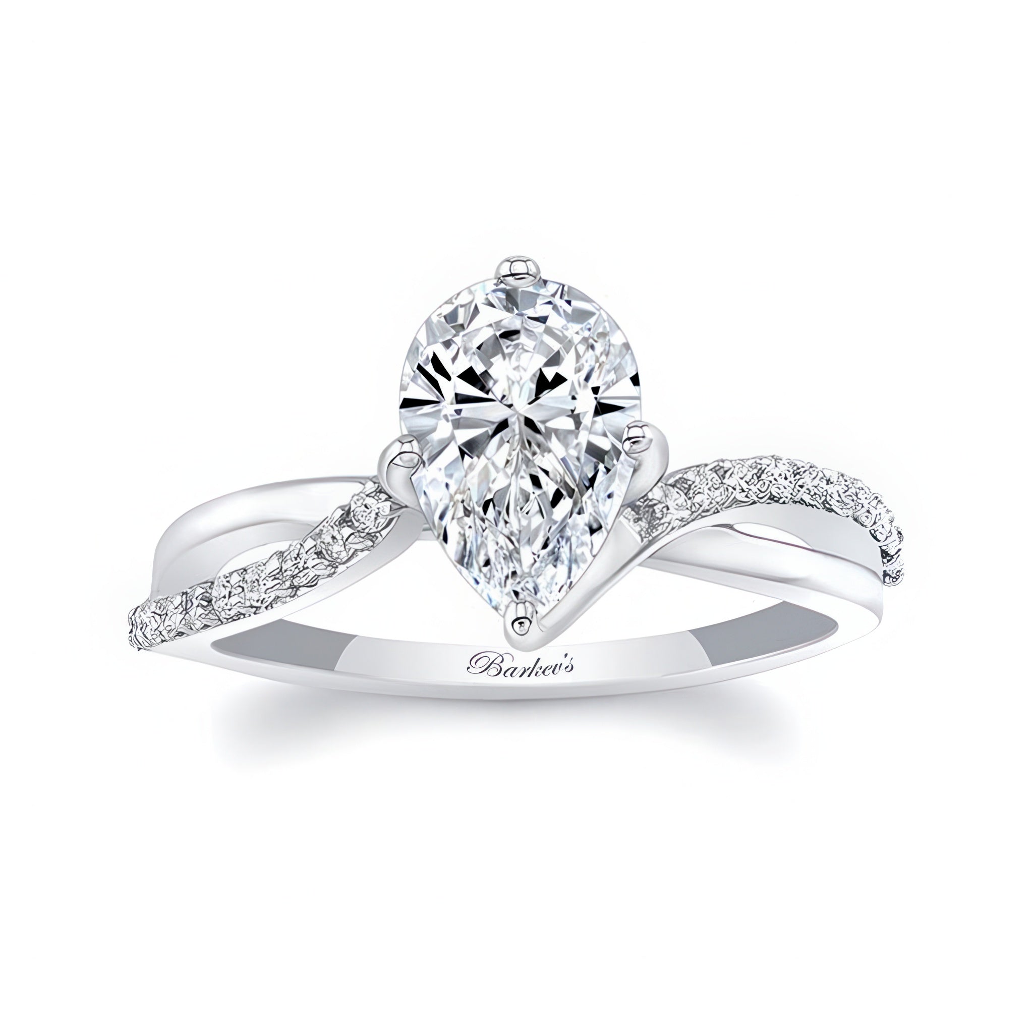 This pear shaped engagement ring with twisted band features open curving shoulders sweeping up to create the prongs that hold the almond shaped center while the opposing sides of the shank are adorned with shared-prong set diamonds for a subtle sparkle that will draw the eye.