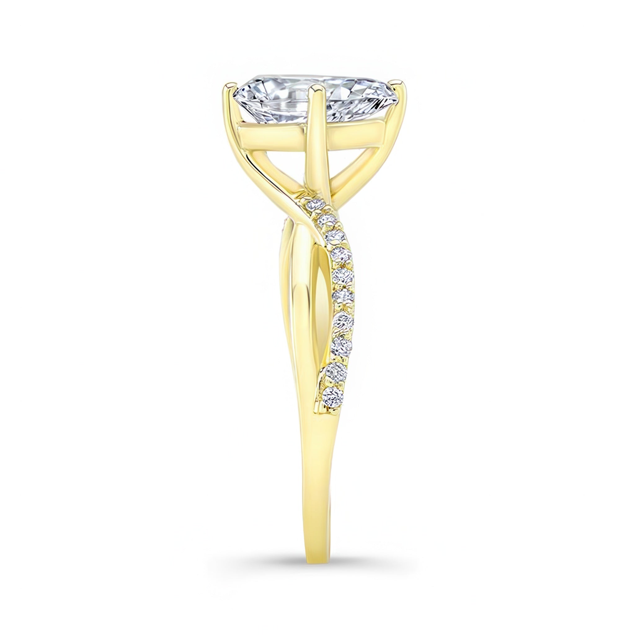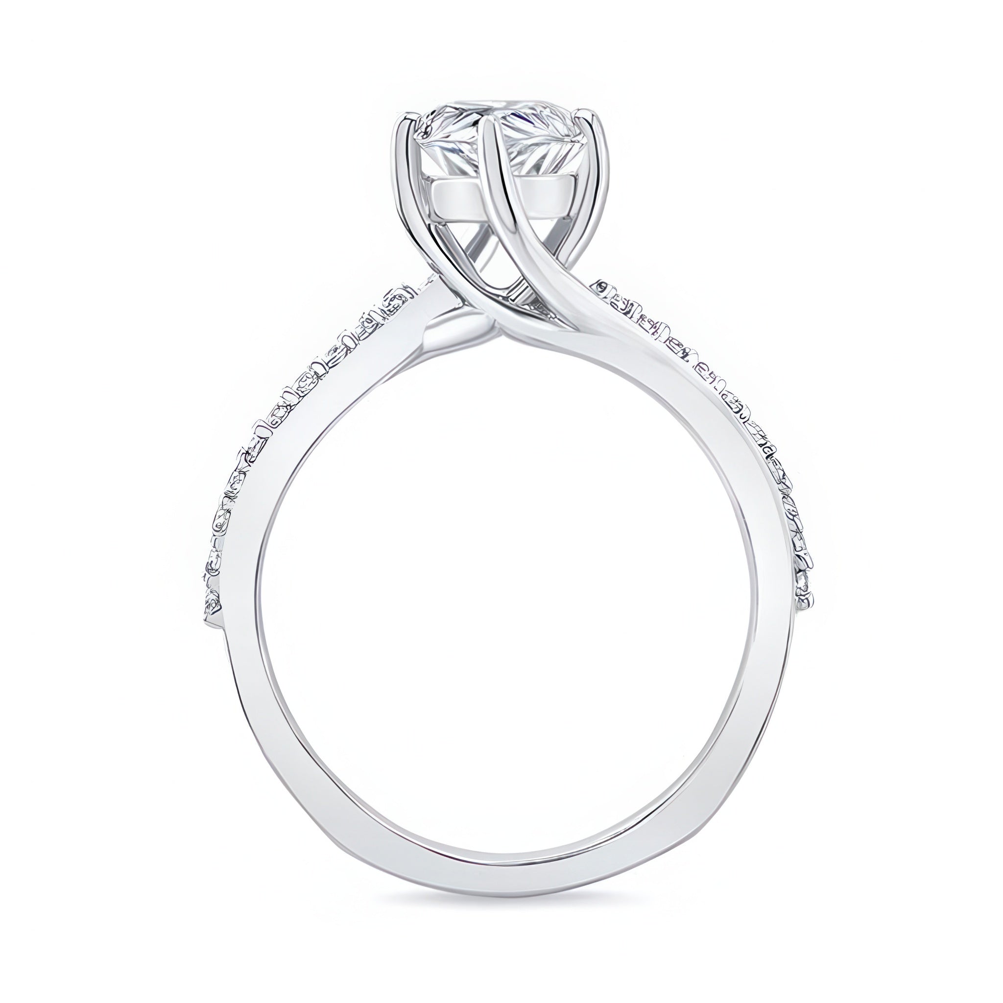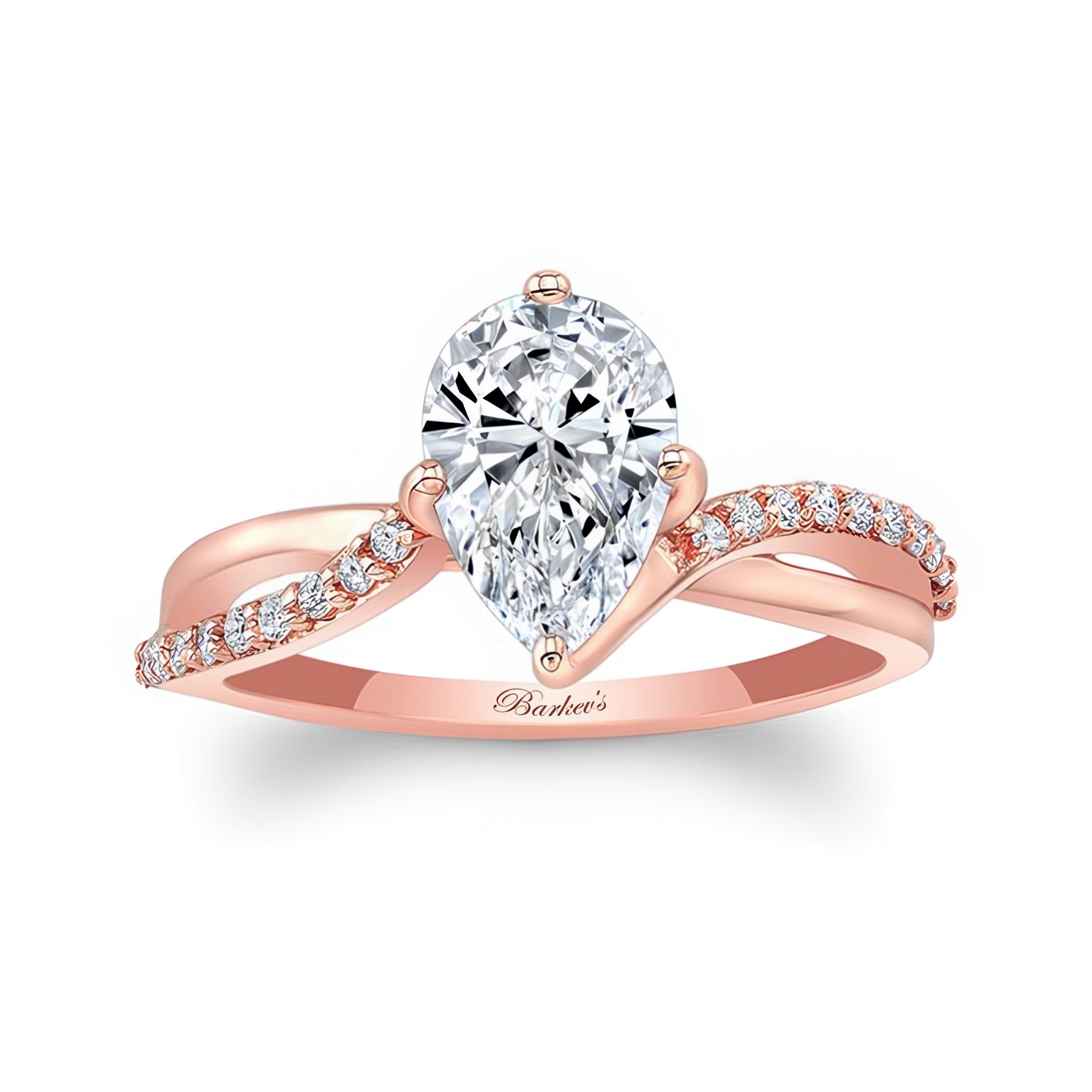 This pear shaped engagement ring with twisted band features open curving shoulders sweeping up to create the prongs that hold the almond shaped center while the opposing sides of the shank are adorned with shared-prong set diamonds for a subtle sparkle that will draw the eye.