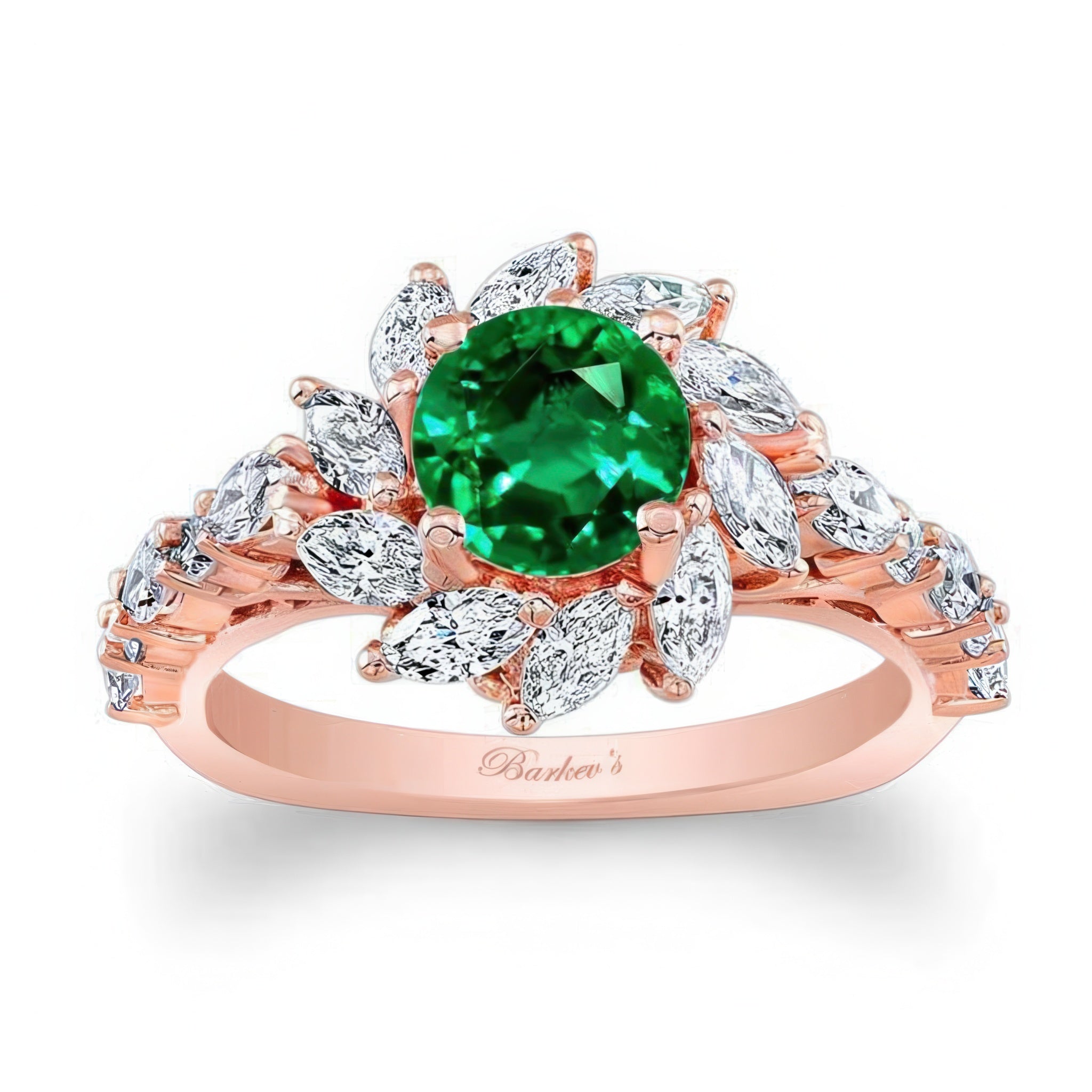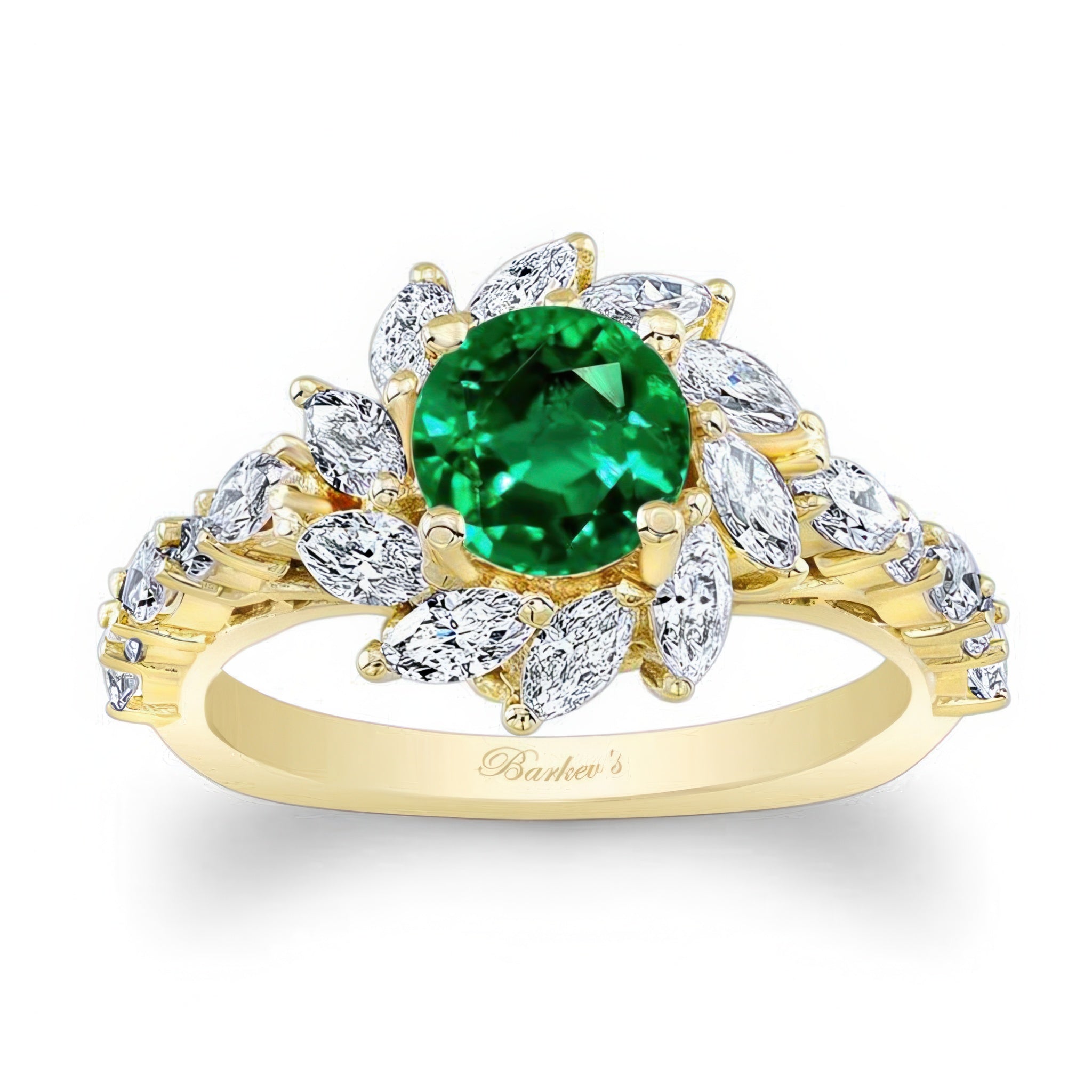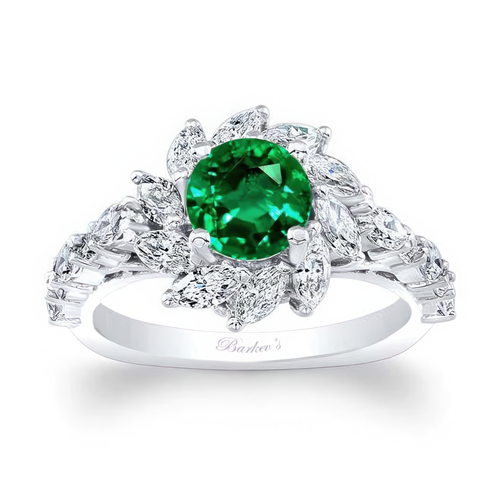 This emerald and diamond sunflower engagement ring features a prong set round center encircled with a halo of flaring fancy cut marquise diamonds. The narrow shank is adorned with alternating round and marquise cut diamonds for an elegant finishing touch sure to be admired by everyone who sees it.