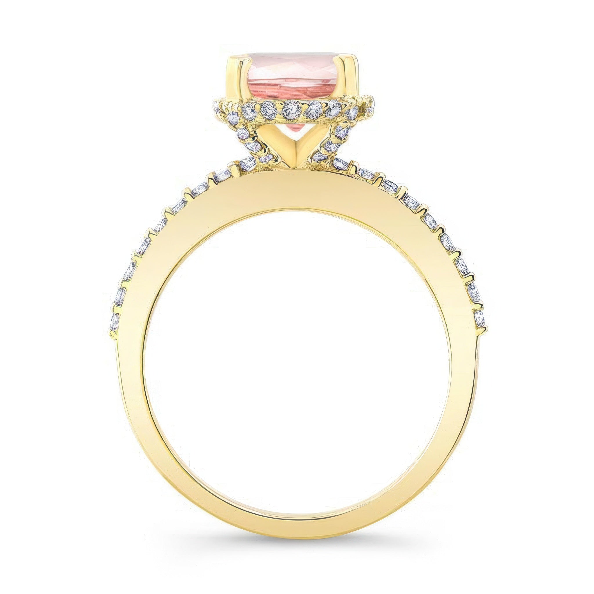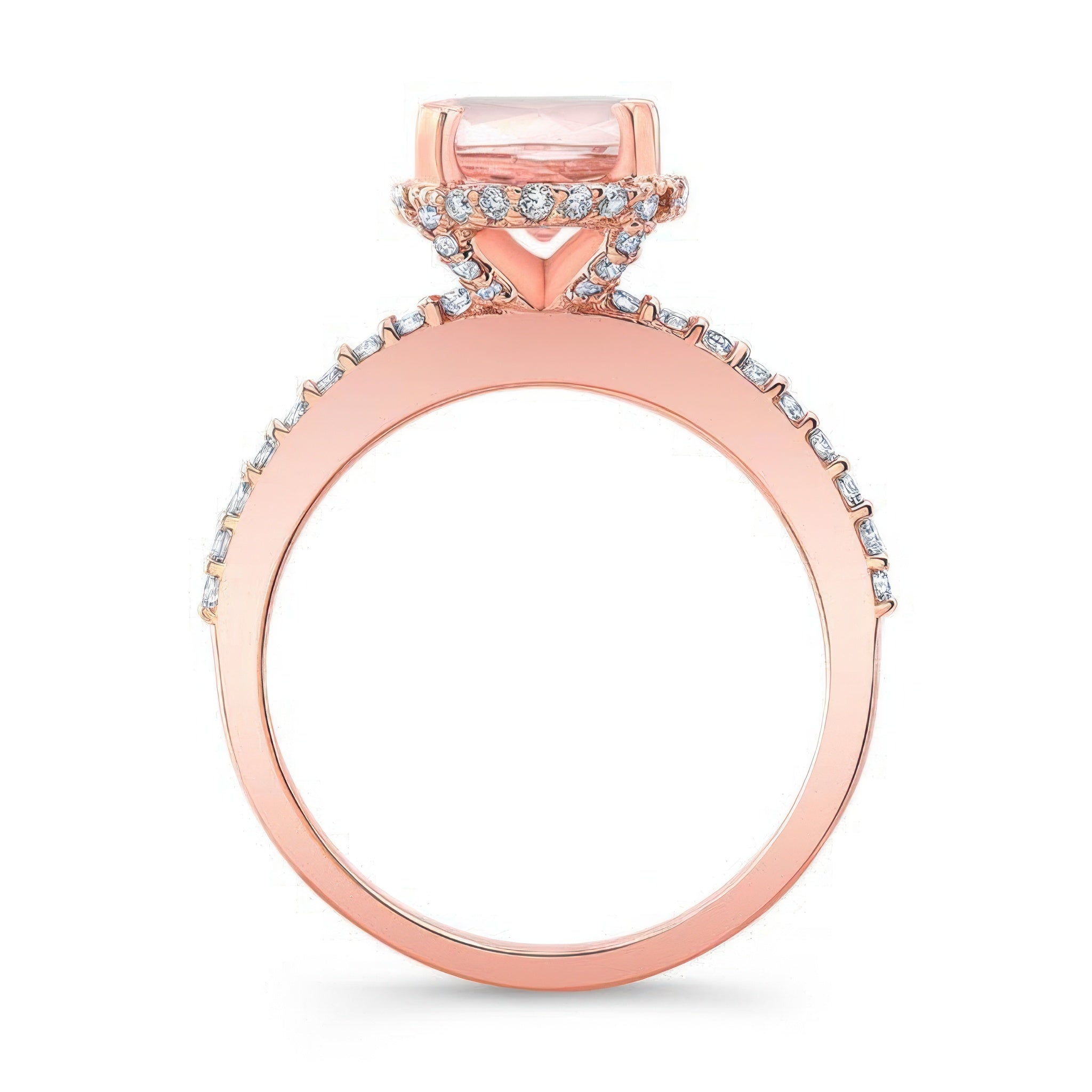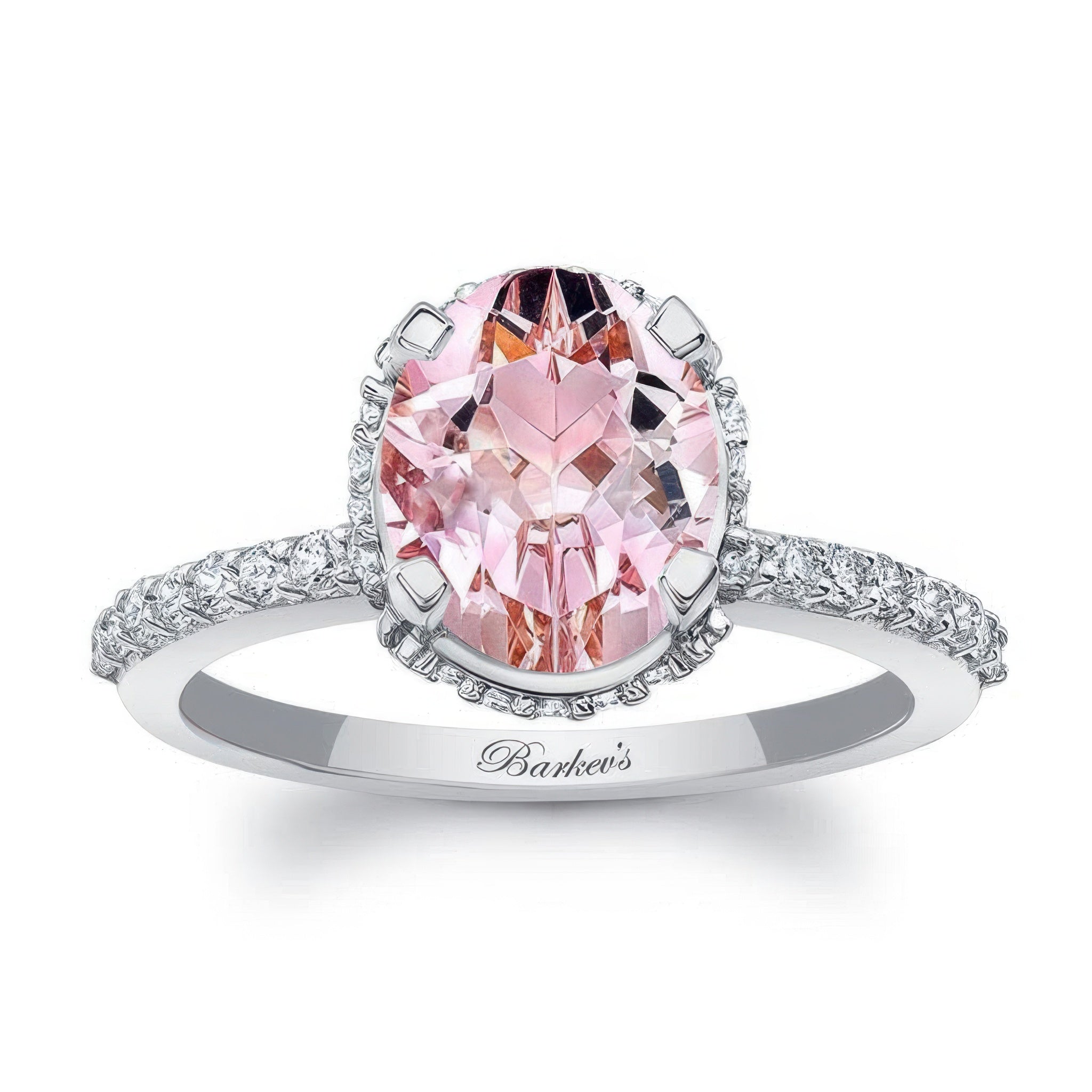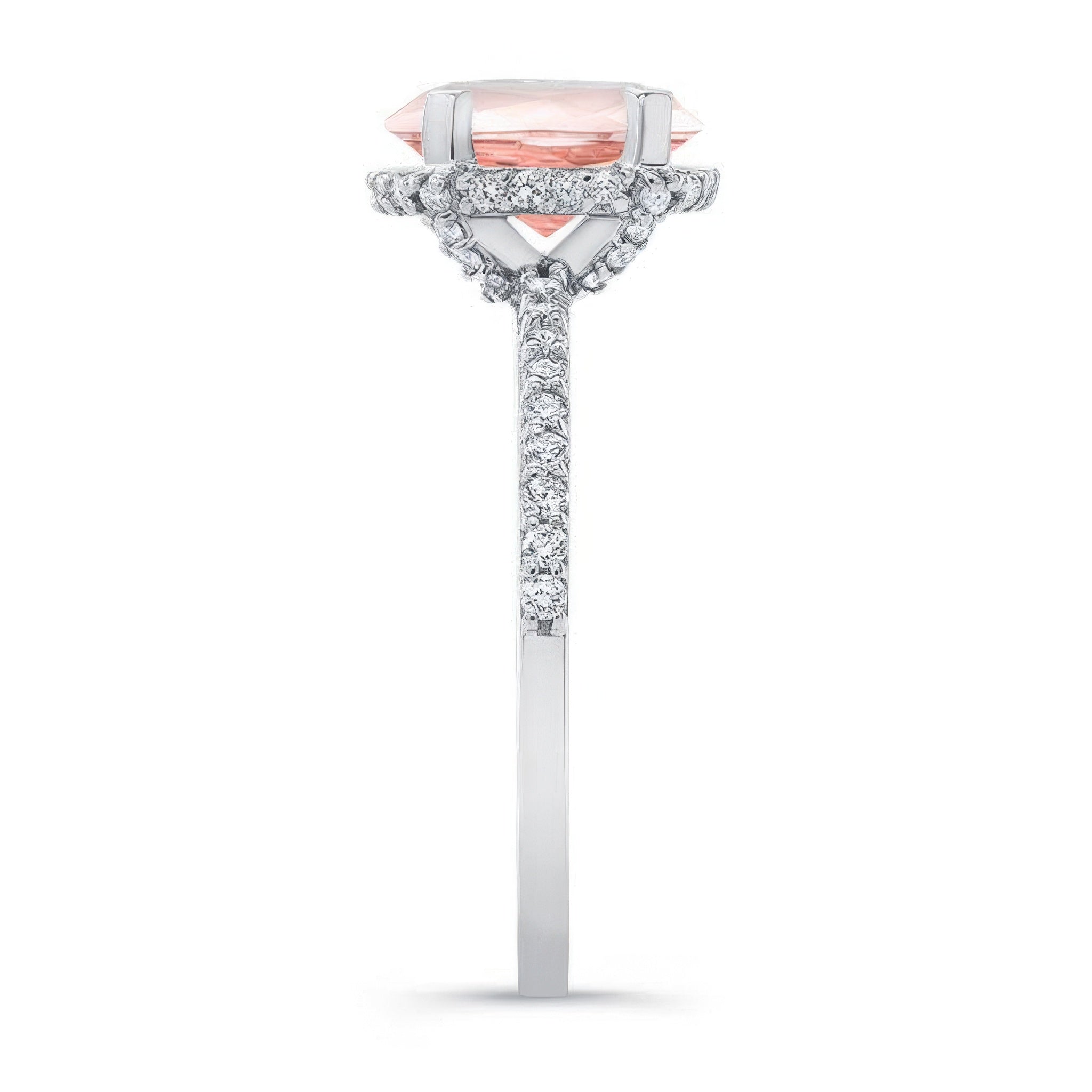 This hidden halo oval morganite engagement ring is for those who appreciate elongated shapes. Featuring a flow of diamonds that encircle the center just underneath and then spread down along the shank for a magnificent elegant design.