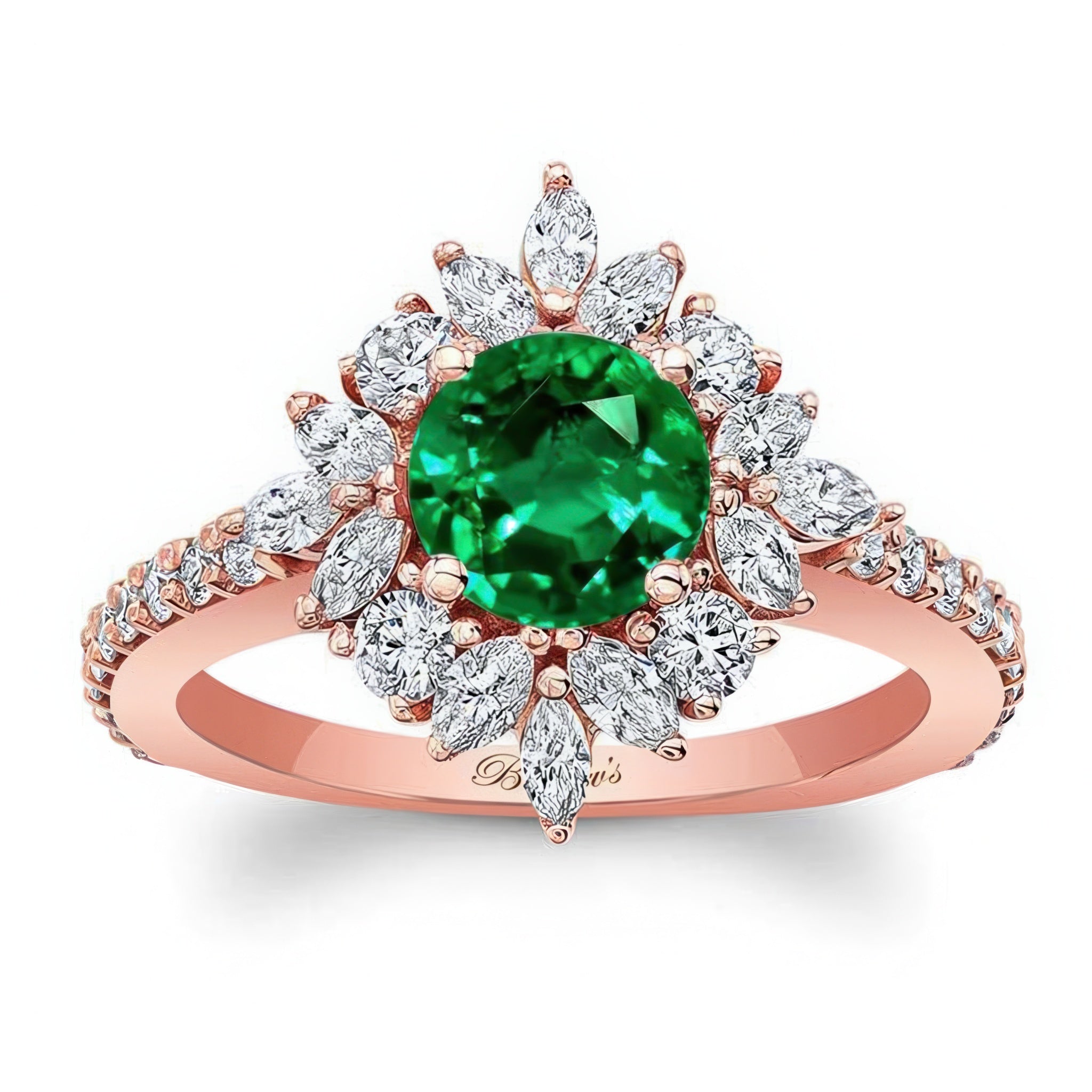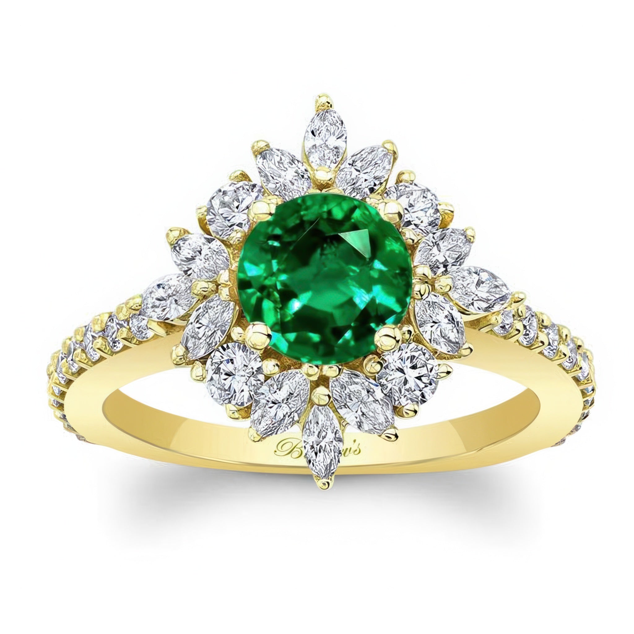 This marquise halo emerald and diamond engagement ring features a prong set round center artfully encircled with marquise and round melees, while shared prong set diamonds grace the shoulders for a timeless look.