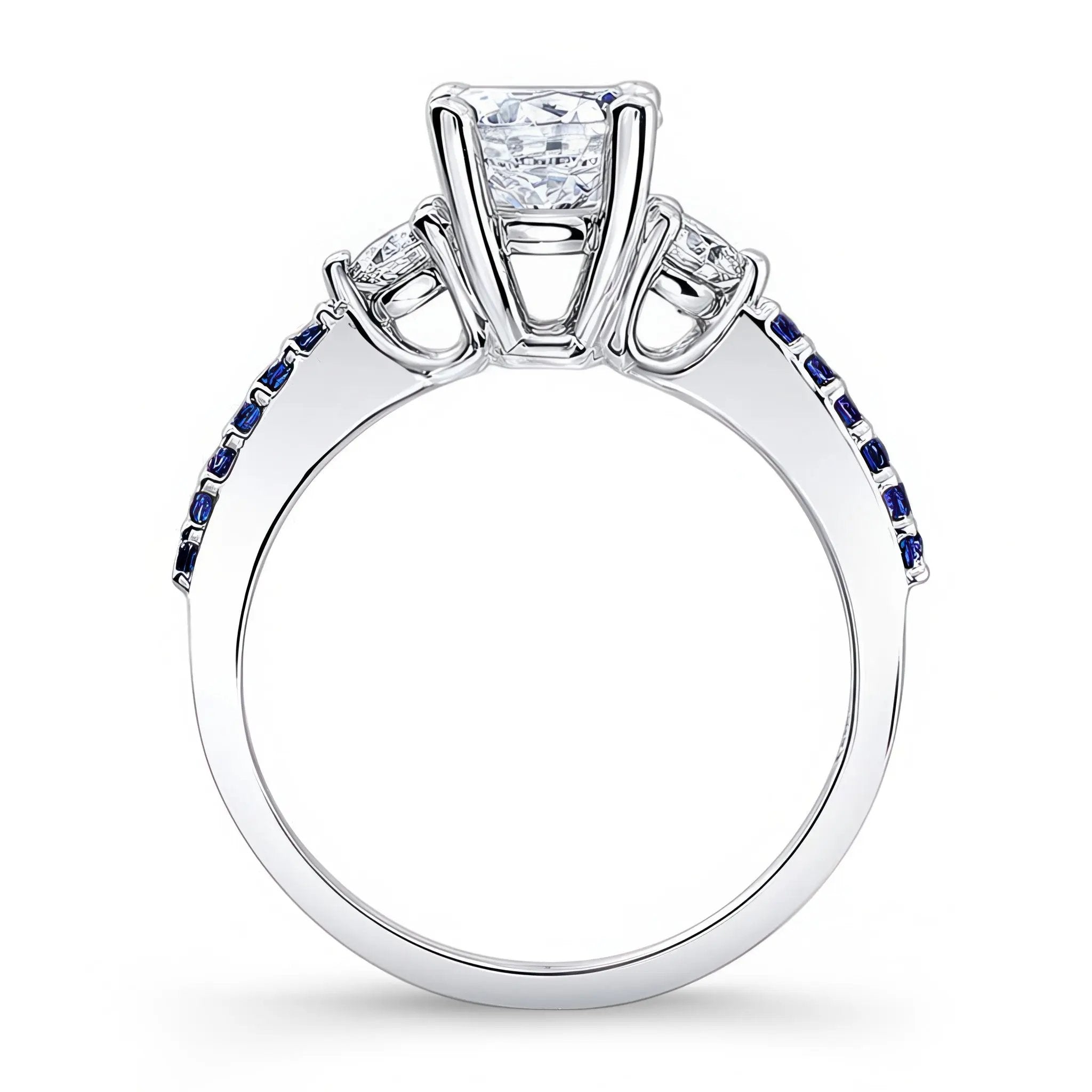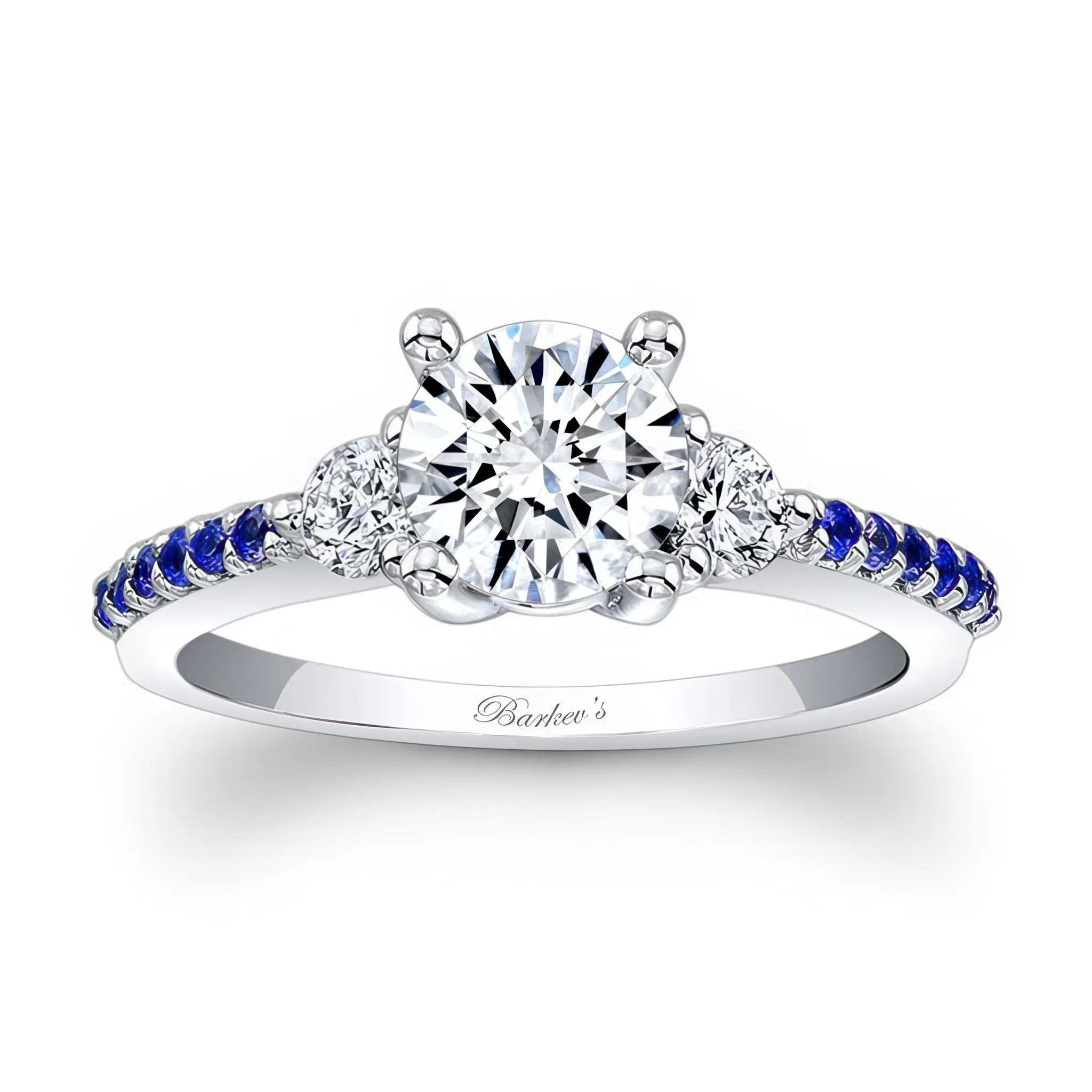 This 3 stone sapphire ring features accent stones flanking the prong-set round center. The dainty shoulders are adorned with shared prong set melees adding the finishing touch of elegance to this ring.