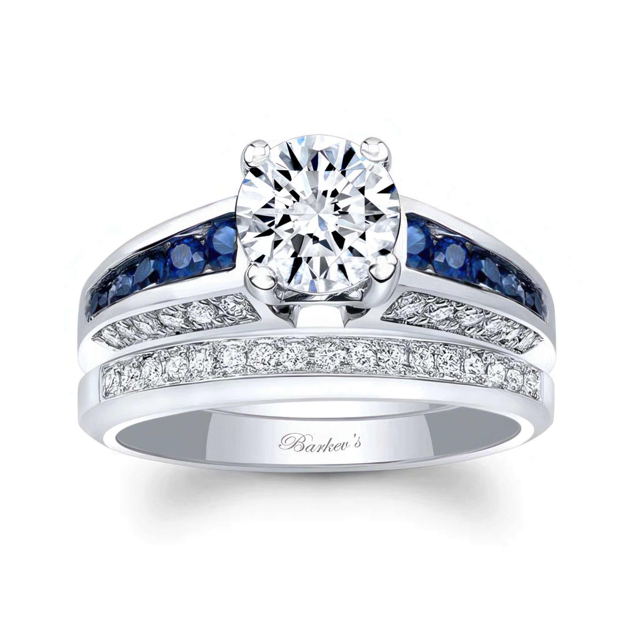 This magnificent blue sapphire accent channel set wedding ring set boasts with sparkle from every angle featuring beveled edges and a round center that is met by a row of channel set blue sapphires and pave white diamonds adorning not only the top, but also each side of the shank. Adding to this brilliance, the diamond wedding band fits snuggly close to the engagement ring for an unparalleled look.