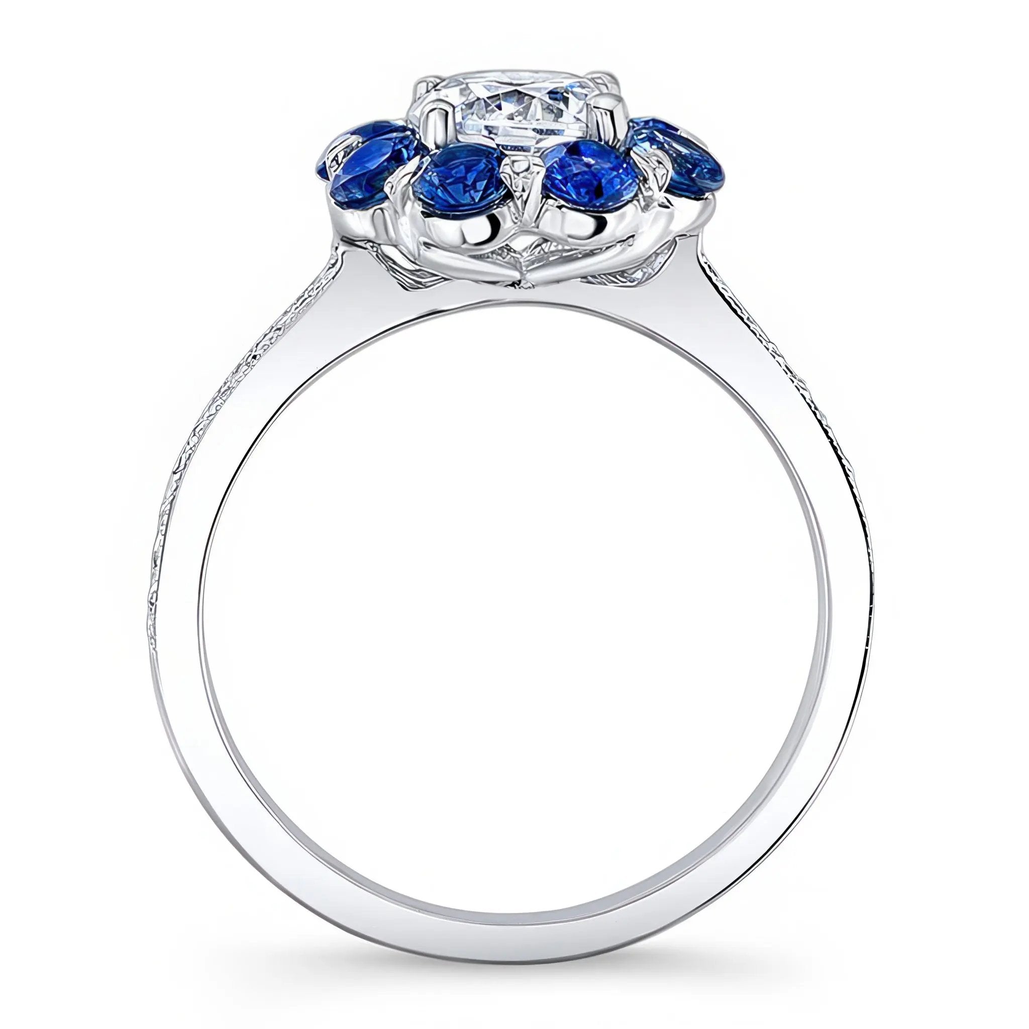 Flower Halo Blue Sapphire Accent Engagement Ring