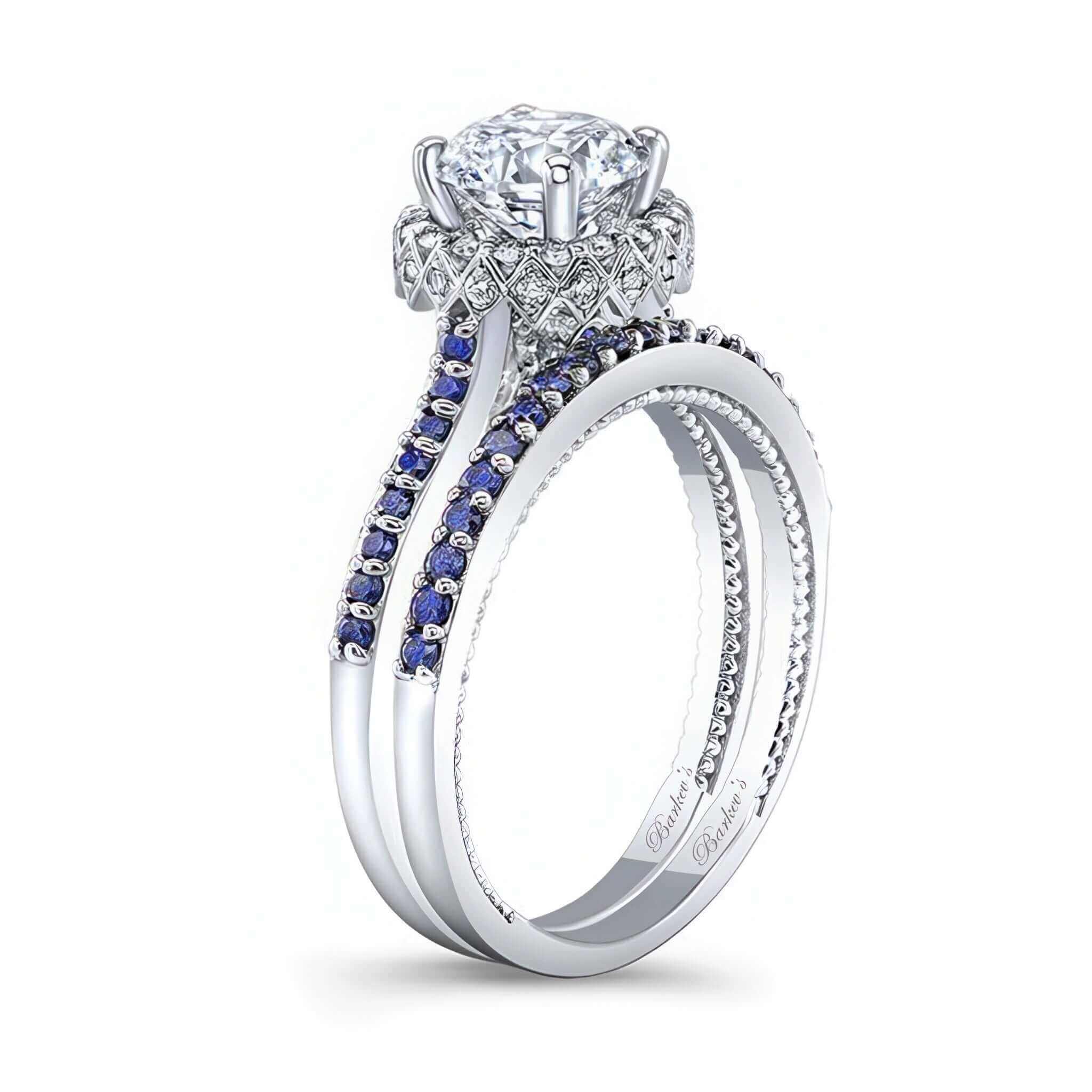 An exquisite round halo blue sapphire accent wedding set with a center surrounded by shared prong melees that continue down the shoulders. The profile view reveals a second hidden halo around the sides and two larger bezel set blue sapphires sitting just beneath the center. A matching wedding band sits up closely on the side to emphasize the design.