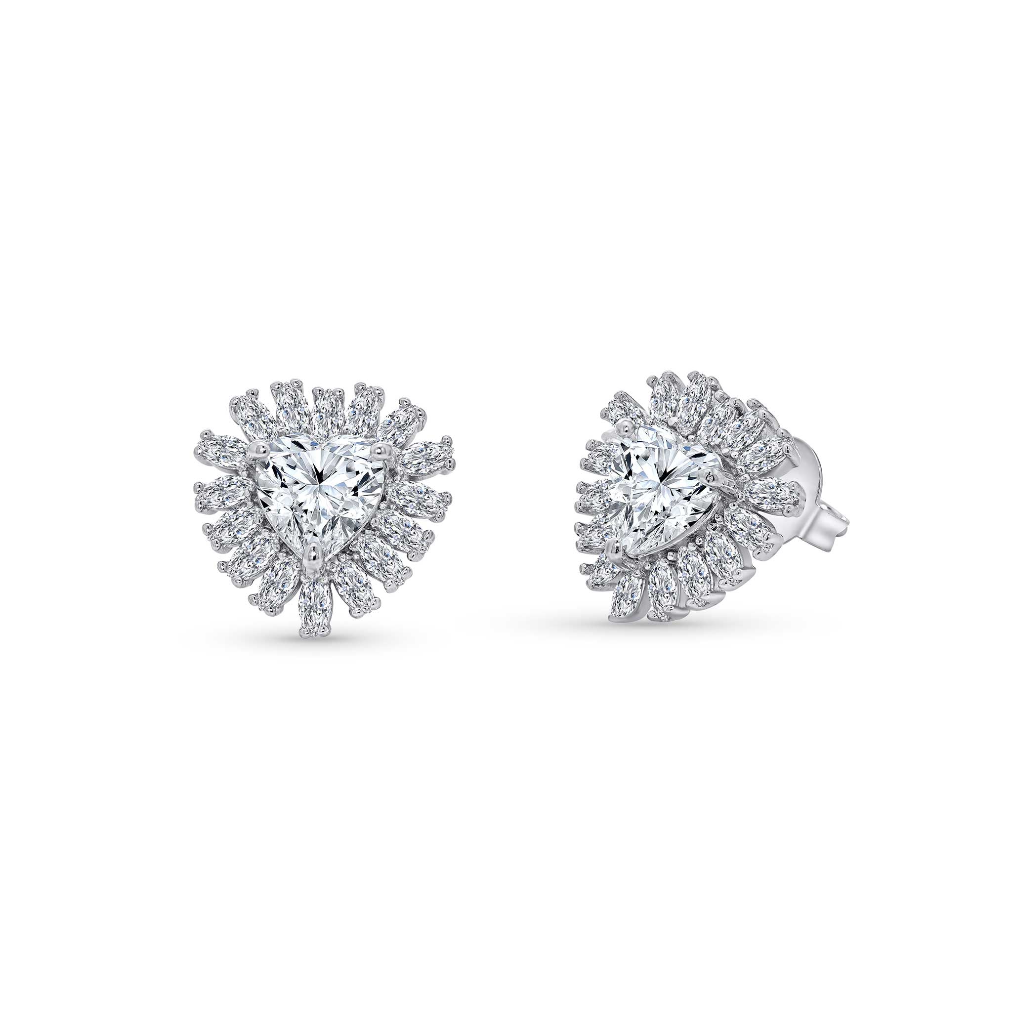 These elegant stud earrings showcase two 6.5mm heart-shaped moissanites, each encircled by a sophisticated halo of 32 marquise-cut moissanites for enhanced brilliance. The rhodium plating delivers a lustrous finish that amplifies light reflection and ensures lasting radiance. A refined choice for those seeking distinctive sparkle with timeless appeal.