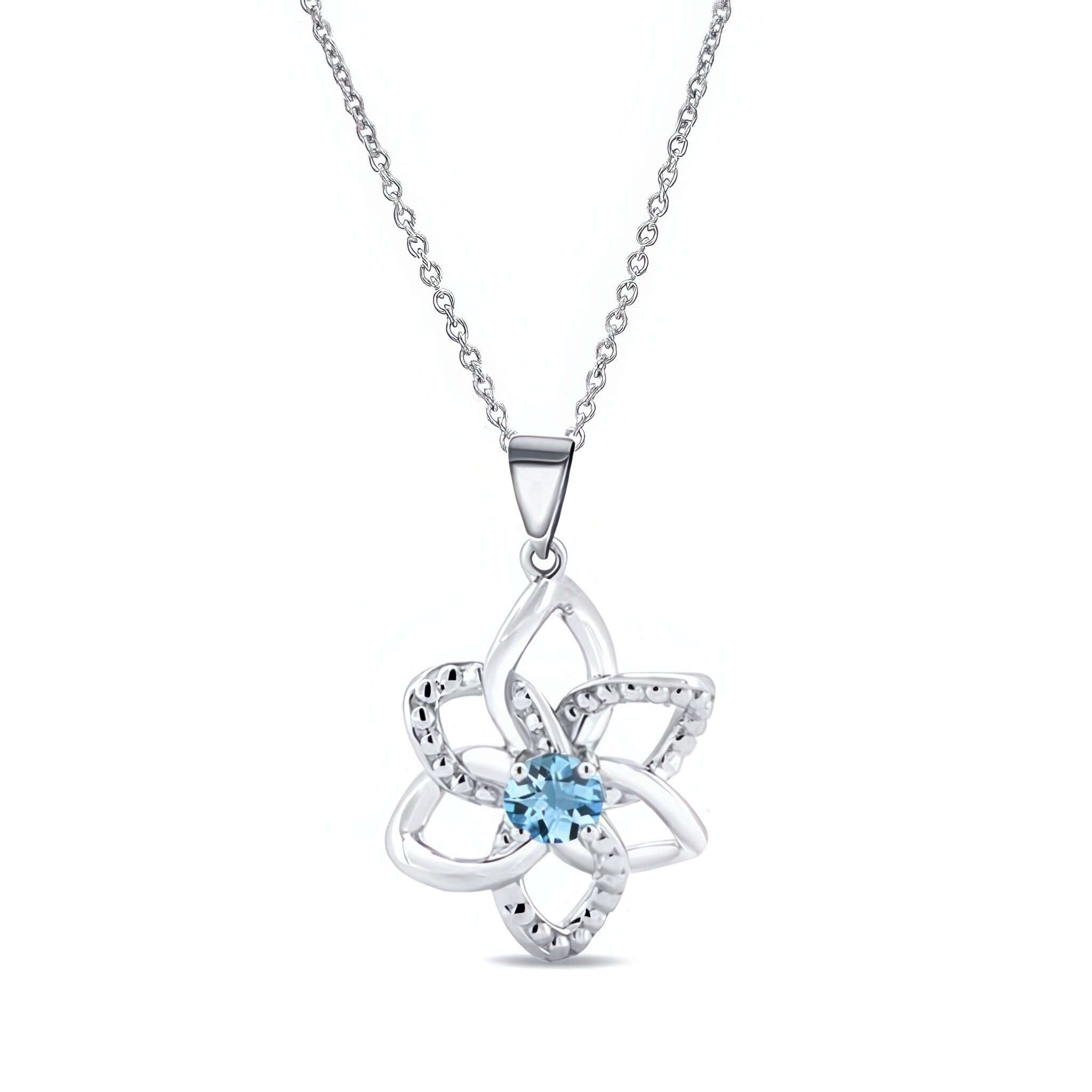 A beautiful aquamarine silver flower necklace featuring intertwined leaf shapes and a half carat aquamarine center.