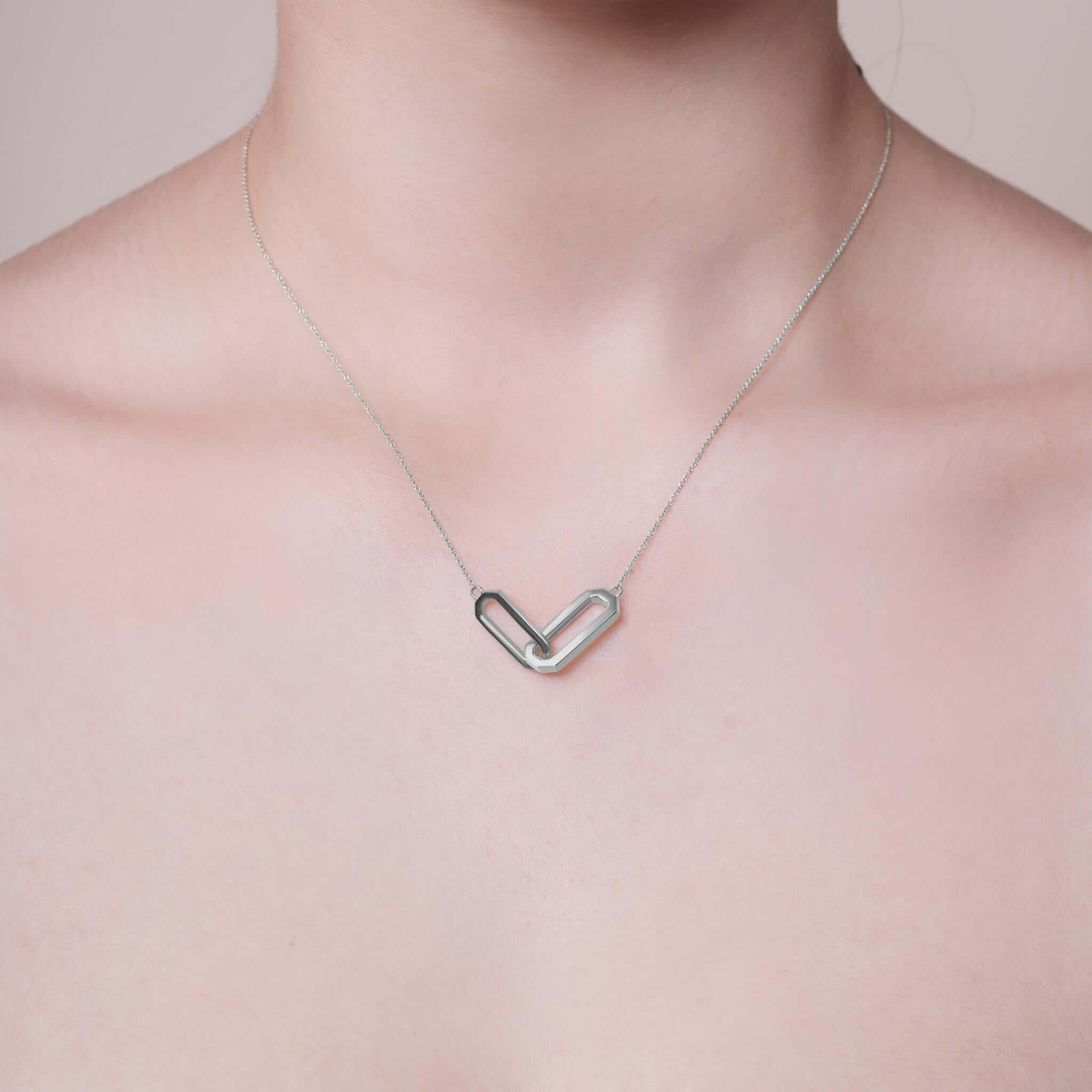 This sophisticated necklace showcases two interlocking paper clip links arranged in a striking V formation, combining contemporary design with timeless elegance. Crafted in sterling silver and Rhodium plated for extra protection. This piece offers versatile styling possibilities to complement any wardrobe. The geometric interplay of the interlocking clips creates visual interest while maintaining a refined aesthetic suitable for both everyday wear and special occasions. A modern interpretation of classic jewelry design, this necklace makes a distinctive statement for the discerning wearer.