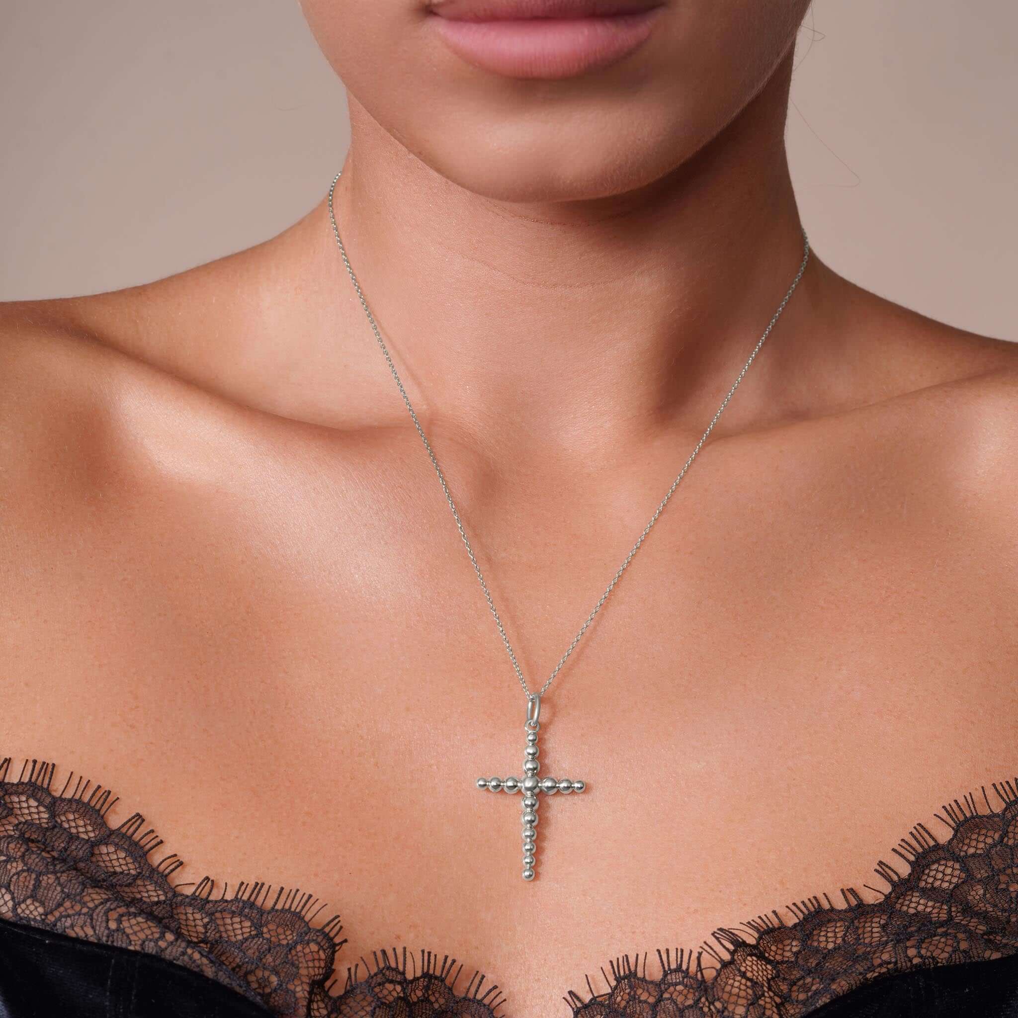 Our silver beaded cross necklace, features a cross formed entirely from polished bead-shaped links, creating a delicate texture that catches the light beautifully. This necklace is crafted from silver and finished with a Rhodium plate for a long lasting shine.