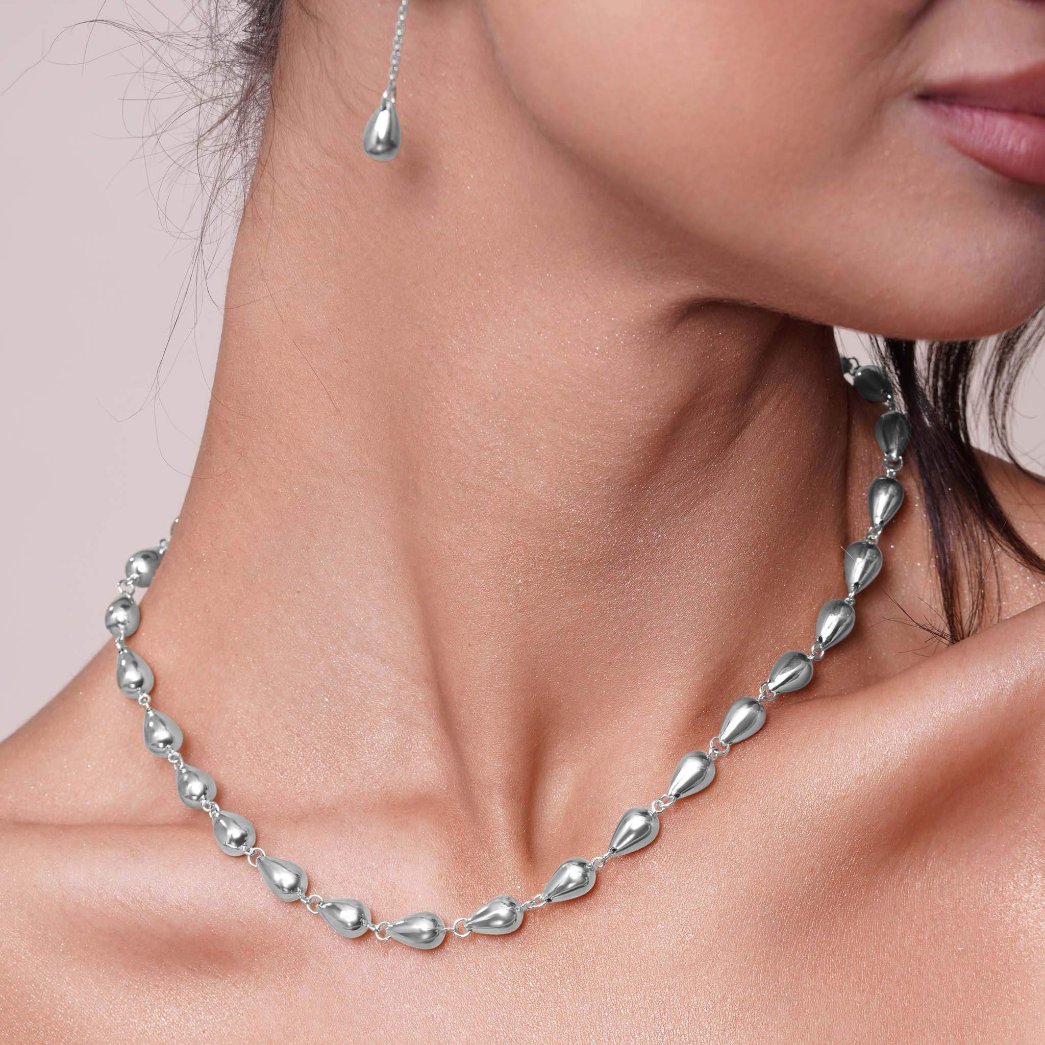 Elevate your everyday elegance with this refined teardrop link silver necklace, expertly crafted for the discerning woman. Each gracefully curved teardrop element flows seamlessly along the chain, creating a sophisticated silhouette that complements both casual and formal occasions. The sterling silver construction is enhanced with rhodium plating, a precious metal coating that provides superior durability and maintains the necklace's brilliant luster while resisting tarnish and wear. This protective layer ensures your investment remains radiant for years to come, making it an ideal choice for those who appreciate quality craftsmanship and timeless design.