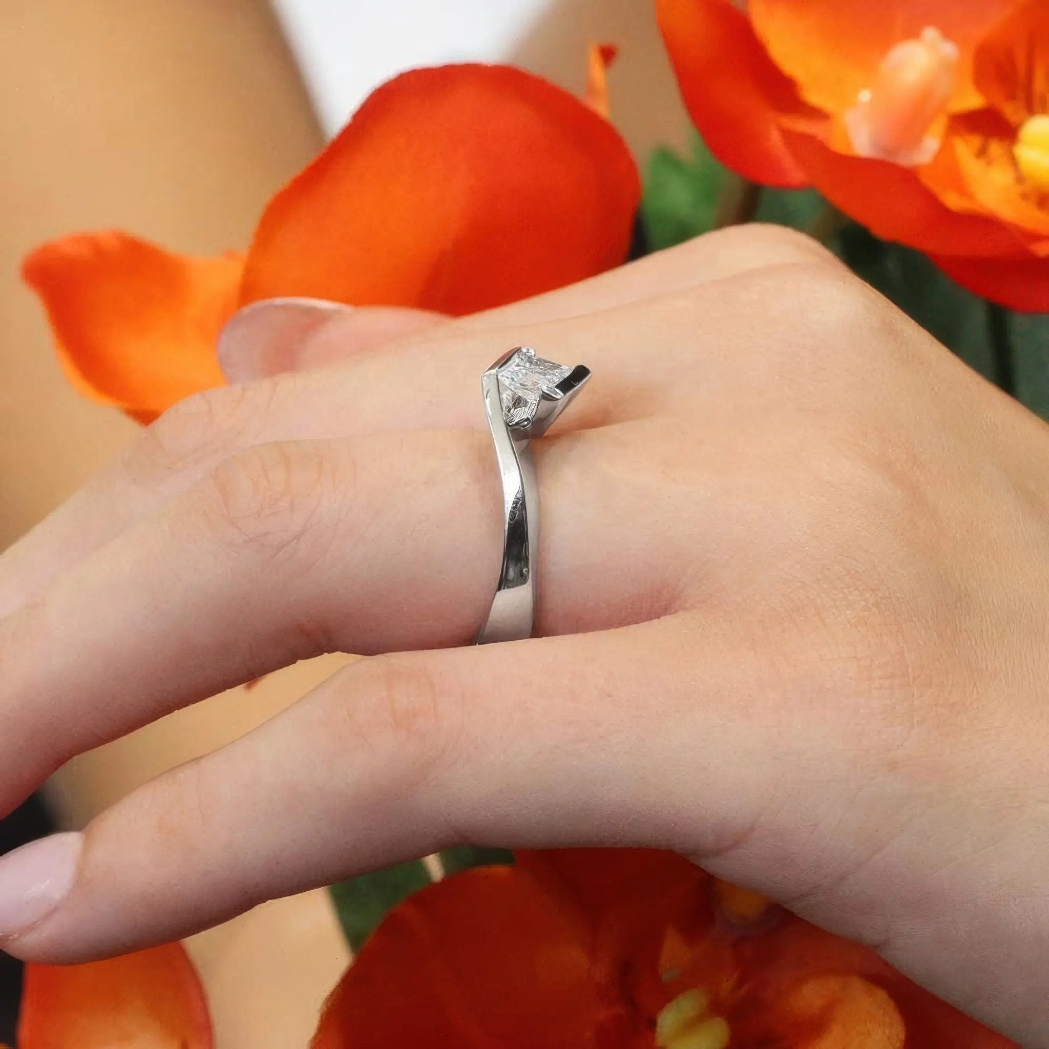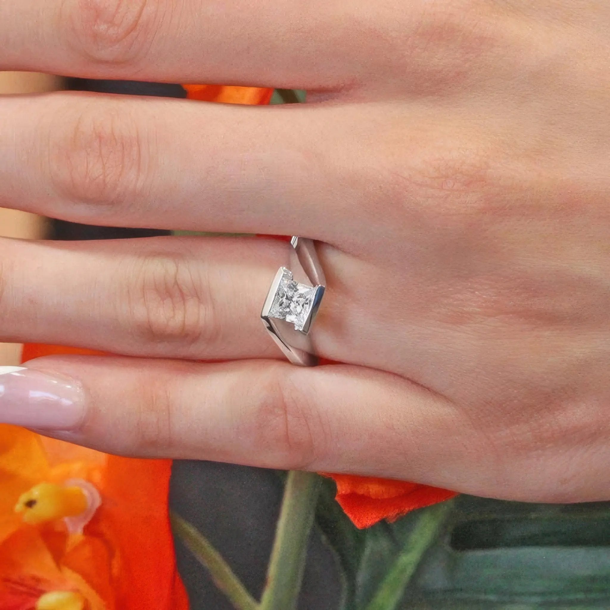 This 1 carat princess cut solitaire diamond ring features a channel set center captured by a bright polished shank for a stunning appeal.