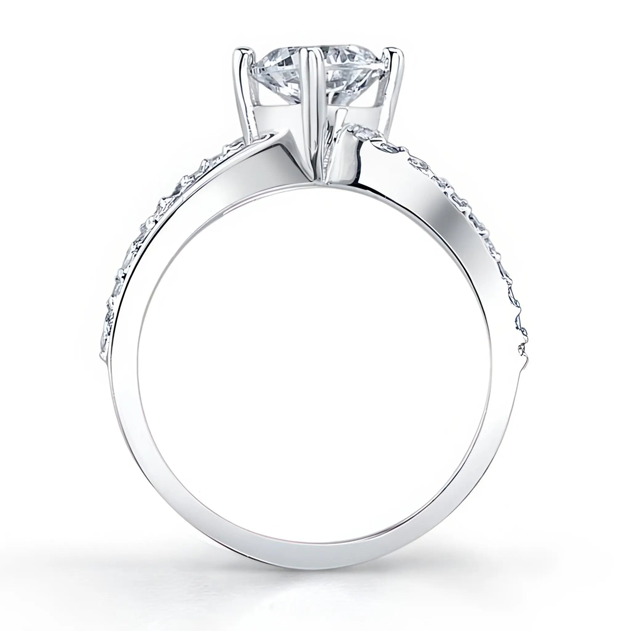 This curving split shank ring features a prong set round center with an artfully twisting split shank adorned with shared prong set diamonds for an elegant look.