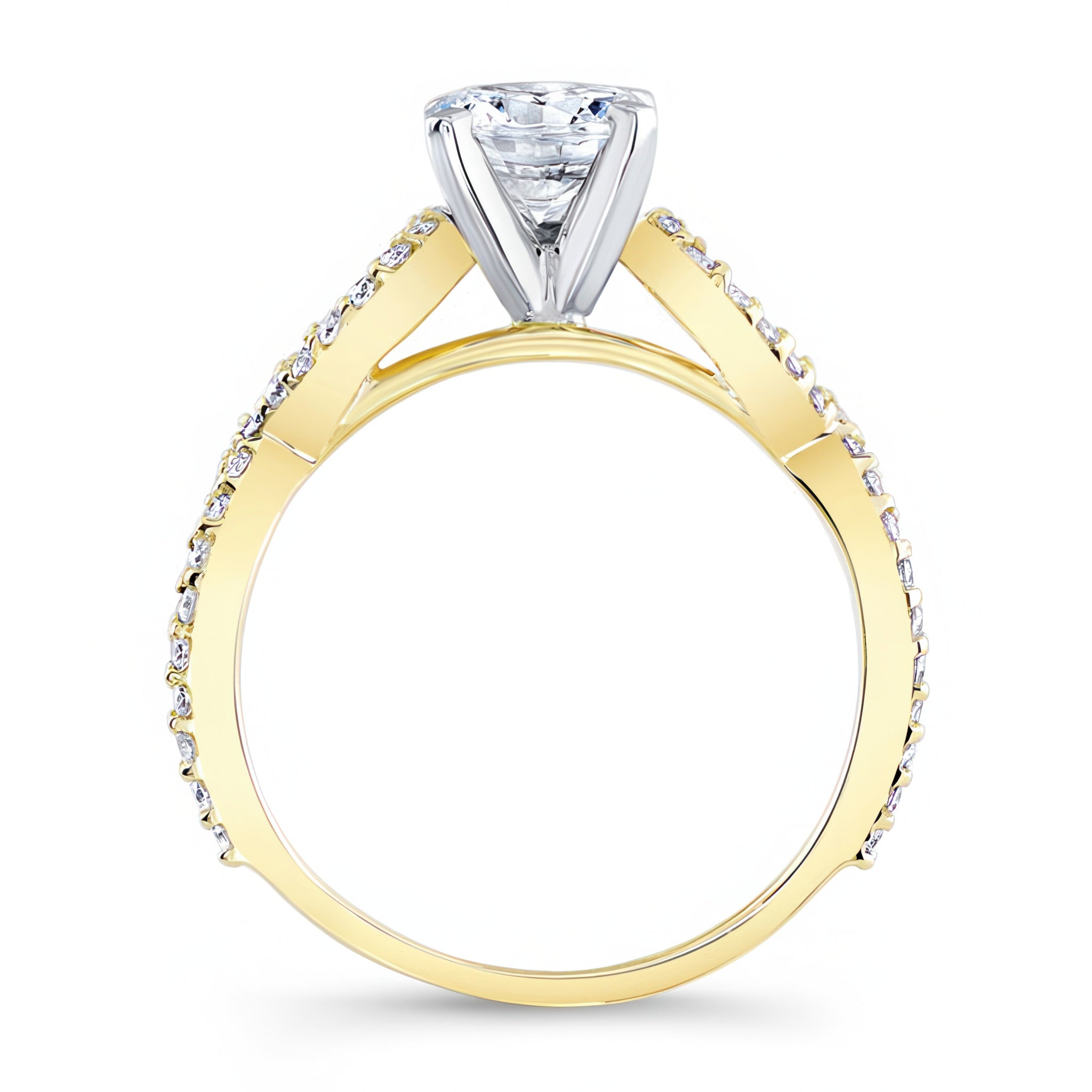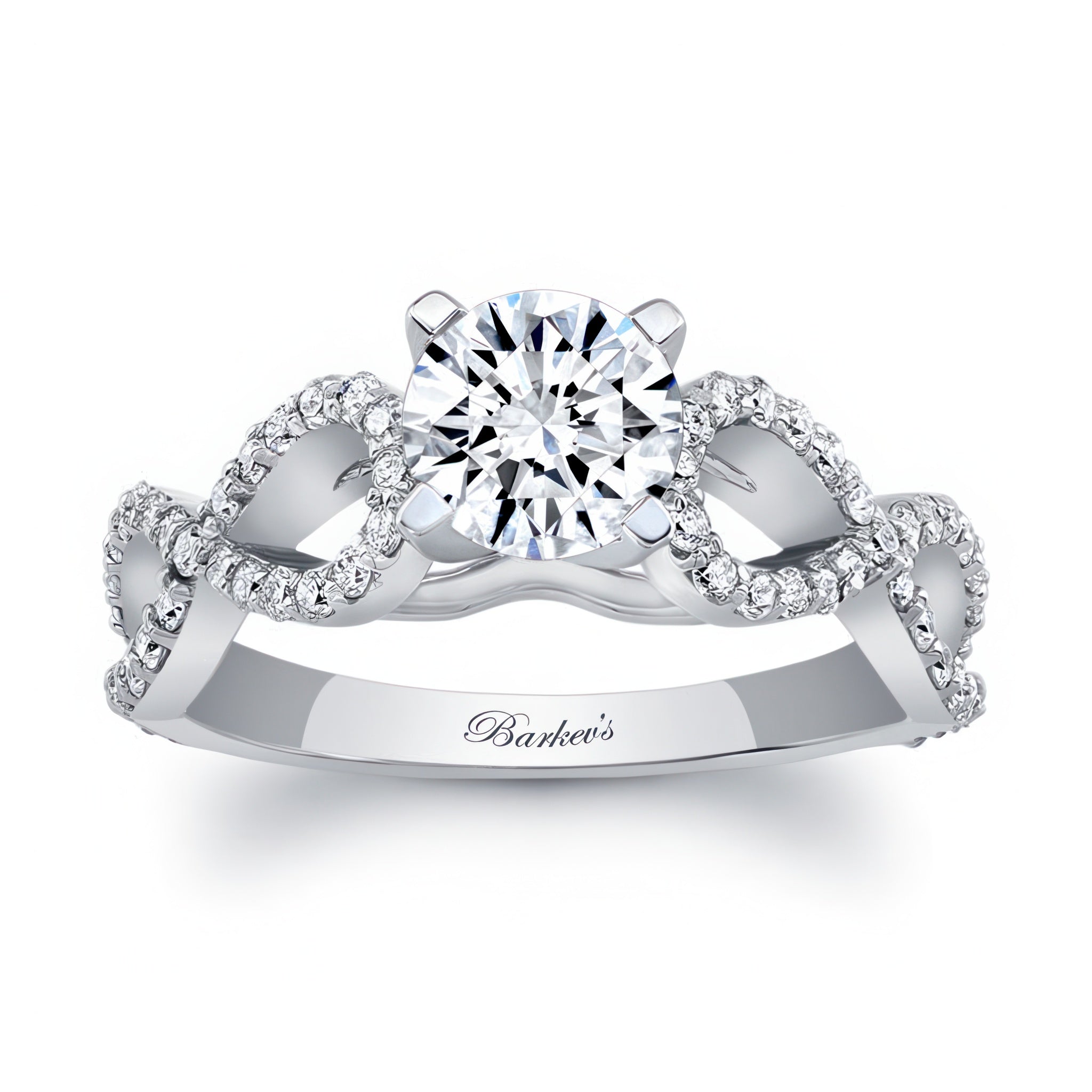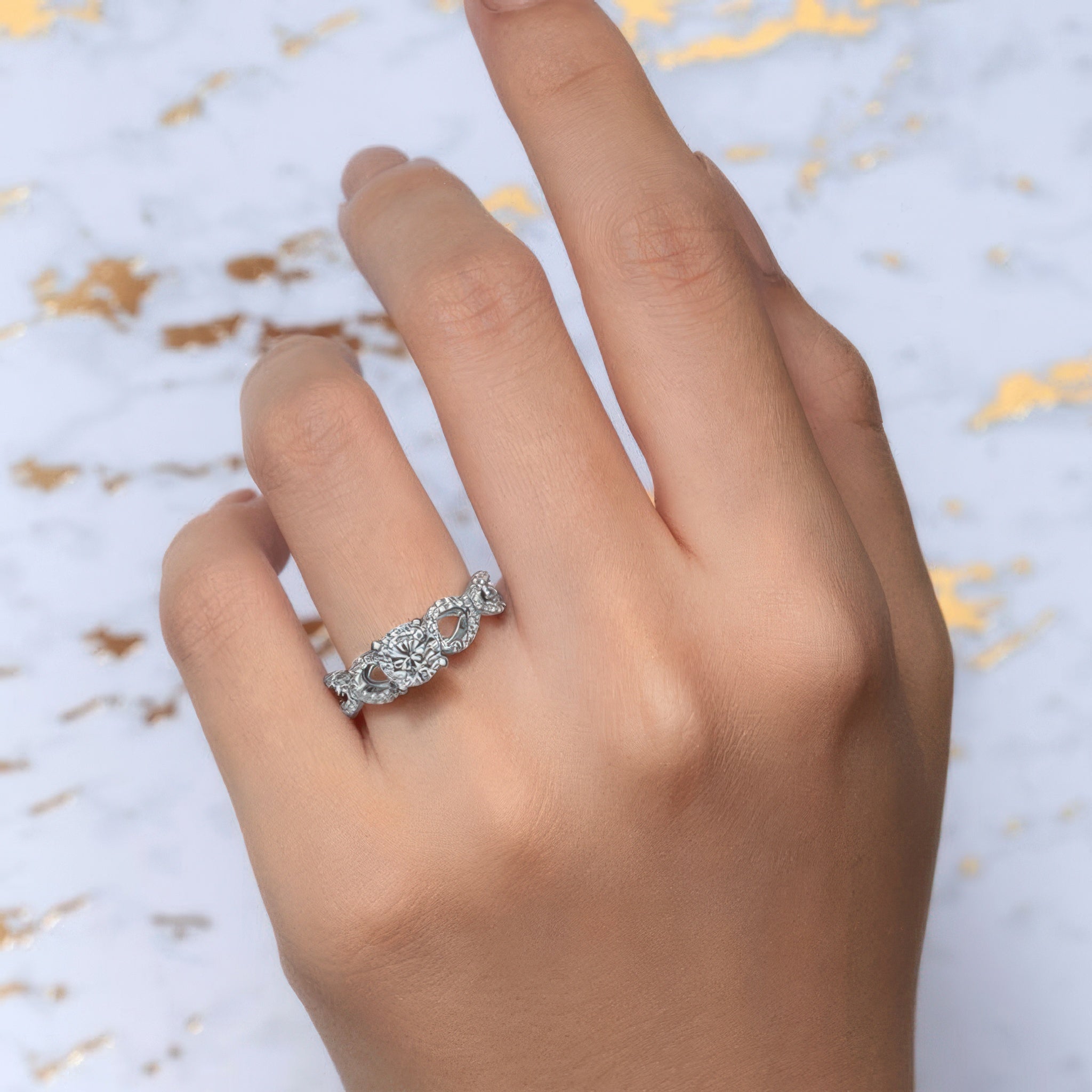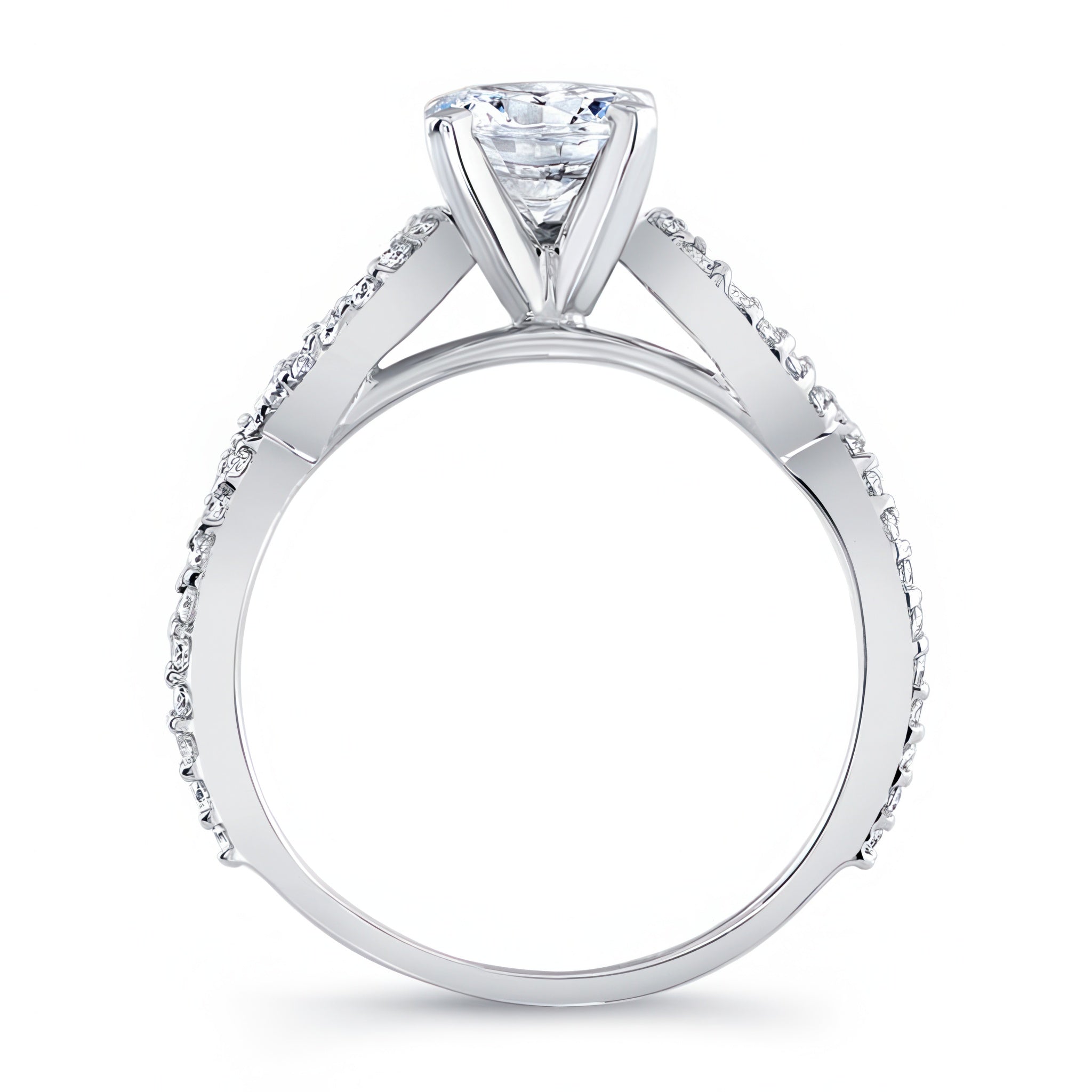 This infinity ring features a prong set round center with an artfully curving cathedral shank that crisscrosses down the shoulders adorned with shared prong set diamonds for a glamorous look sure to be treasured.