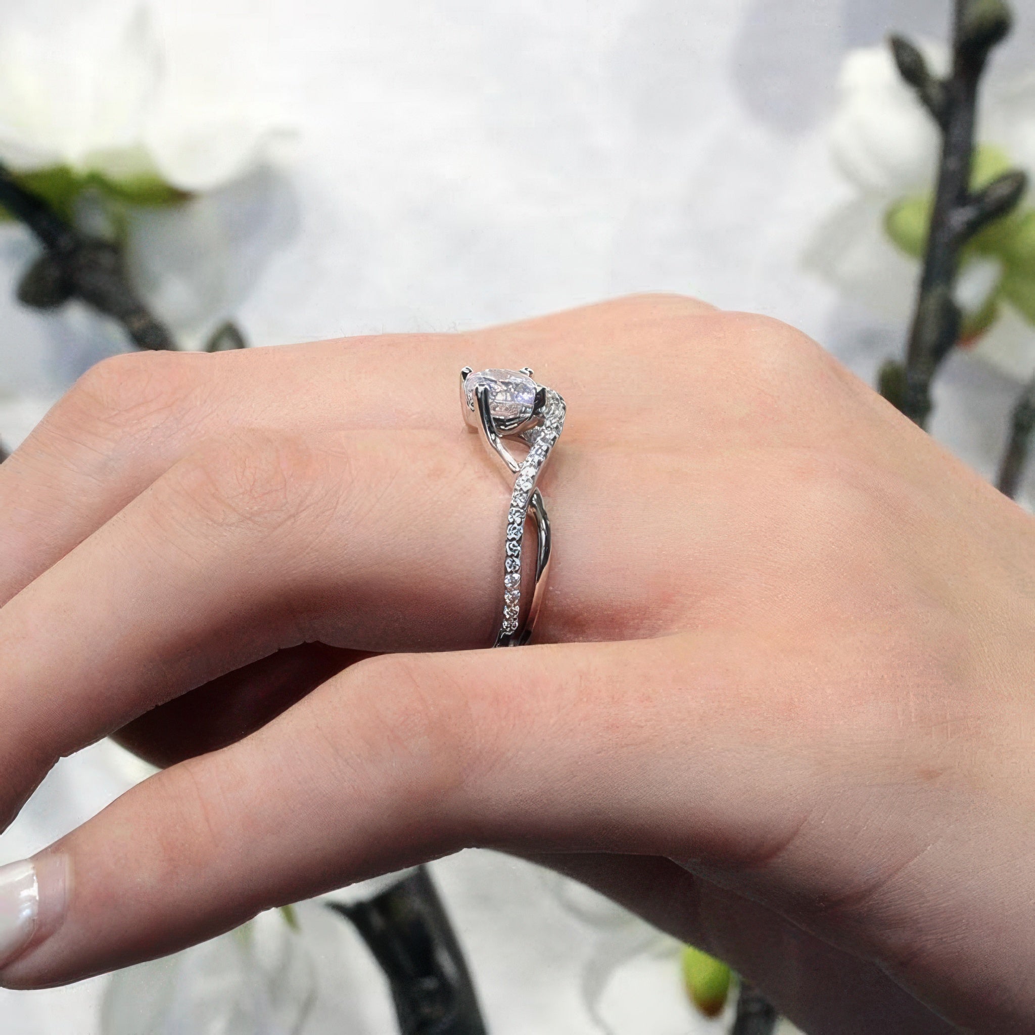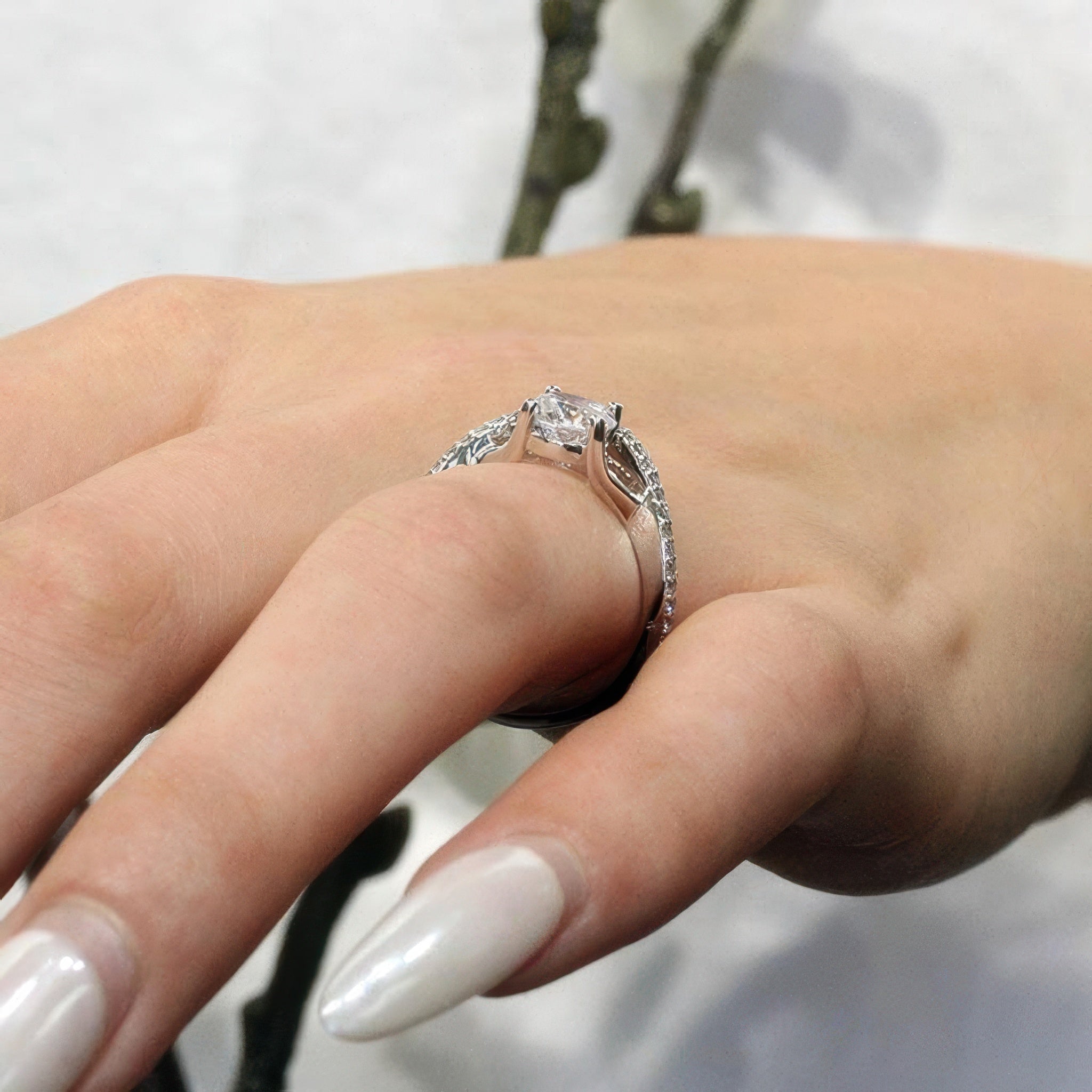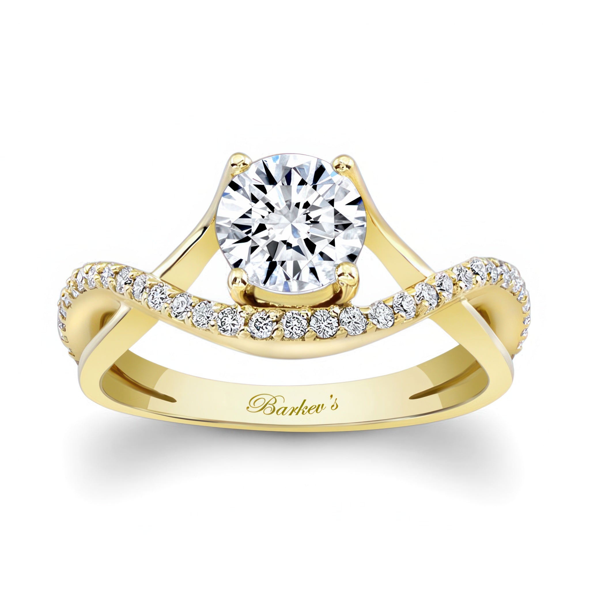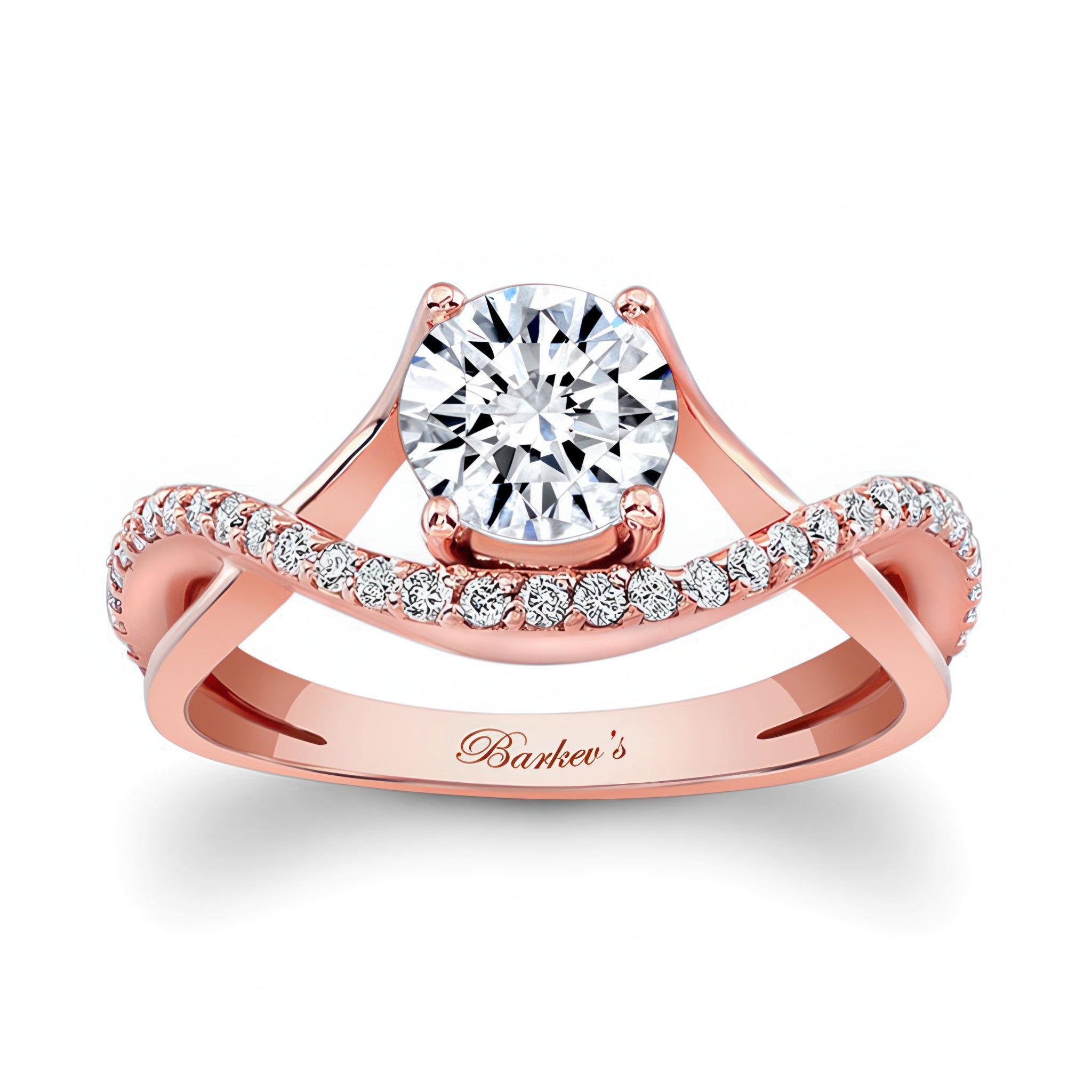 This split shank diamond pave ring is designed with split crossing shoulders and a pave set diamond ridge that cradles the prong set round center for an added touch of elegance.