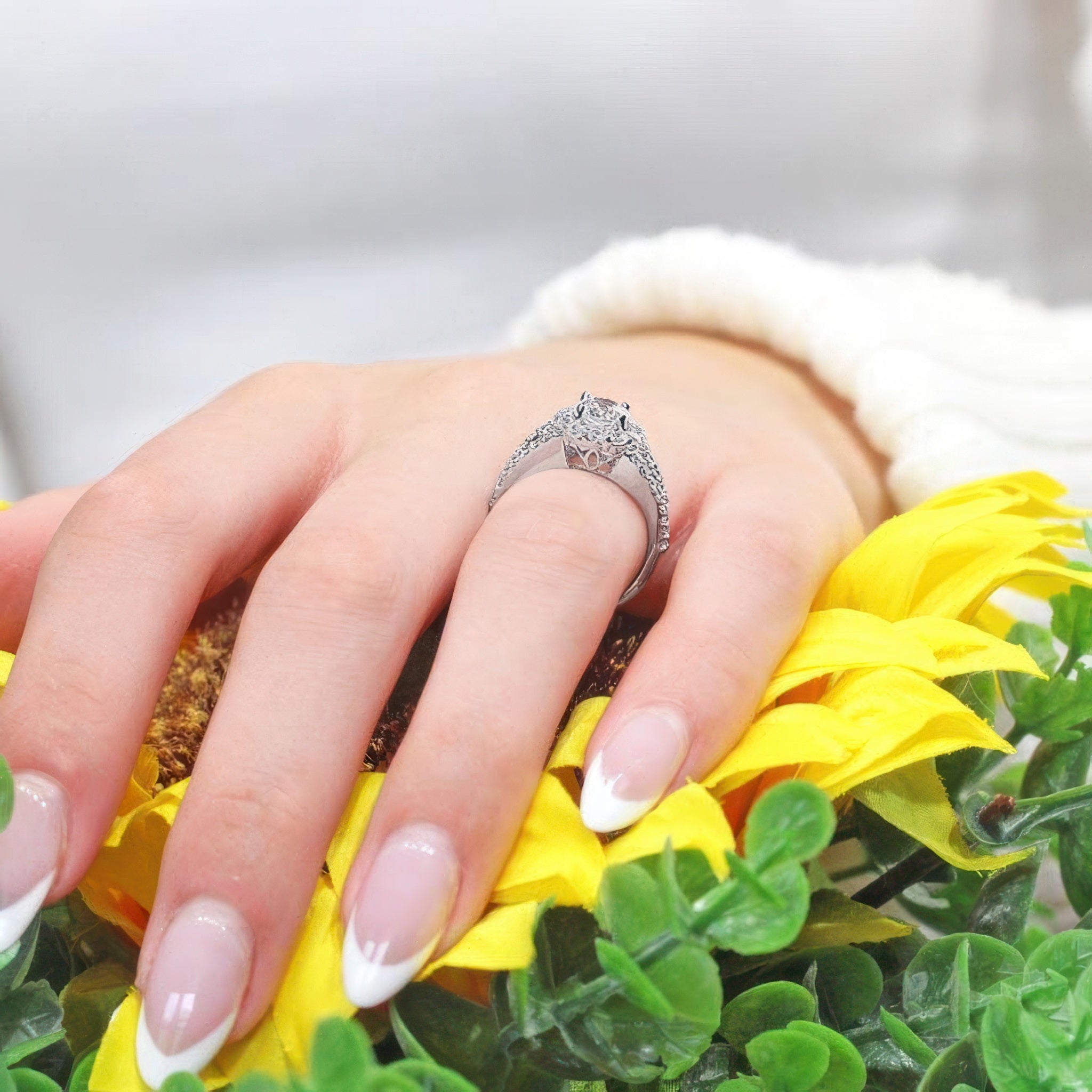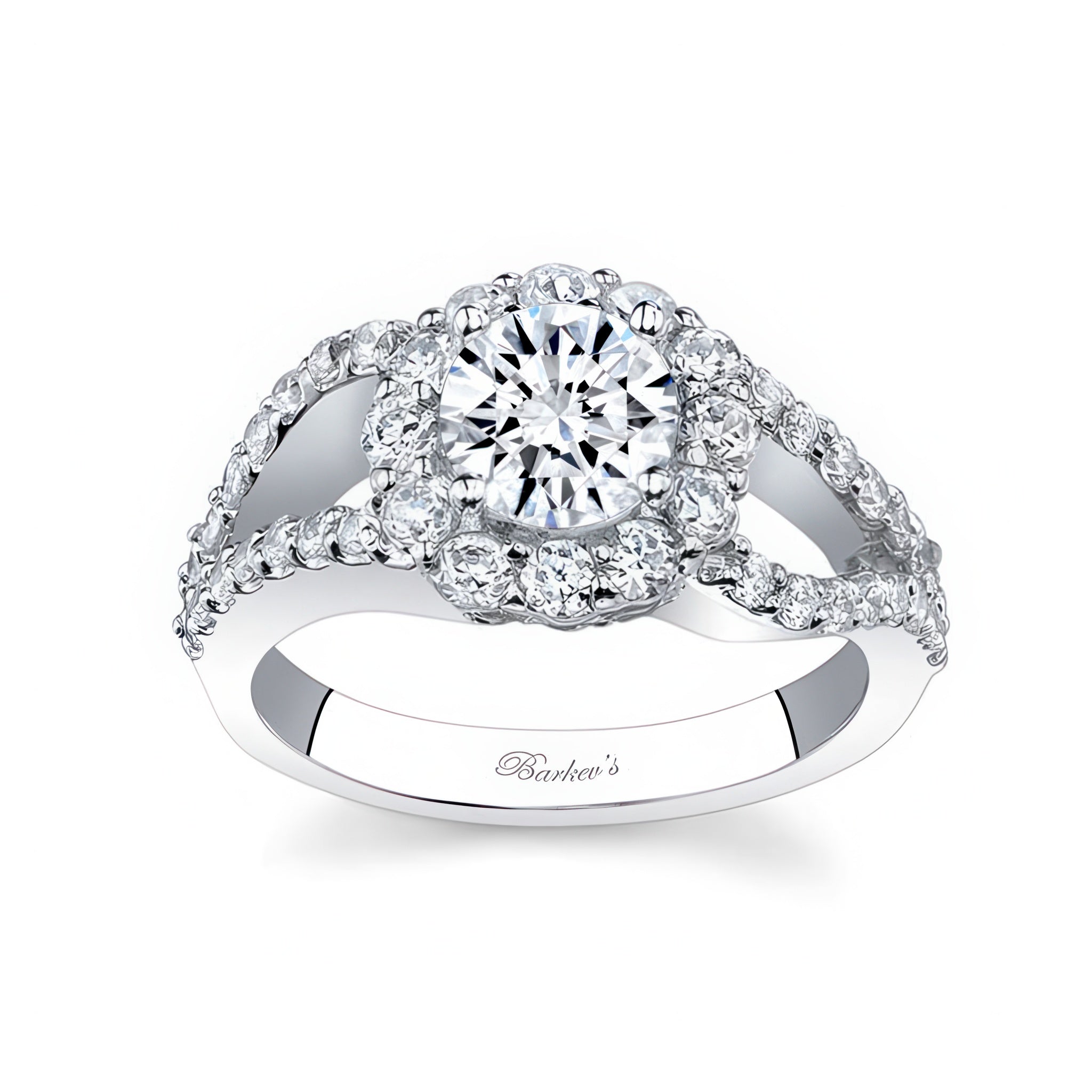 This split shank halo engagement ring features a prong set round center with a diamond halo encircling it and shared prong set diamonds on the ridges for an added touch of glamor.