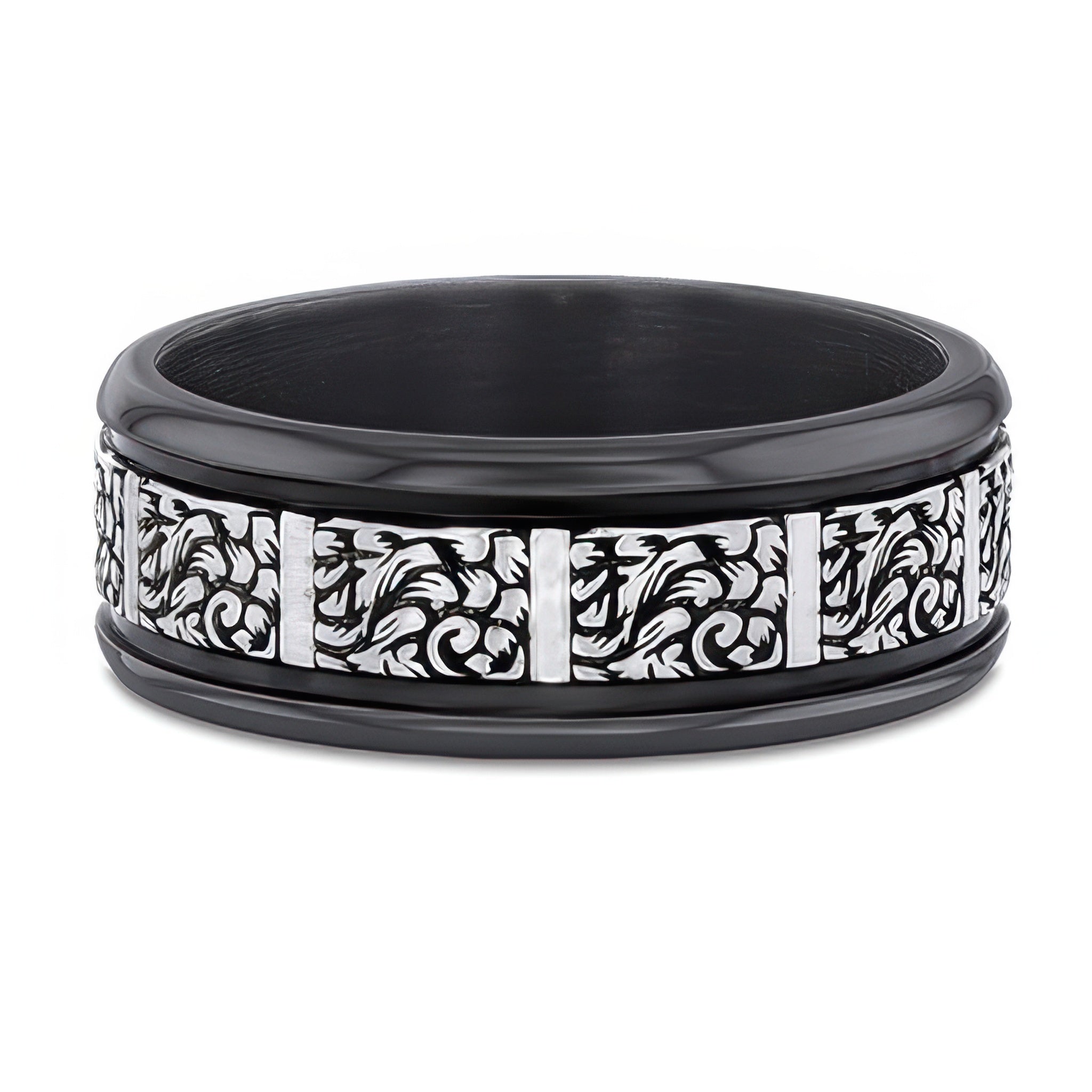 This men’s wedding band combines bold design with timeless detail. The dark tantalum base gives the ring a sleek, masculine look, while the white gold inlay features an intricate vine engraving that adds refined texture and contrast. The polished black edges frame the design perfectly, creating a modern yet classic statement piece for those who appreciate artistry and strength in one.