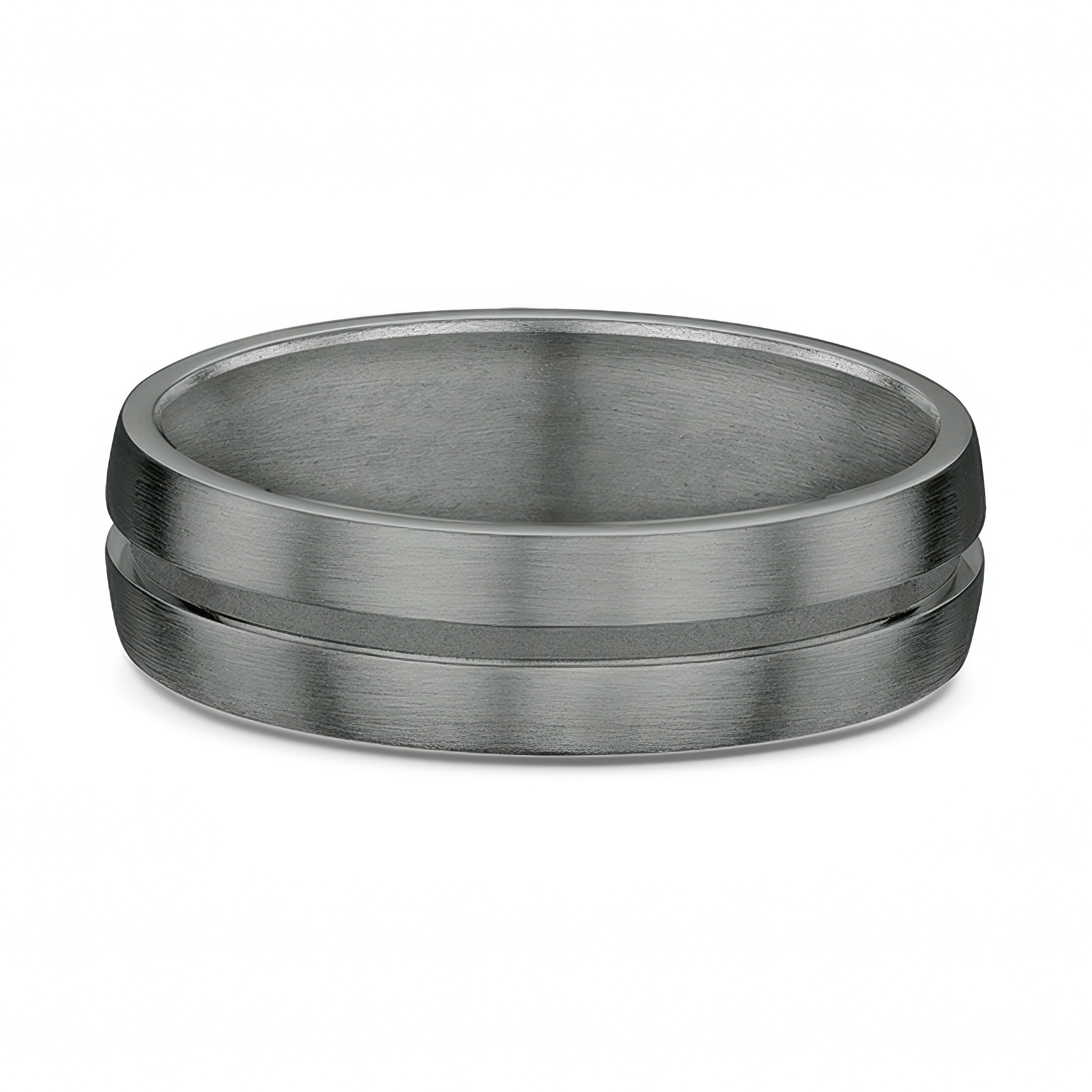 A Dora men's trim wedding band with brushed tantalum and a simple center trim.