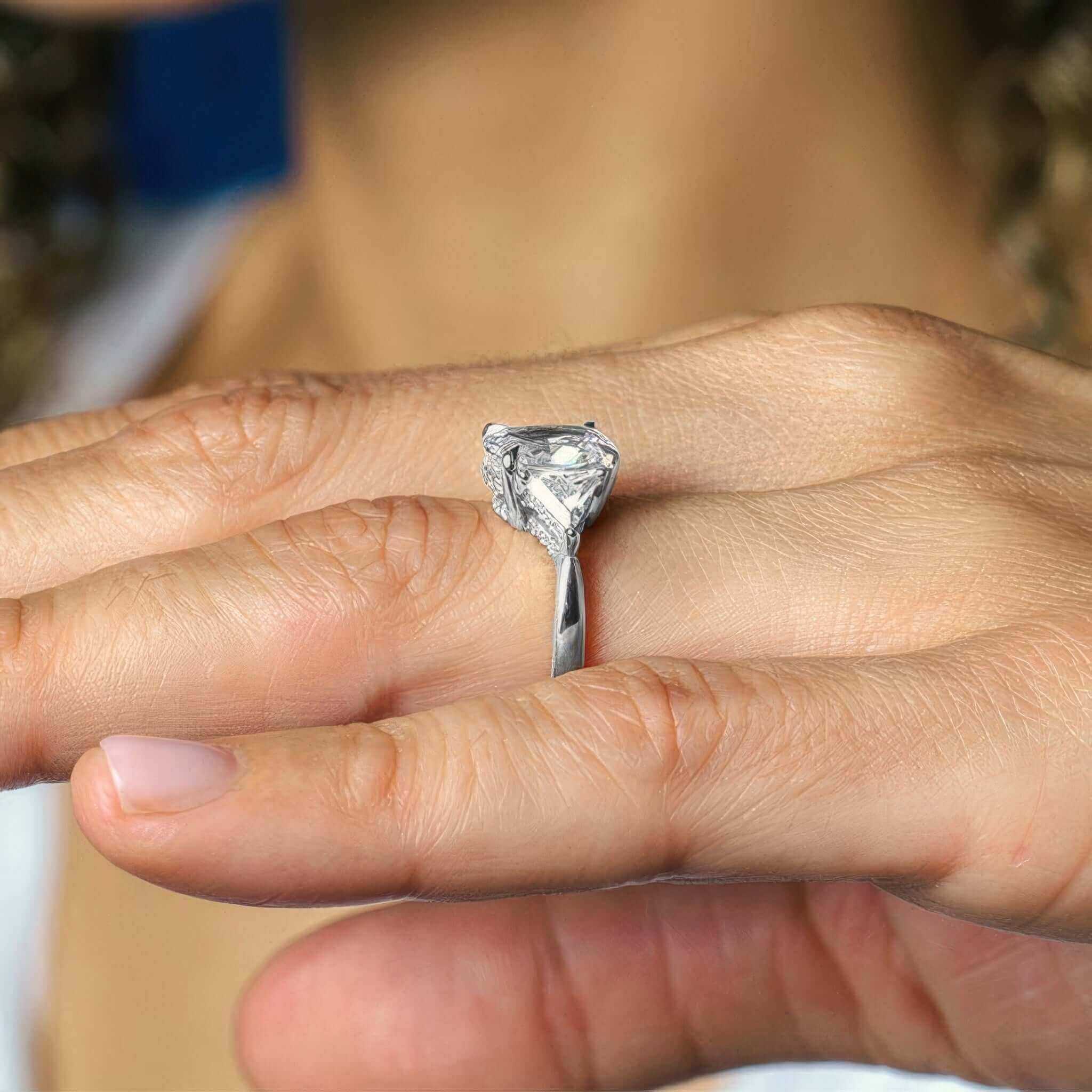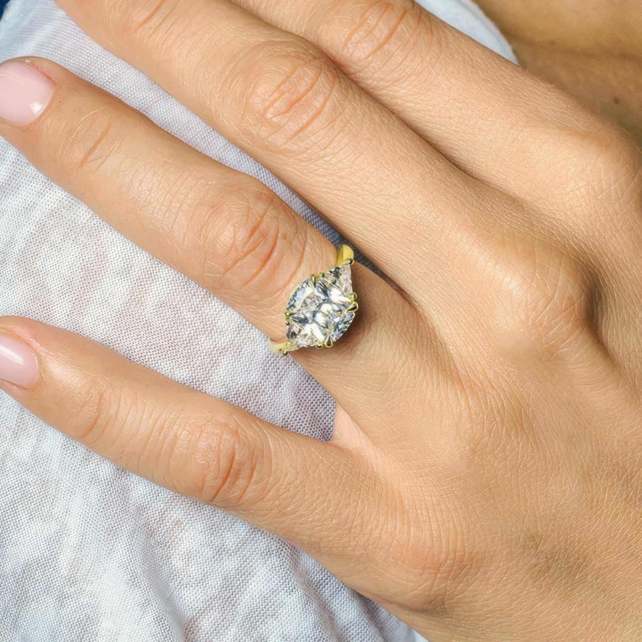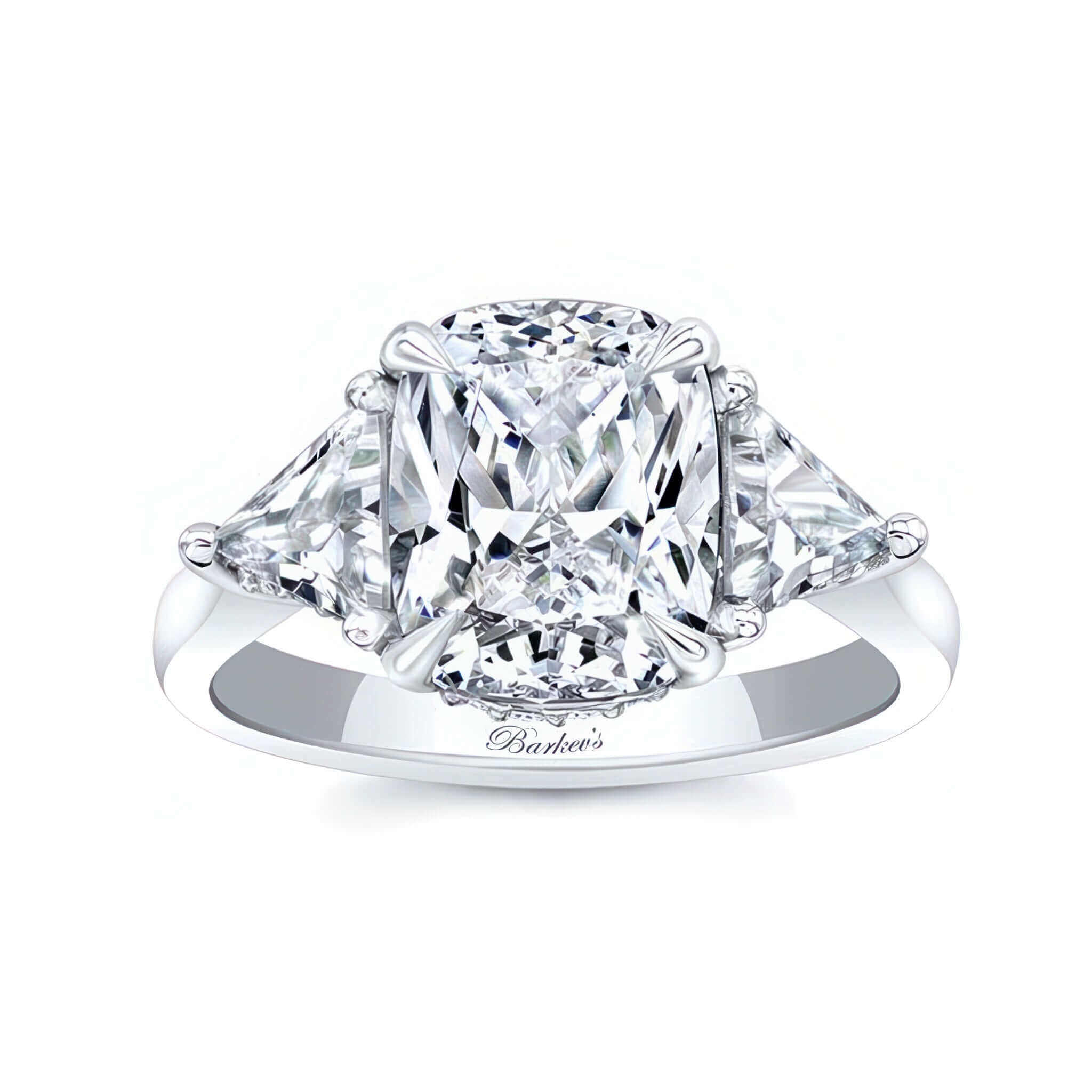 This stunning 3 carat cushion cut diamond ring features a three stone design with 2 trillion cut diamonds flanking a large prong set cushion cut center and a sprinkle of smaller diamonds underneath for a truly fabulous look.