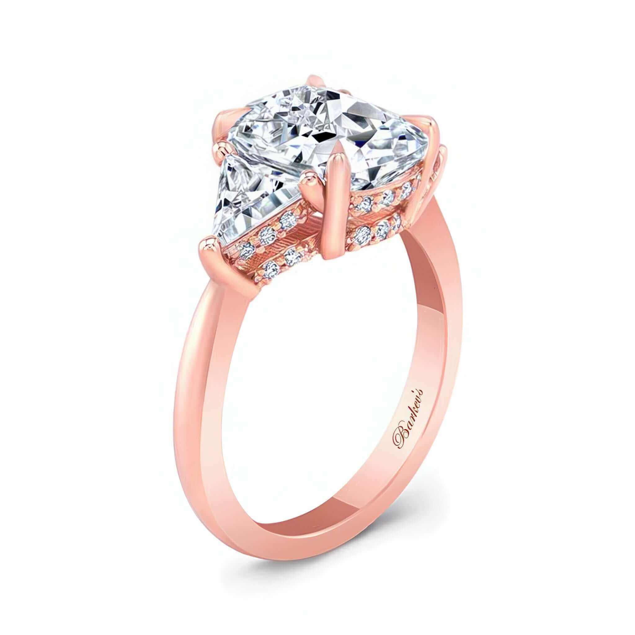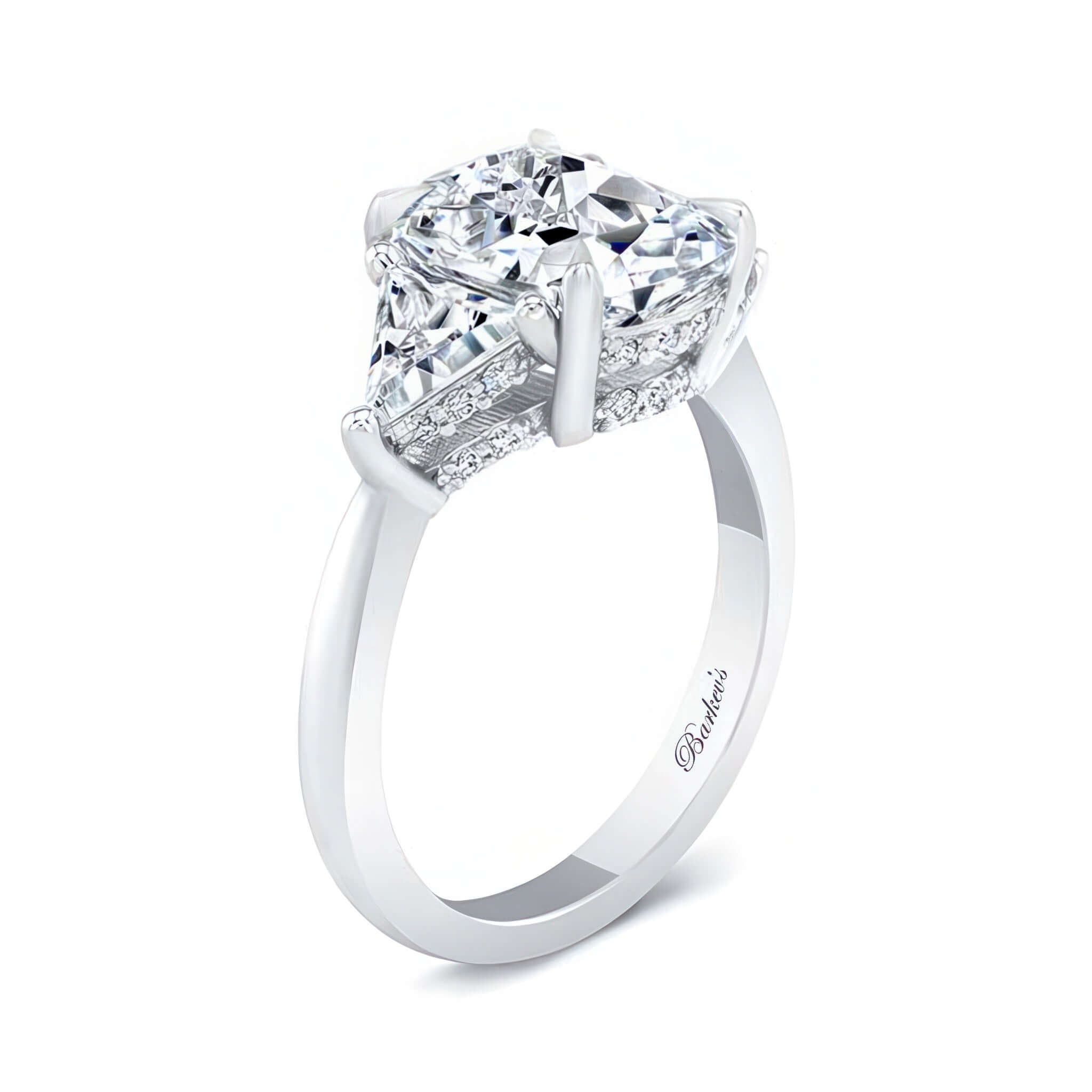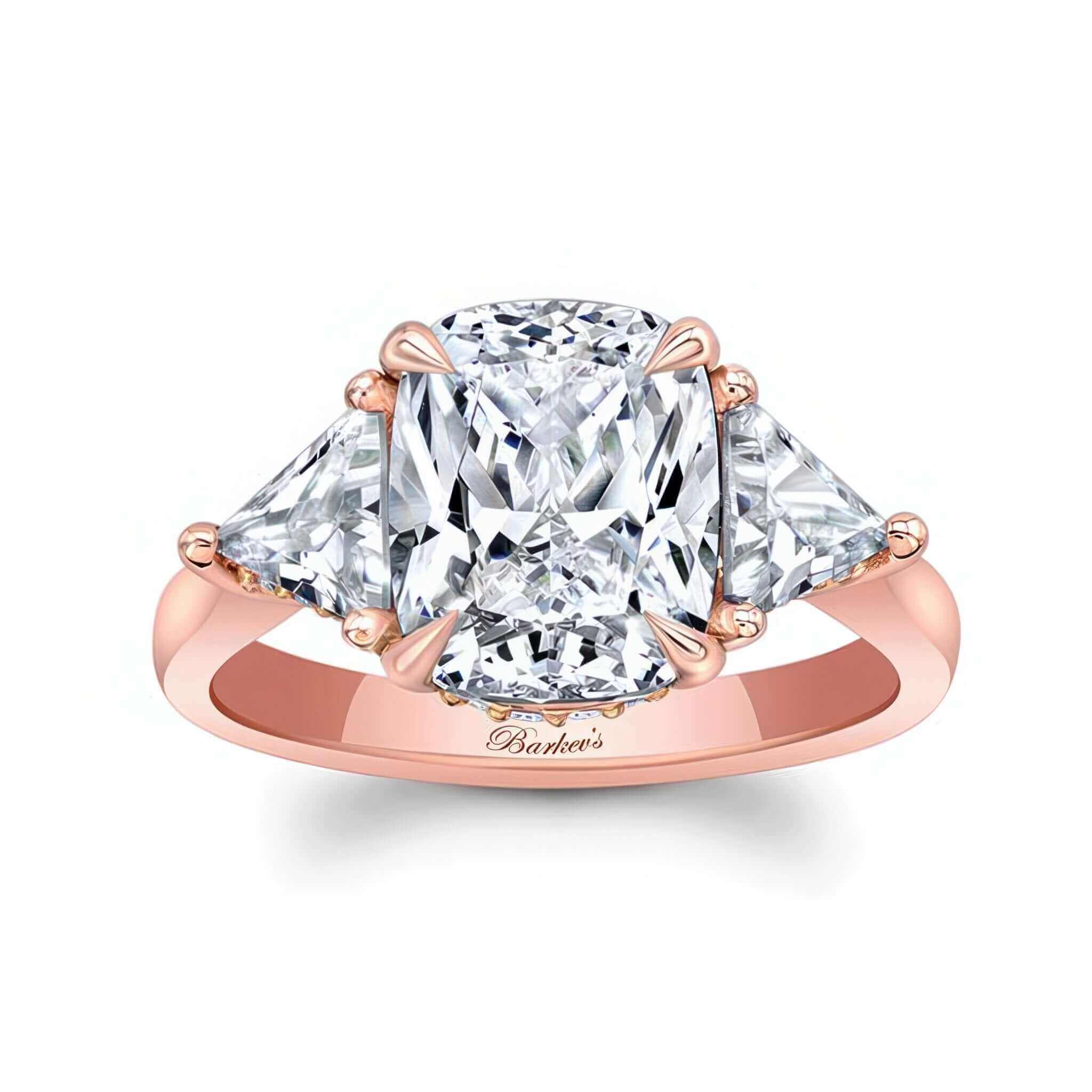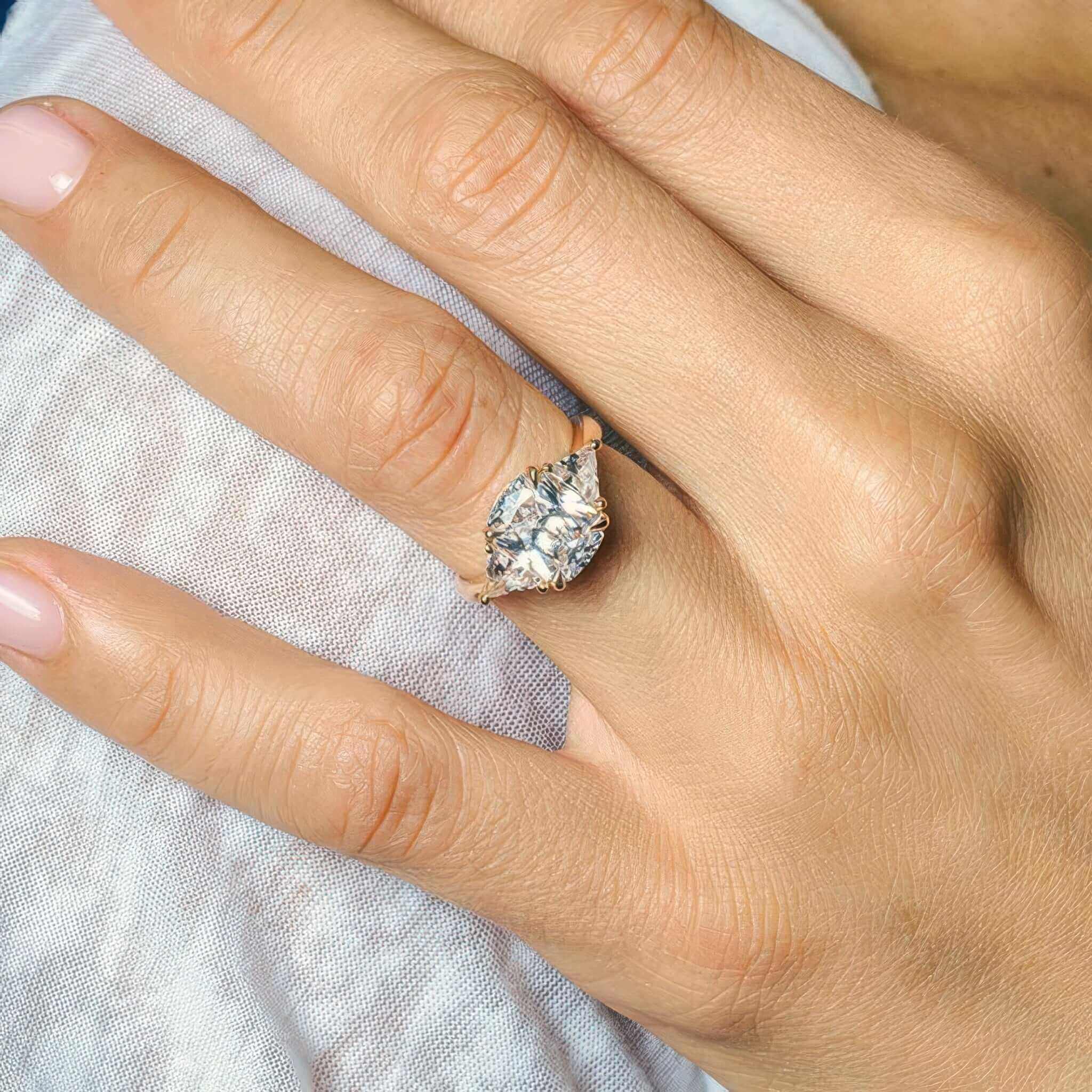 This stunning 3 carat cushion cut diamond ring features a three stone design with 2 trillion cut diamonds flanking a large prong set cushion cut center and a sprinkle of smaller diamonds underneath for a truly fabulous look.
