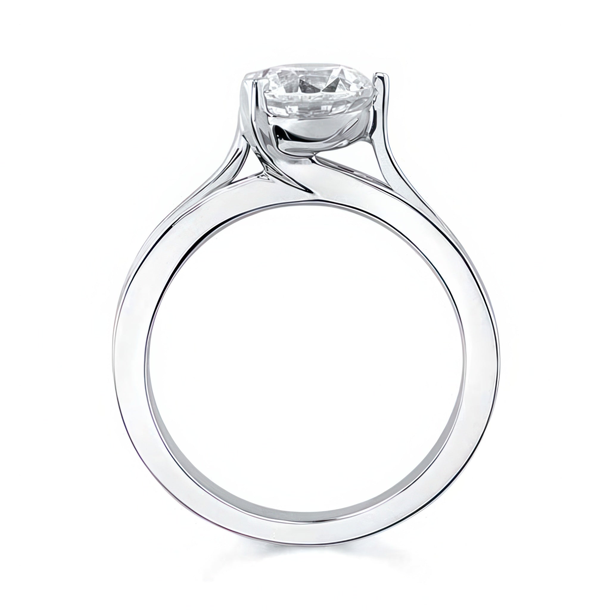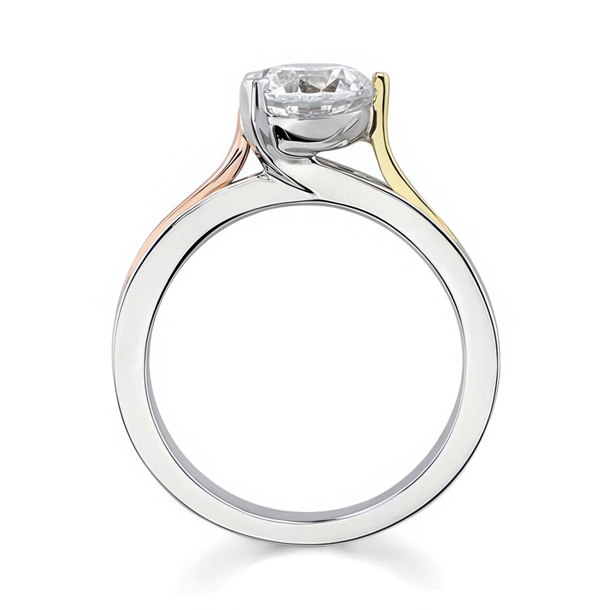 This 3 prong moissanite solitaire ring features a prong set round center with rising trims on the shank for a unique look.