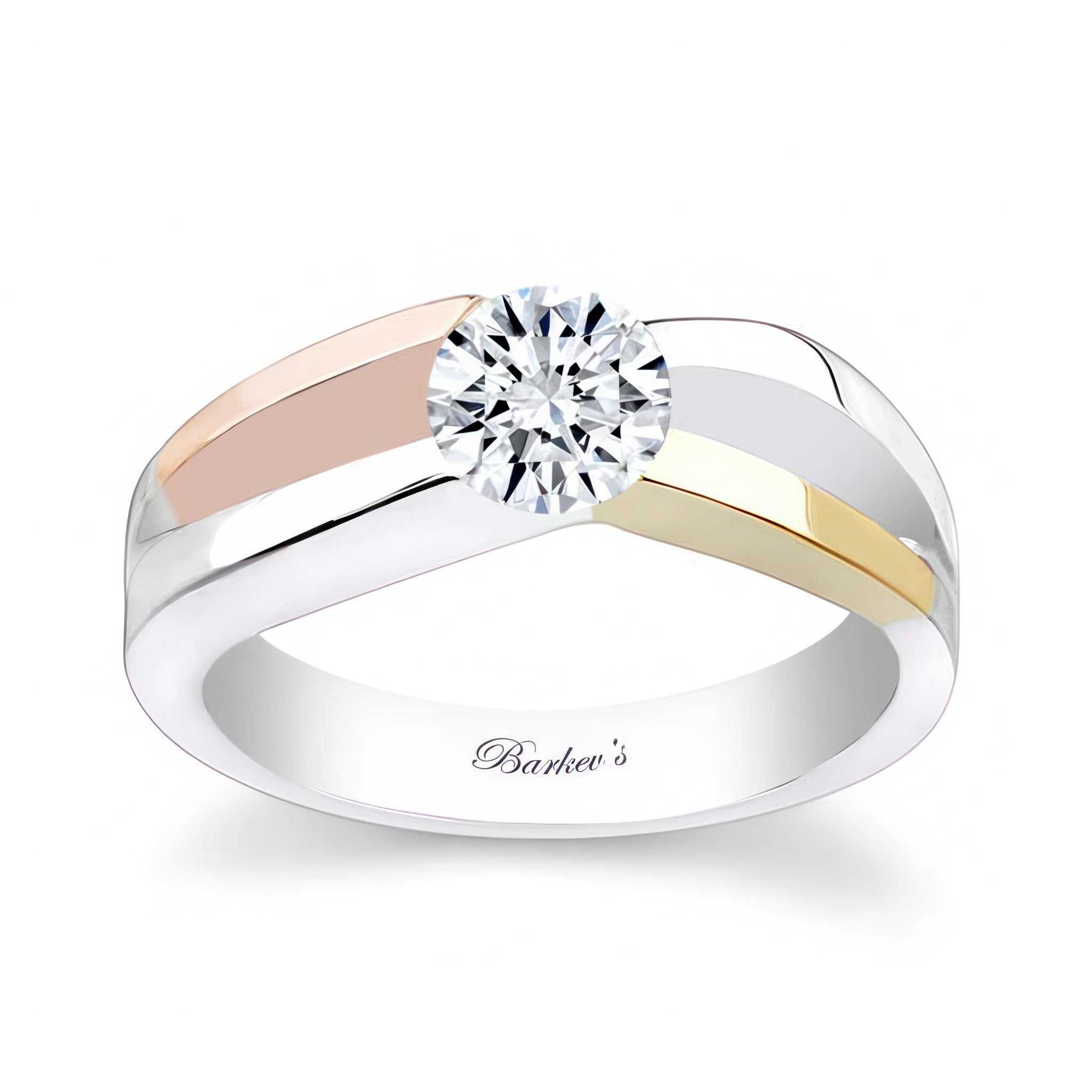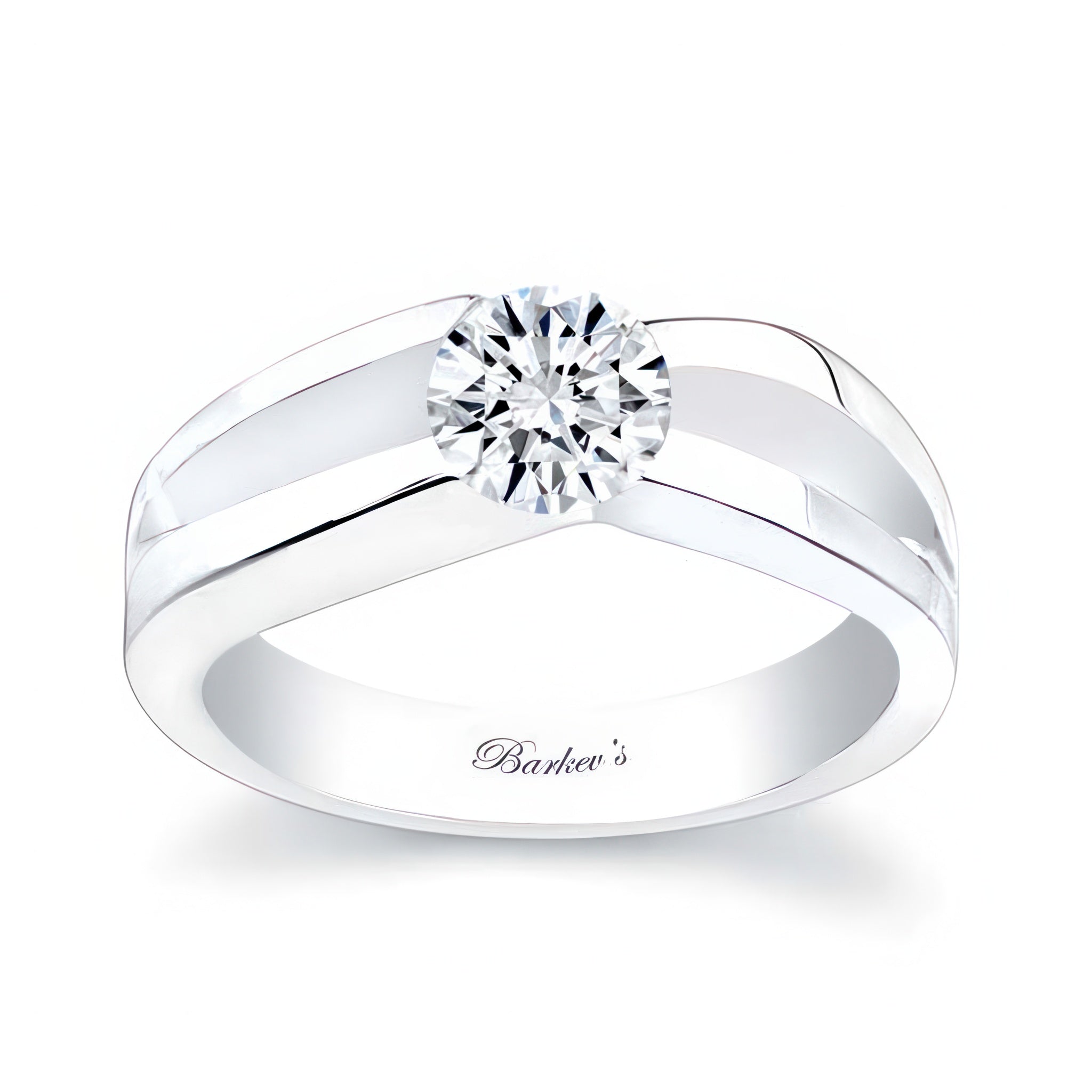This simple 1 carat moissanite split shank solitaire ring features a channel set round center with a polished split shank for an exotic look.