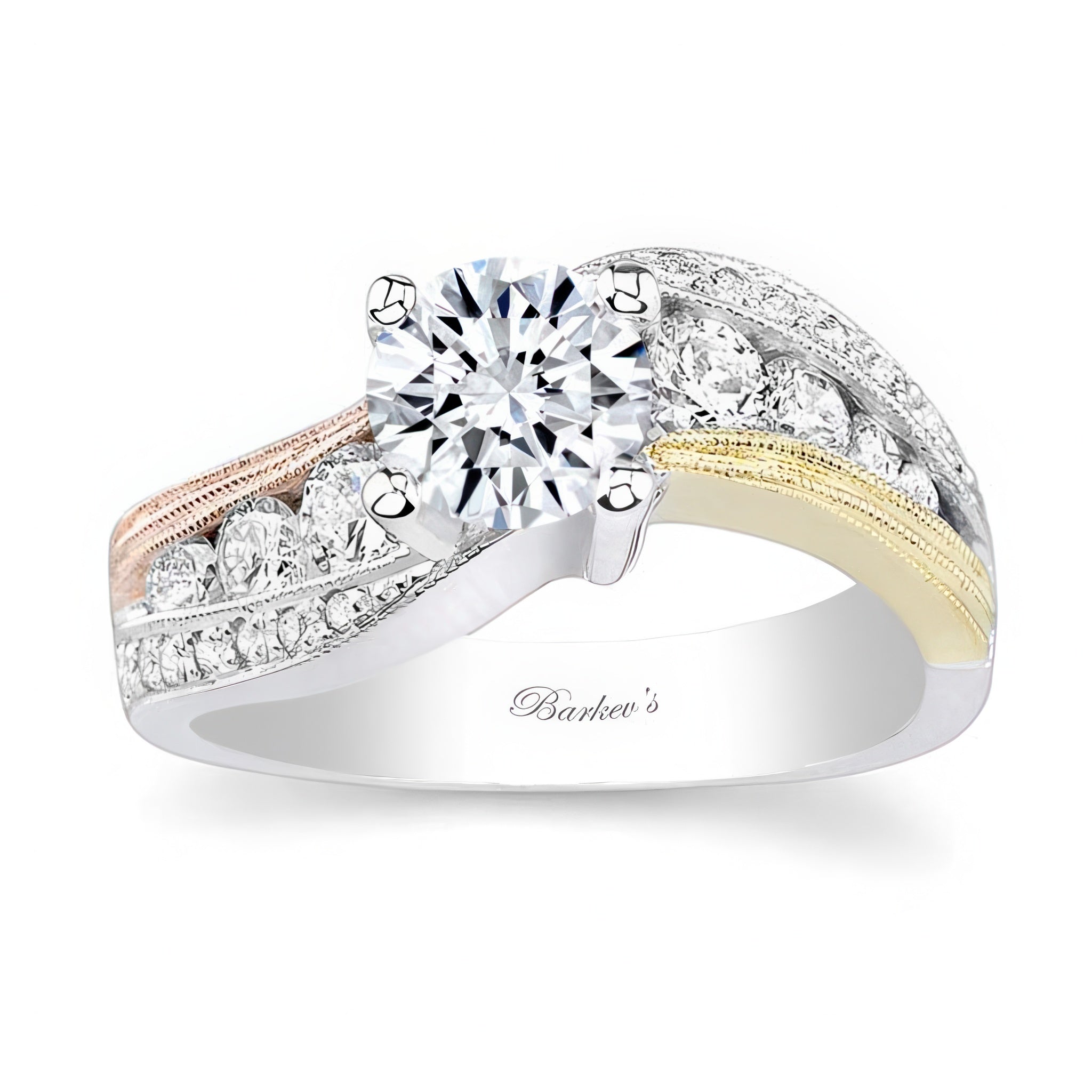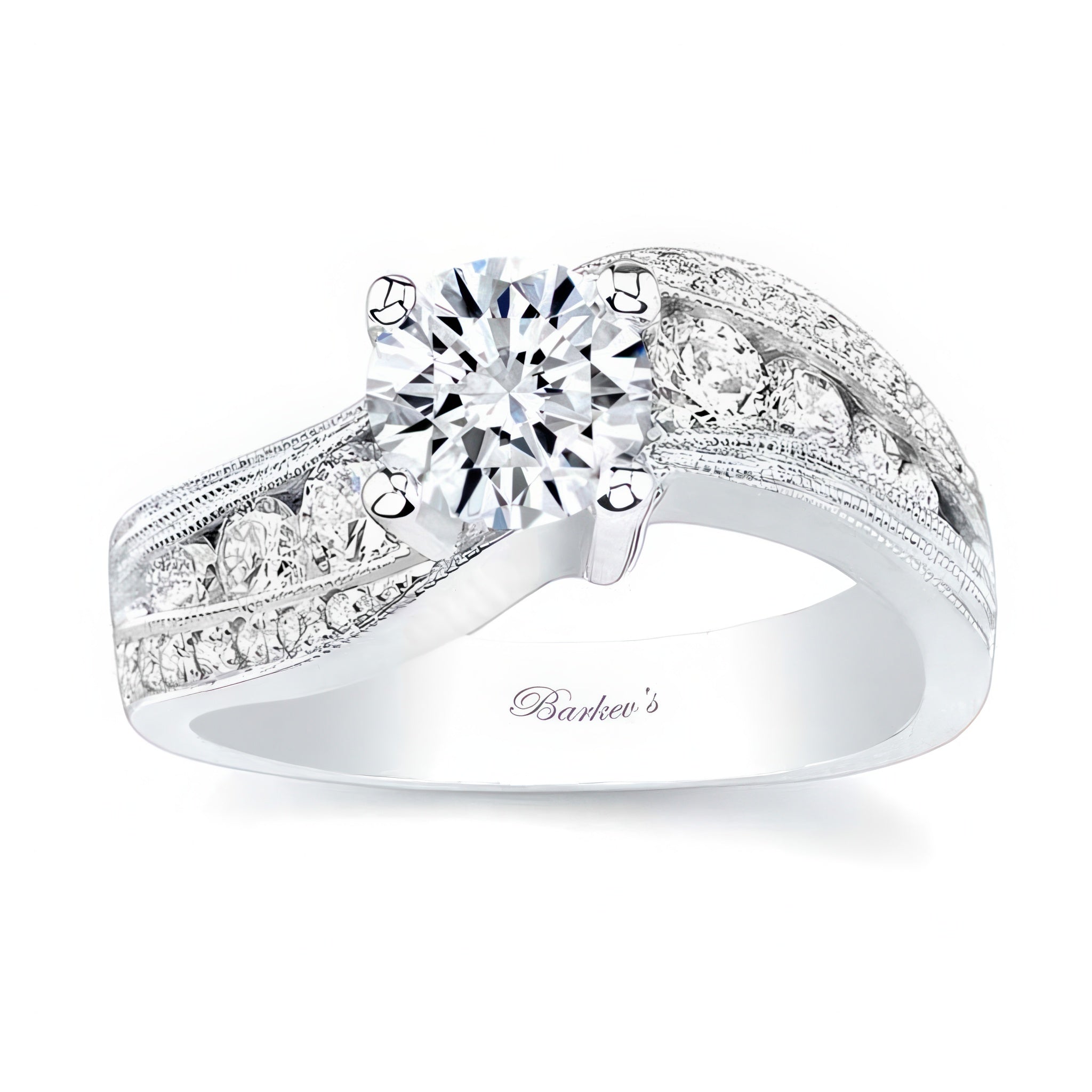 This wide curving moissanite engagement ring features a prong set round center with channel set diamonds and a milgrain finish to highlight the details.
